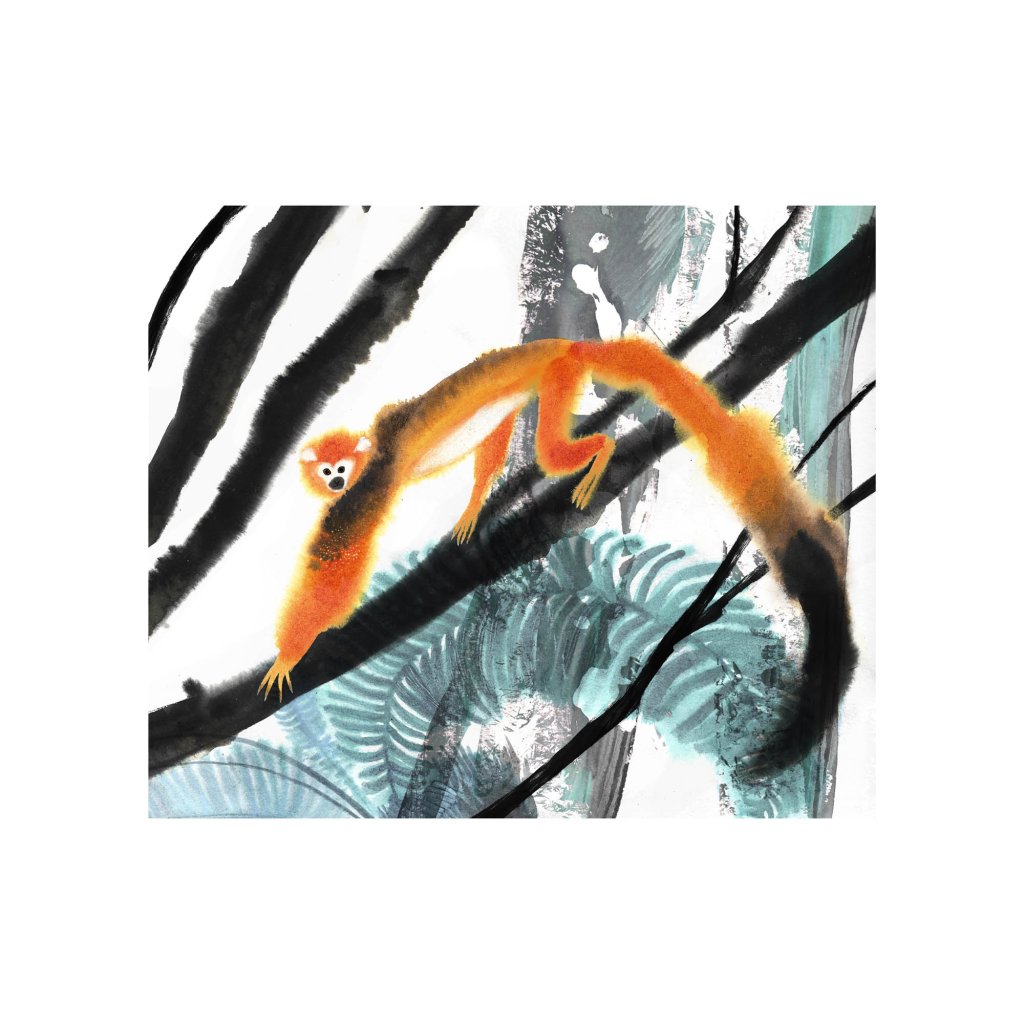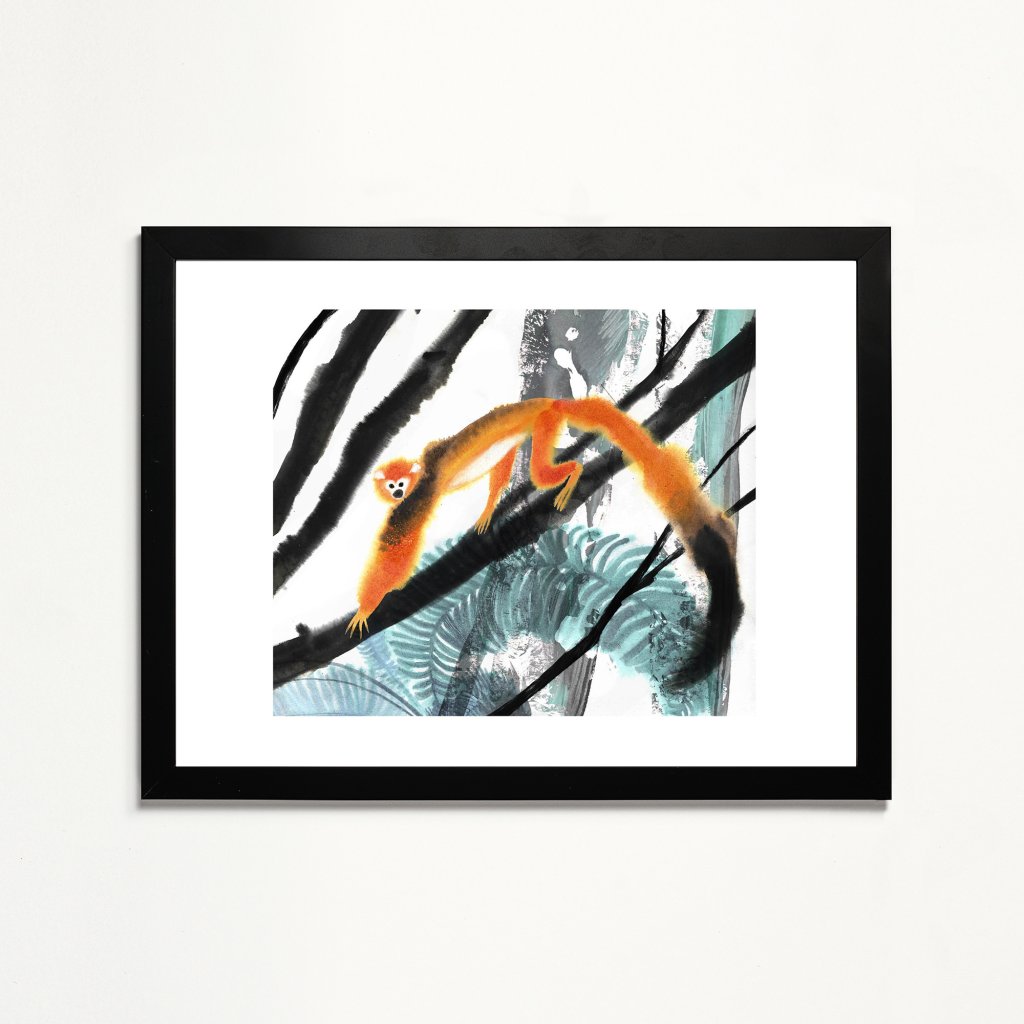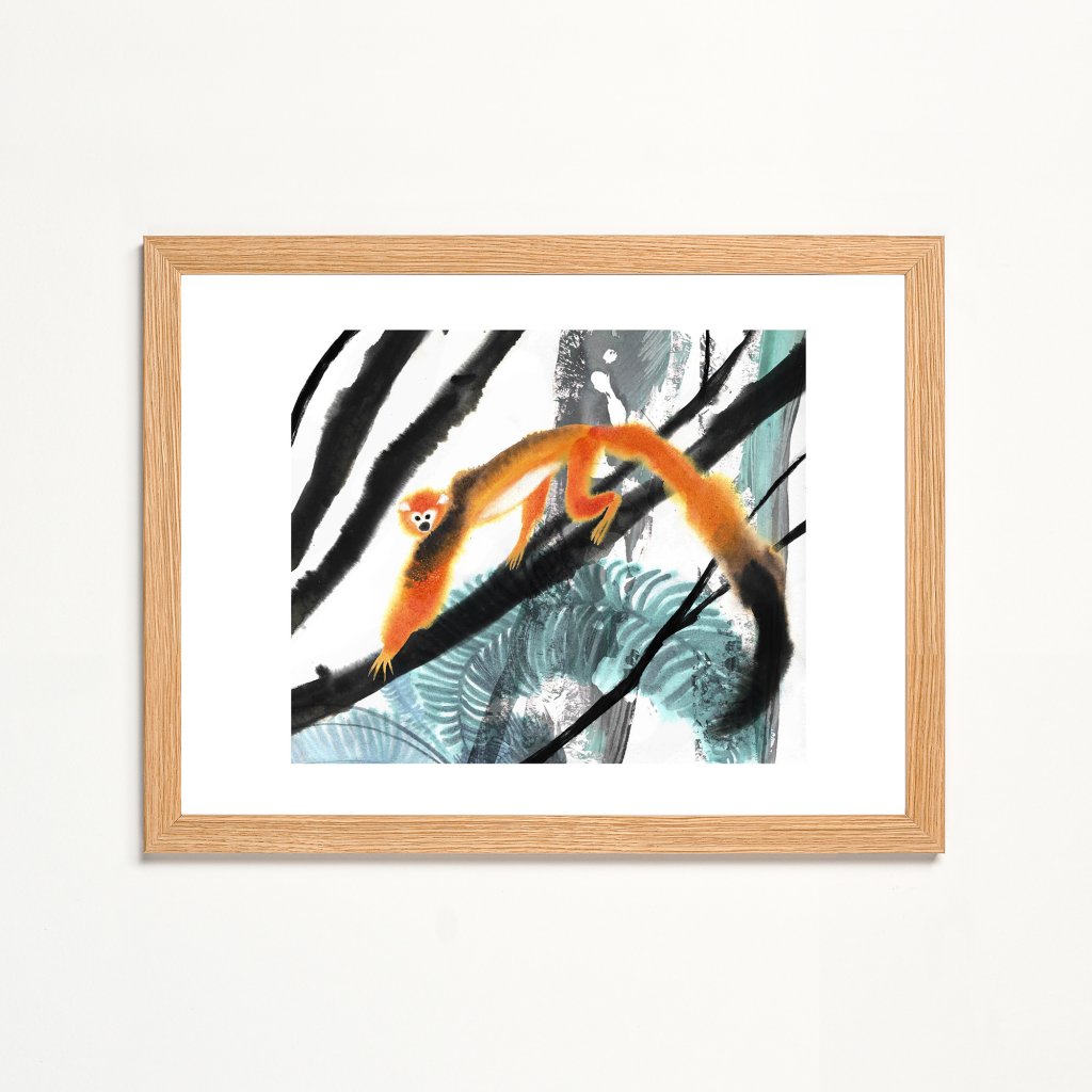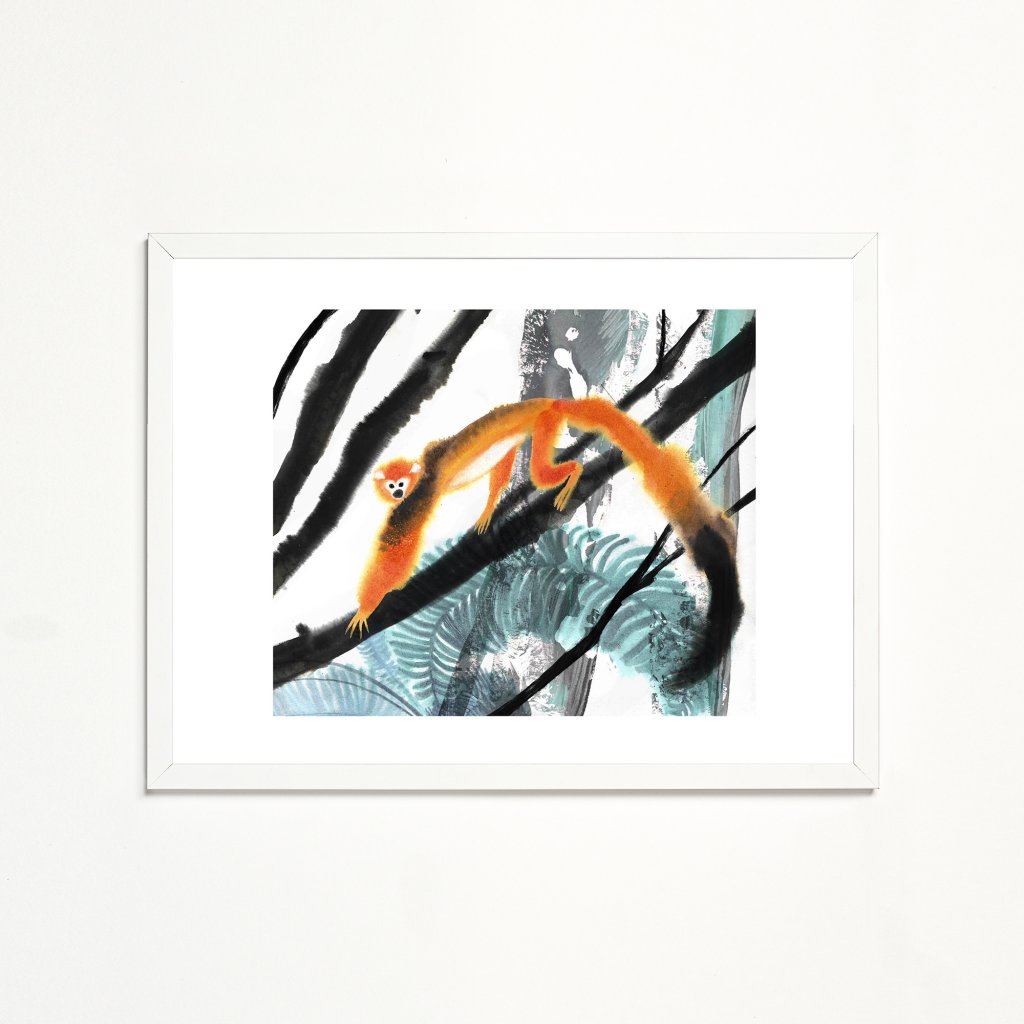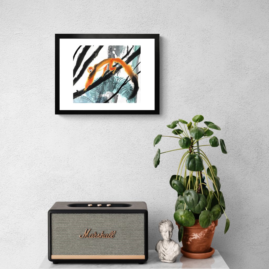 Ilustrace kombinuje expresivní tahy štětce s jemnou prací s texturou a kontrastem. Oranžová silueta opice vystupuje z černobílých linií větví a chladnějších zelených ploch, čímž vzniká živý dialog mezi klidem prostředí a hravou energií zvířete. Dílo působí spontánně a radostně, ale zároveň vyváženě, takže funguje jak v dětském pokoji, tak v moderním interiéru, který ocení lehký humor a nadhled.