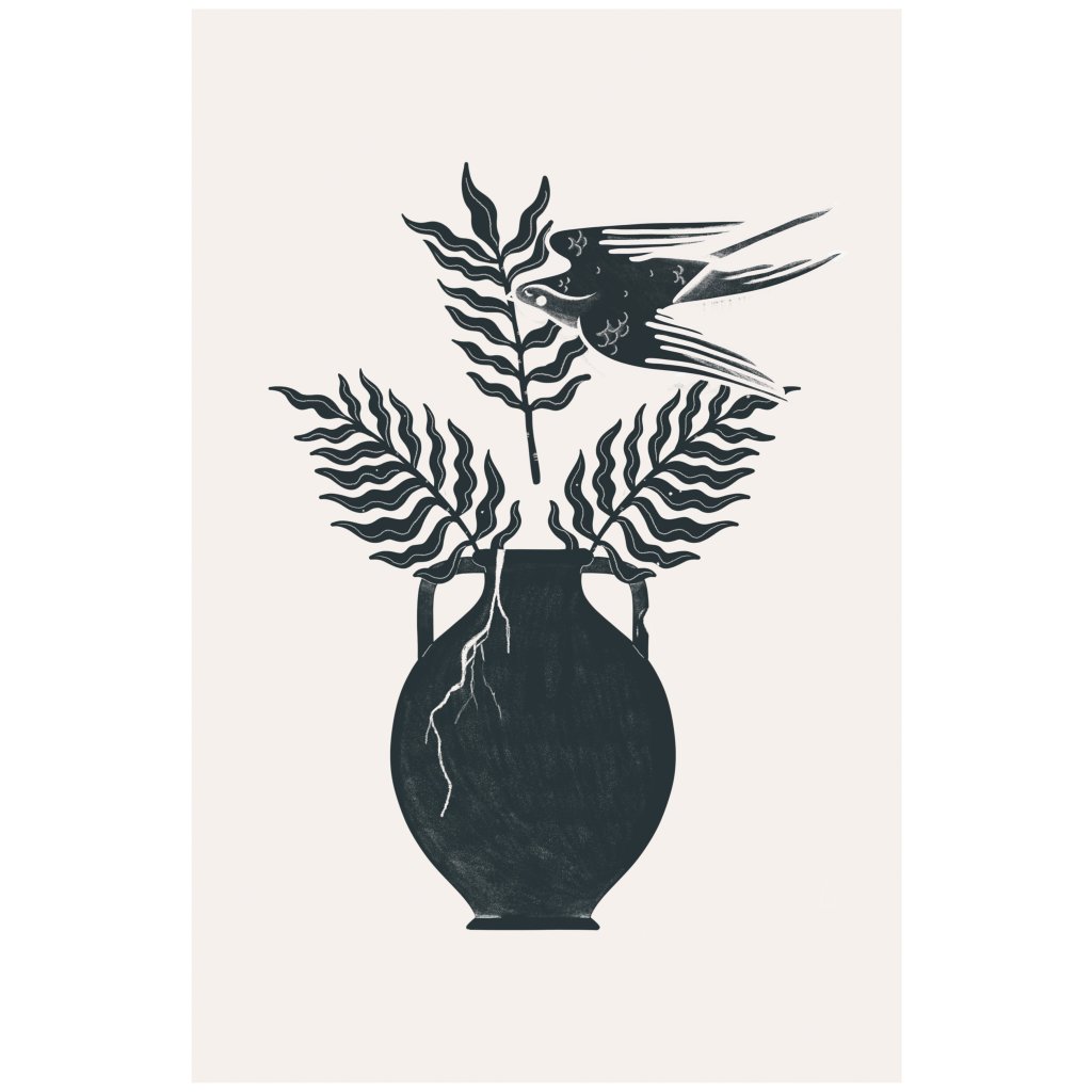Značně prasklá, klasická řecká amfora se třemi velkými listy, z nichž jeden už si přivlastnil drzý pták. Čisté linie a symetrie kompozice připomínají antickou keramiku, ale dynamika ptáka dodává moderní a hravý nádech. Neutrální pozadí nechává vyniknout detaily textur a tvarů. Ilustrace je jako metafora zvědavosti a svobody.