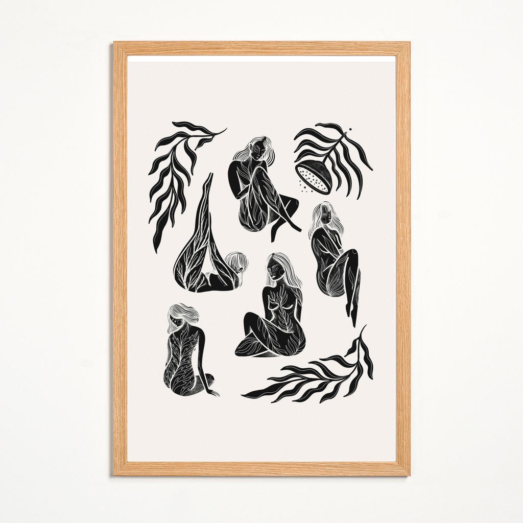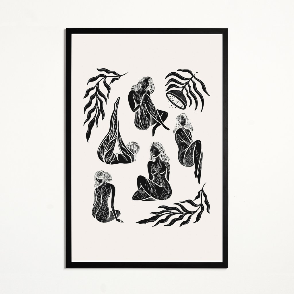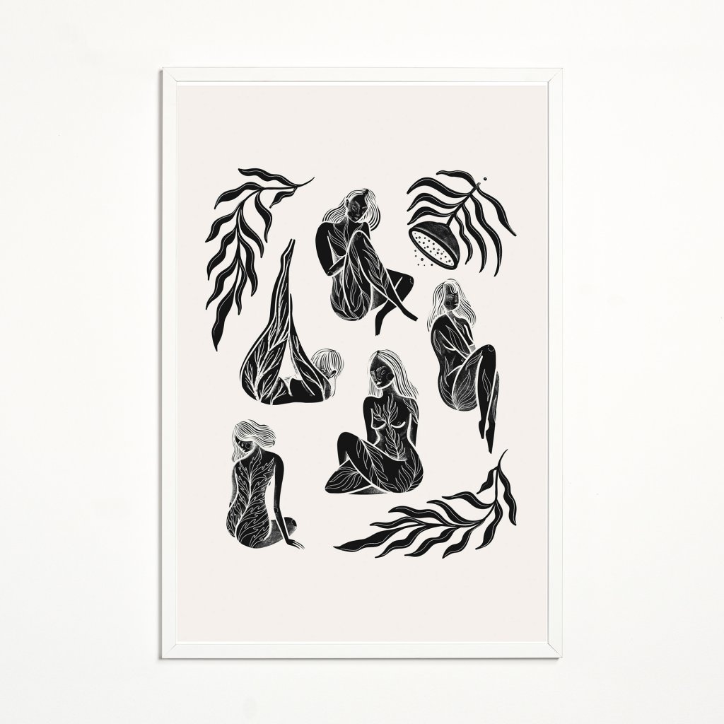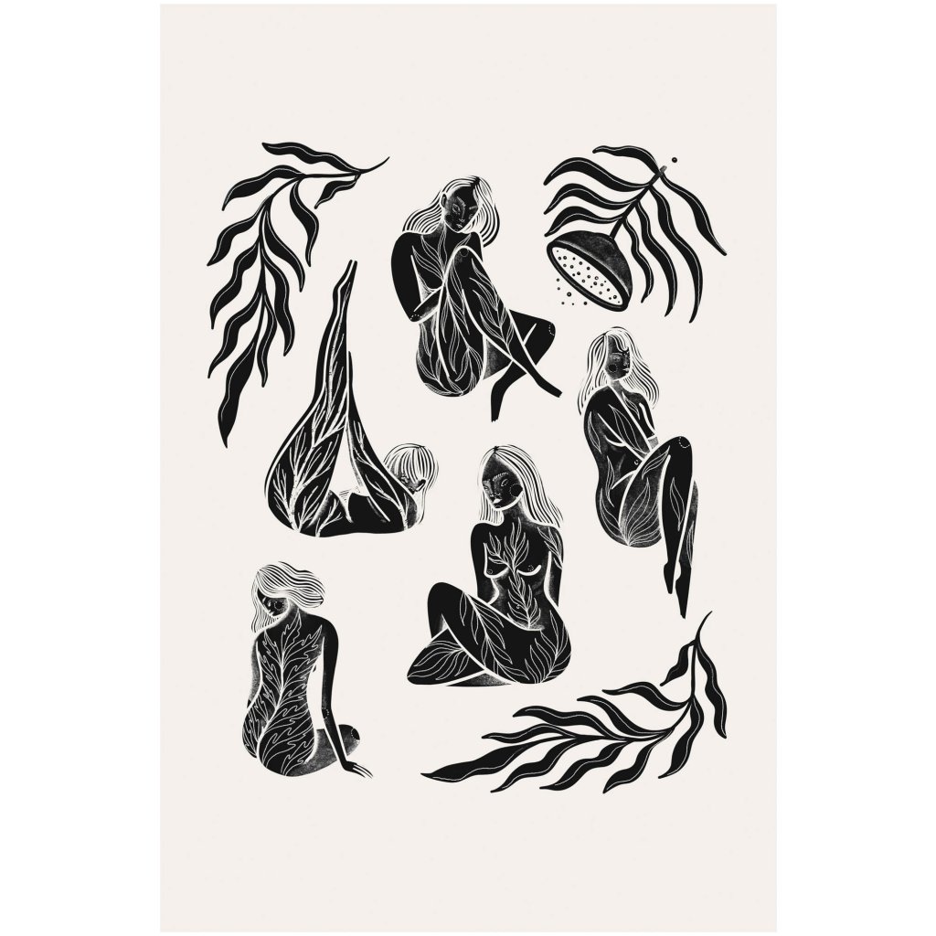Pět dynamických siluet nahých žen v jógových pózách ve společnosti vlnitých listů a květu, který dodává životní energii. Čistá linka bez stínů zdůrazňuje tvar těl, která jsou navíc pokreslena florálními motivy. Díky tomu ilustrace působí jako oslava svobody těla v harmonii s přírodou. Kompozice je volná a rytmická, s prostorem pro dýchání mezi figurami.