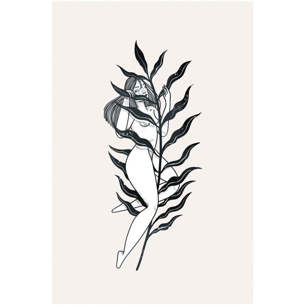 Nahá ženská postava je obepnutá štíhlými, vlnitými listy rostlin, jako v přírodním ochranném plášti. Čisté černé linie na neutrálním pozadí zdůrazňují elegantní křivky a organické tvary, čímž kompozice působí harmonicky a křehce. Motiv evokuje symbiózu ženské esence s přírodními silami, kde tělo není pouhým objektem, ale součástí většího celku. Ideální pro prostory, které chtějí podpořit pocit přítomnosti, klidu a přirozené krásy.