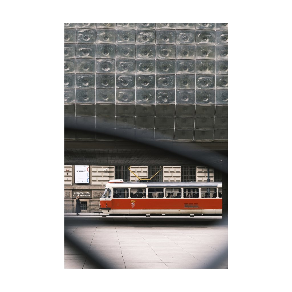 Fotografie pracuje s výraznou horizontální linií tramvaje a monumentálním popředím budovy Nové scény, čímž vytváří silný kontrast měřítka. Kompozice je vyvážená a přehledná, s důrazem na geometrii a strukturu. Hodí se do městských interiérů, kanceláří nebo prostor s industriálním charakterem.