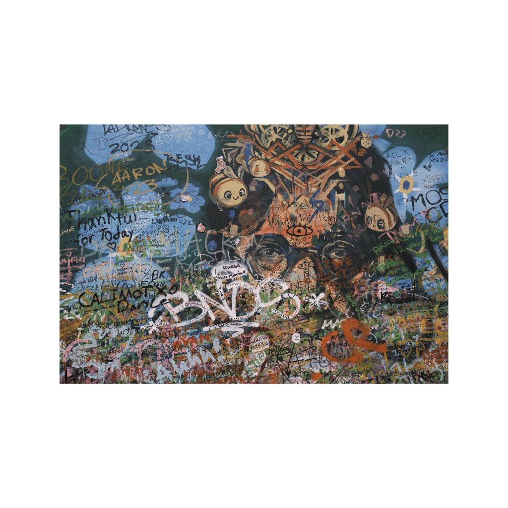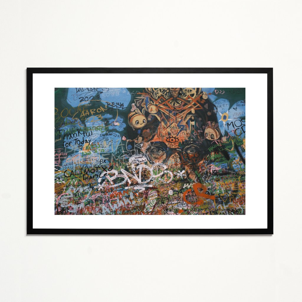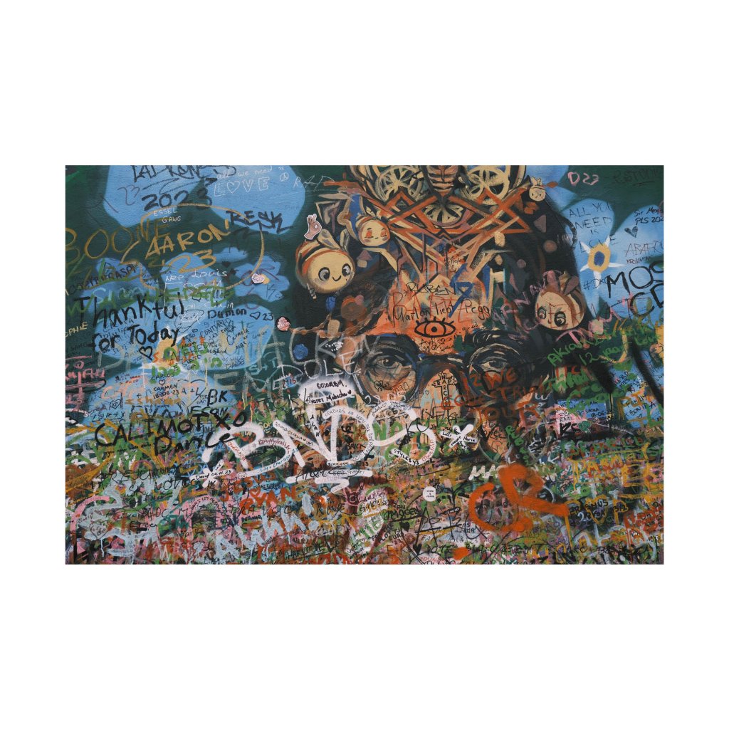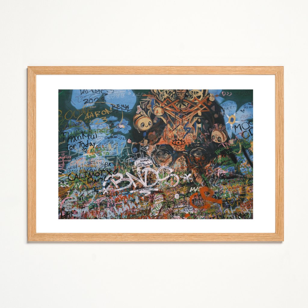 Fotka výřezu Lennonovy zdi, kde vidíme pro ni typickou koláž graffiti, kreseb a nápisů, v níž se ztrácí hranice mezi jednotlivými vrstvami. Dominantní lidský pohled uprostřed kompozice propojuje osobní a kolektivní rovinu sdělení. Dílo je energické, syrově a současné, hodí se do moderních interiérů, galerií nebo kreativních pracovních prostor.