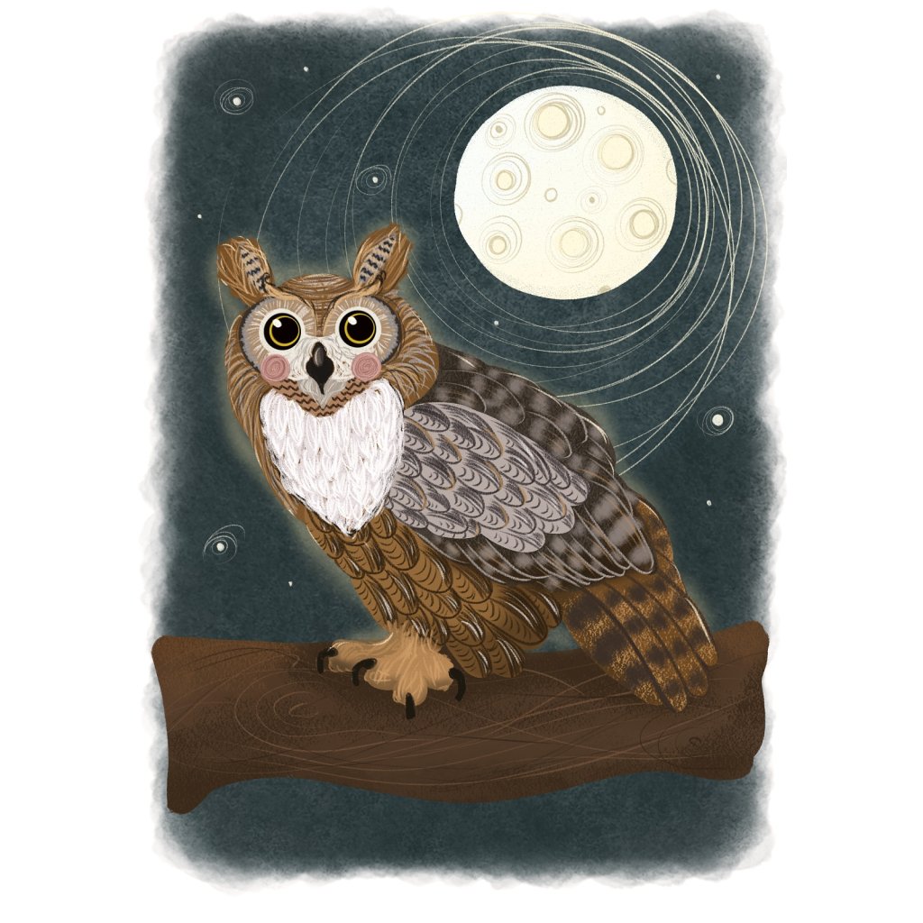 Sova sedící na větvi je zasazena do noční scény s měsícem a jemnými kruhovými liniemi evokujícími pohyb a čas. Barevnost je tlumená, převážně v modrých a hnědých tónech, což posiluje atmosféru klidu a rozjímání. Styl je detailní, ale stále měkký a přístupný. Hodí se do pracoven, knihoven, dětských pokojů i prostor určených ke zklidnění mysli.
