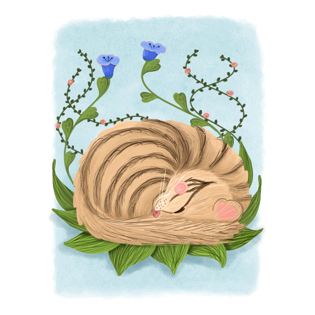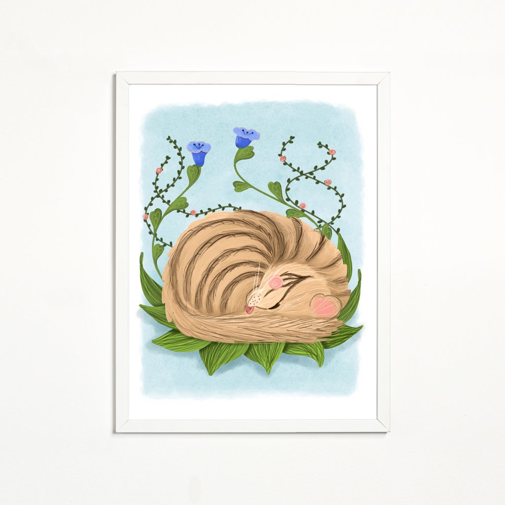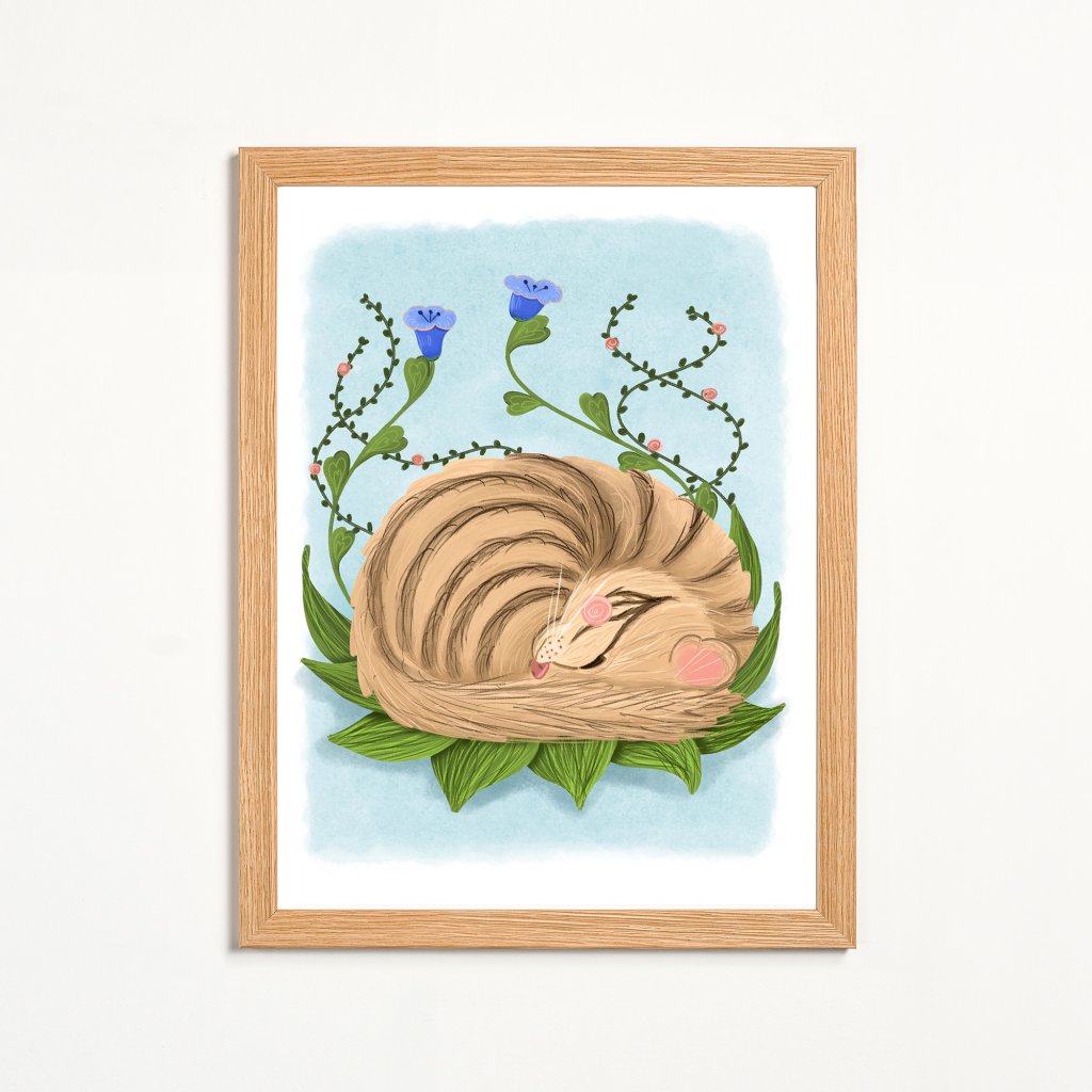 Ilustrace zobrazuje kočku stočenou do klubíčka, chráněnou listy a jemnými rostlinami, které ji obklopují jako přirozený úkryt. Styl je jemně pohádkový, s přírodní barevností a ruční kresbou. Atmosféra díla působí klidně, melancholicky a lehce zasněně. Hodí se do interiérů, kde má obraz především zkliďnovat – třeba do ložnic, čtecích koutů nebo dětských pokojů.