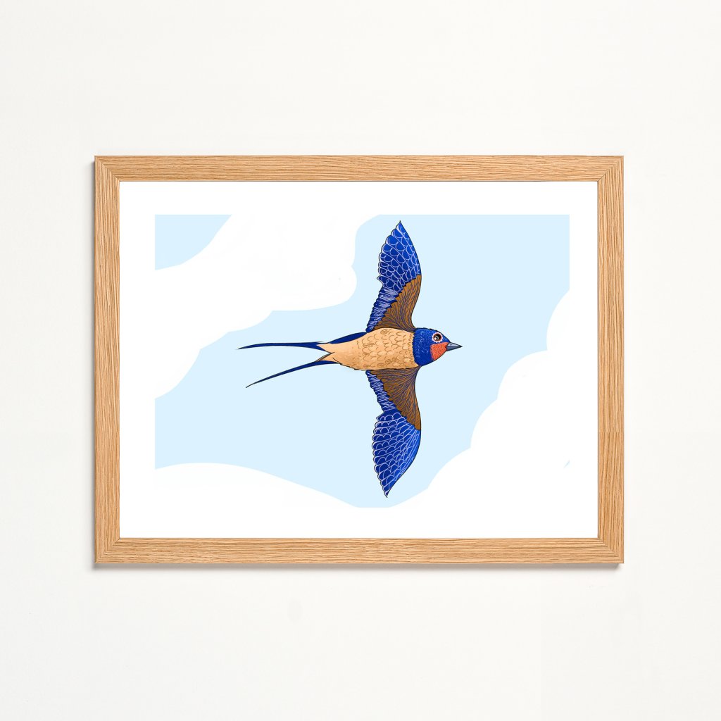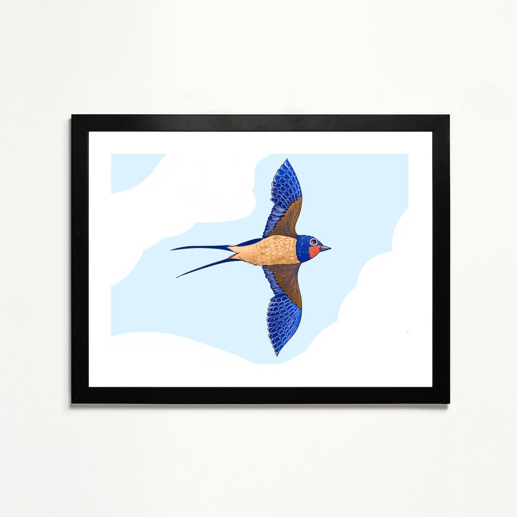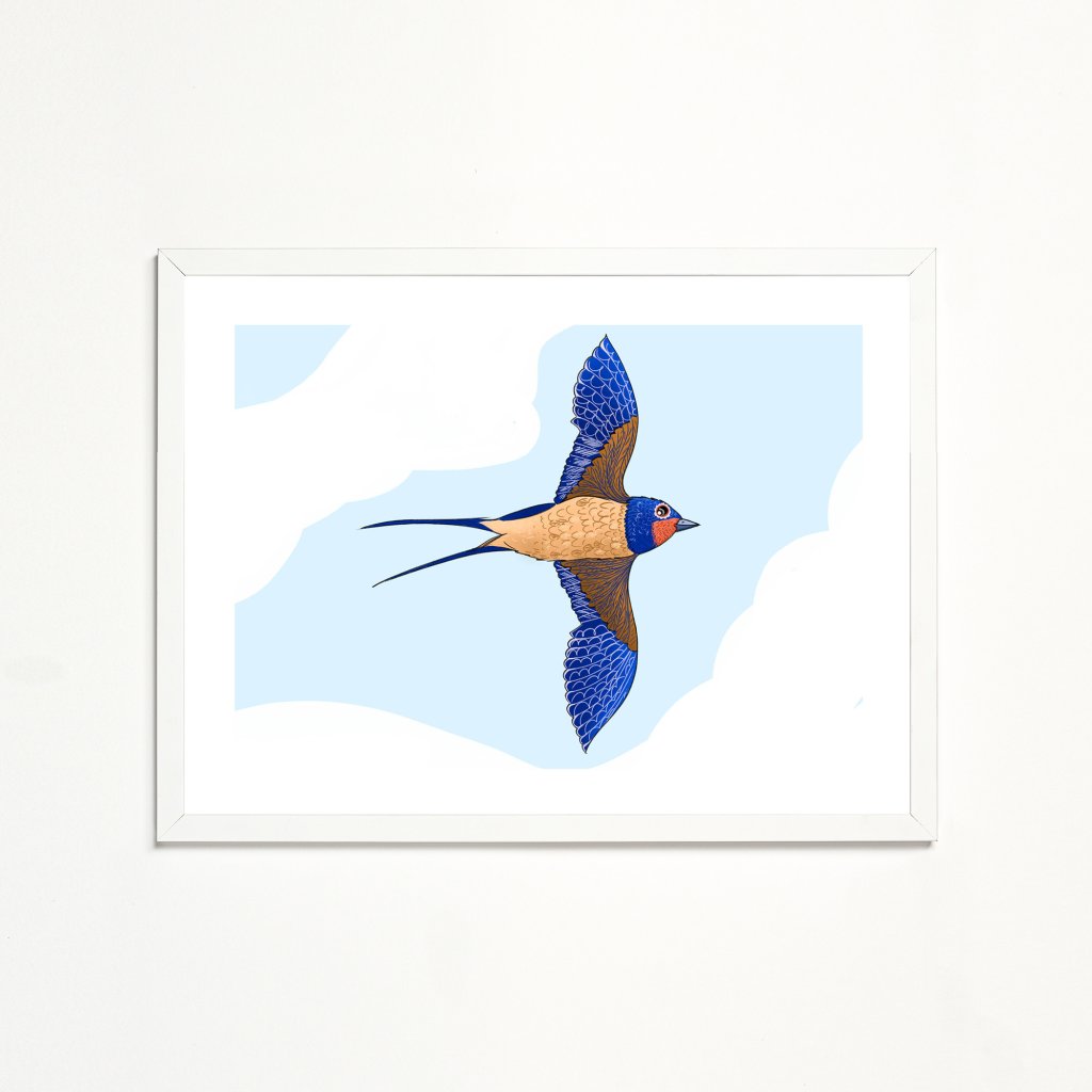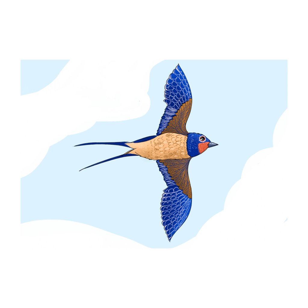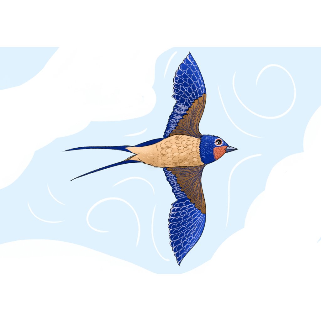 Ilustrace zachycuje vlaštovku s roztaženými křídly na světlém, vzdušném pozadí s jemnými liniemi naznačujícími pohyb vzduchu. Barevná kombinace modré, béžové a hnědé působí svěže a vyváženě. Styl je čistý, ilustrativní a lehce dekorativní. Obraz se hodí do moderních interiérů, dětských pokojů i prostor, kde má podpořit pocit volnosti a optimismu.