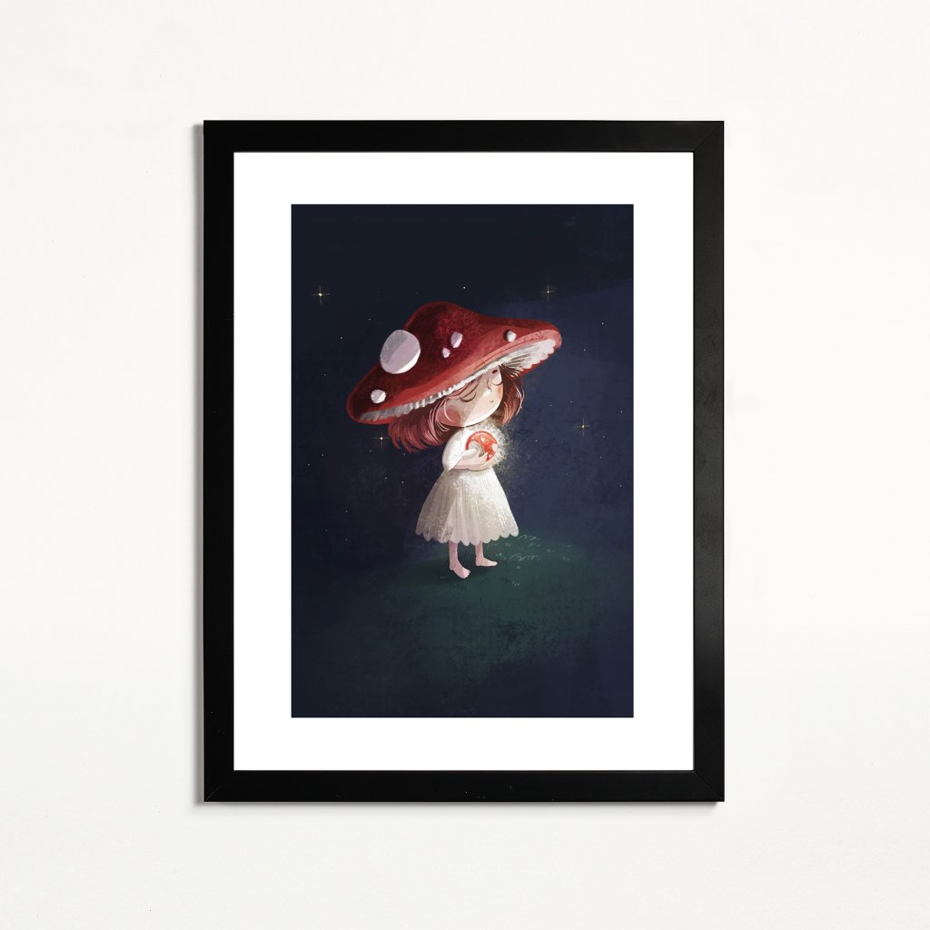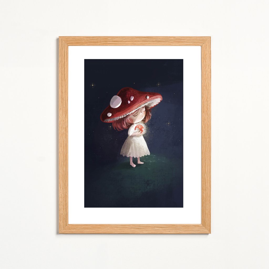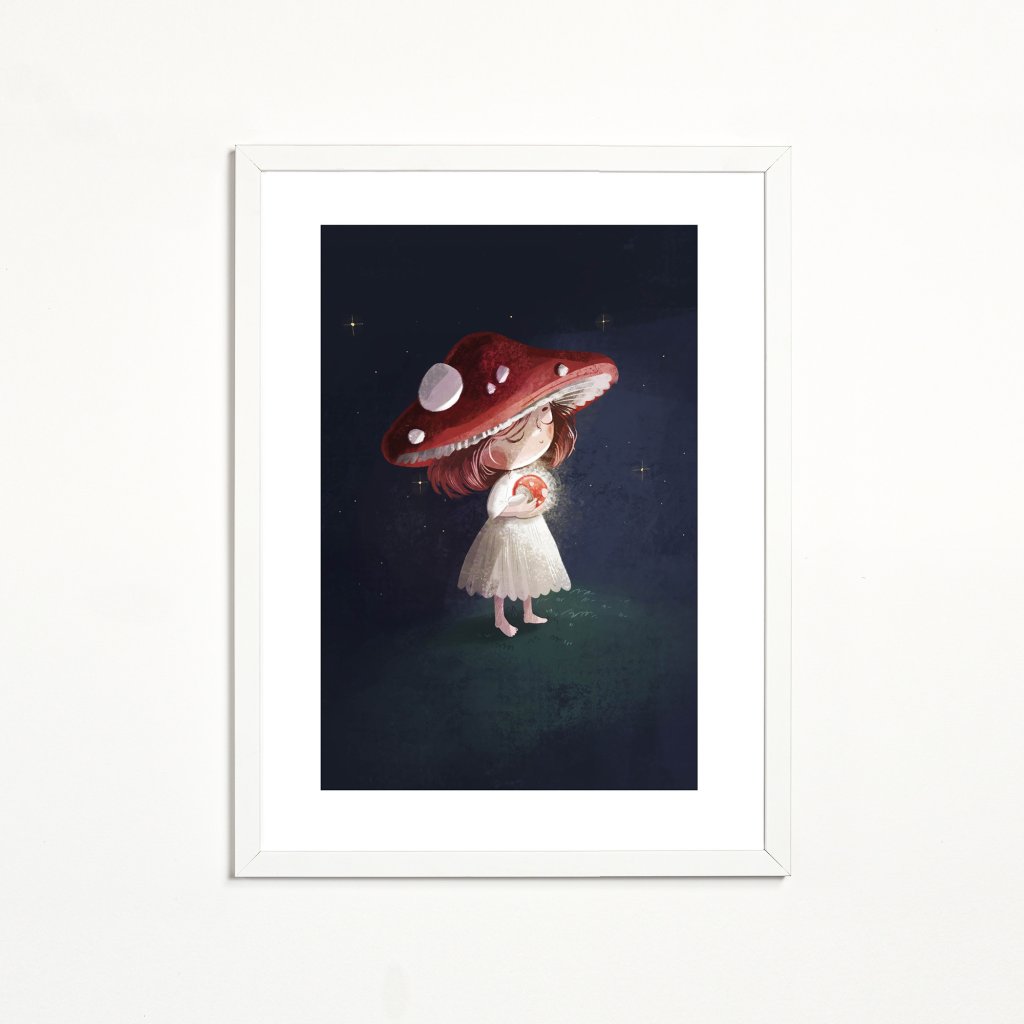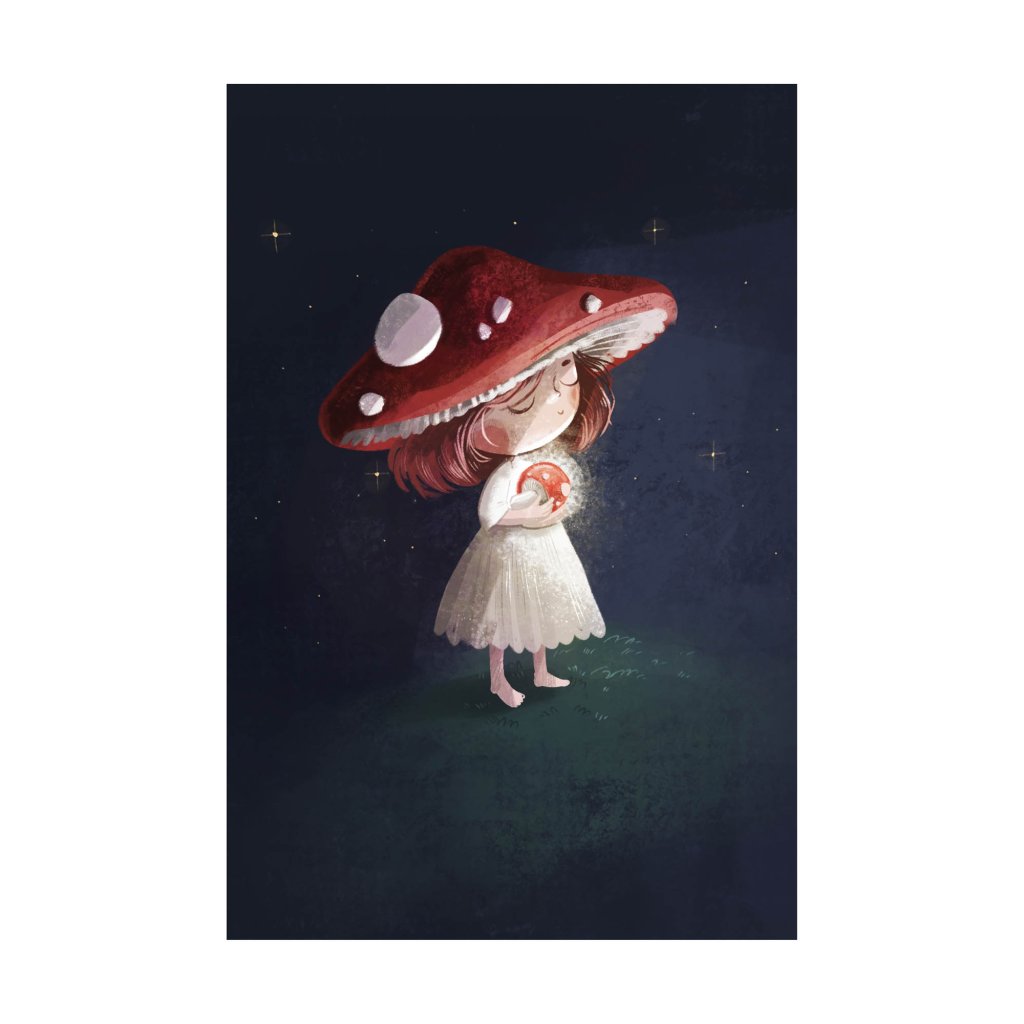 Ilustrace jemné symboliky a klidné kompozice. Dívka s muchomůrkou se stává součástí tichého, nočního světa. Barevnost je tlumená, s důrazem na kontrast červené a tmavého pozadí, což posiluje pocit tajemství. Dílo dává dojem moderní pohádky, která nechává značný prostor vlastní interpretaci. Výborně doplní ložnice, kouty na čtení a místa, kde chcete zkrátka zpomalit a nechat pracovat fantazii.
