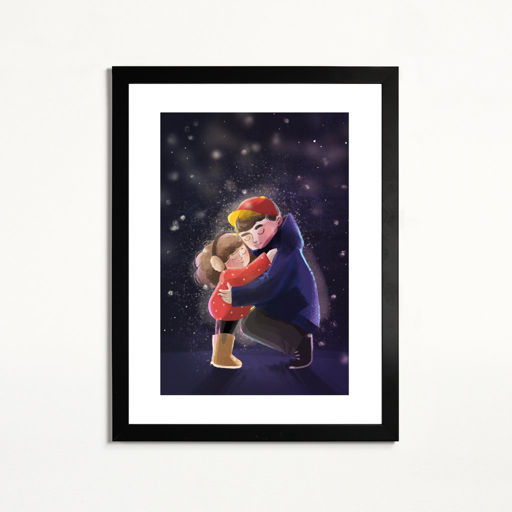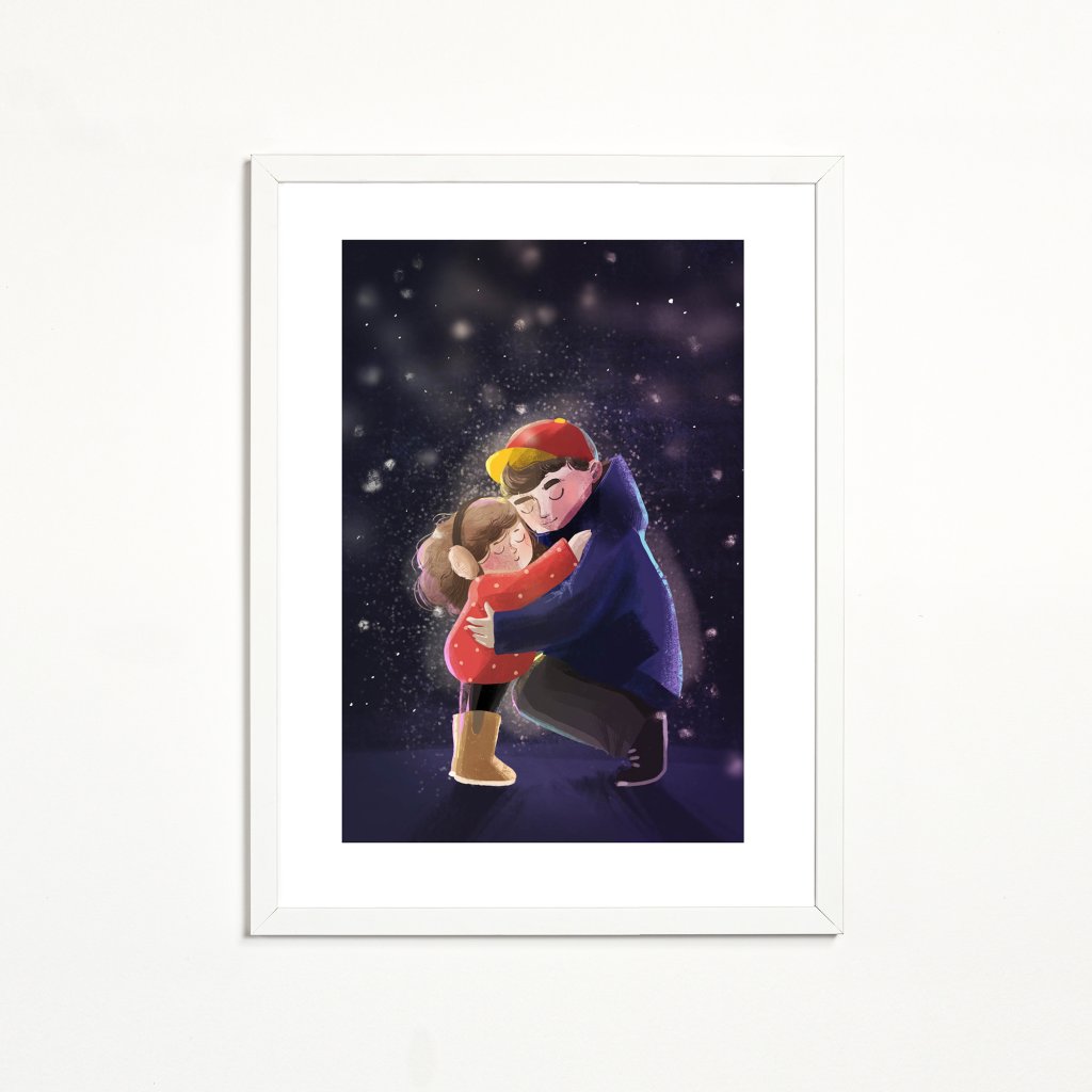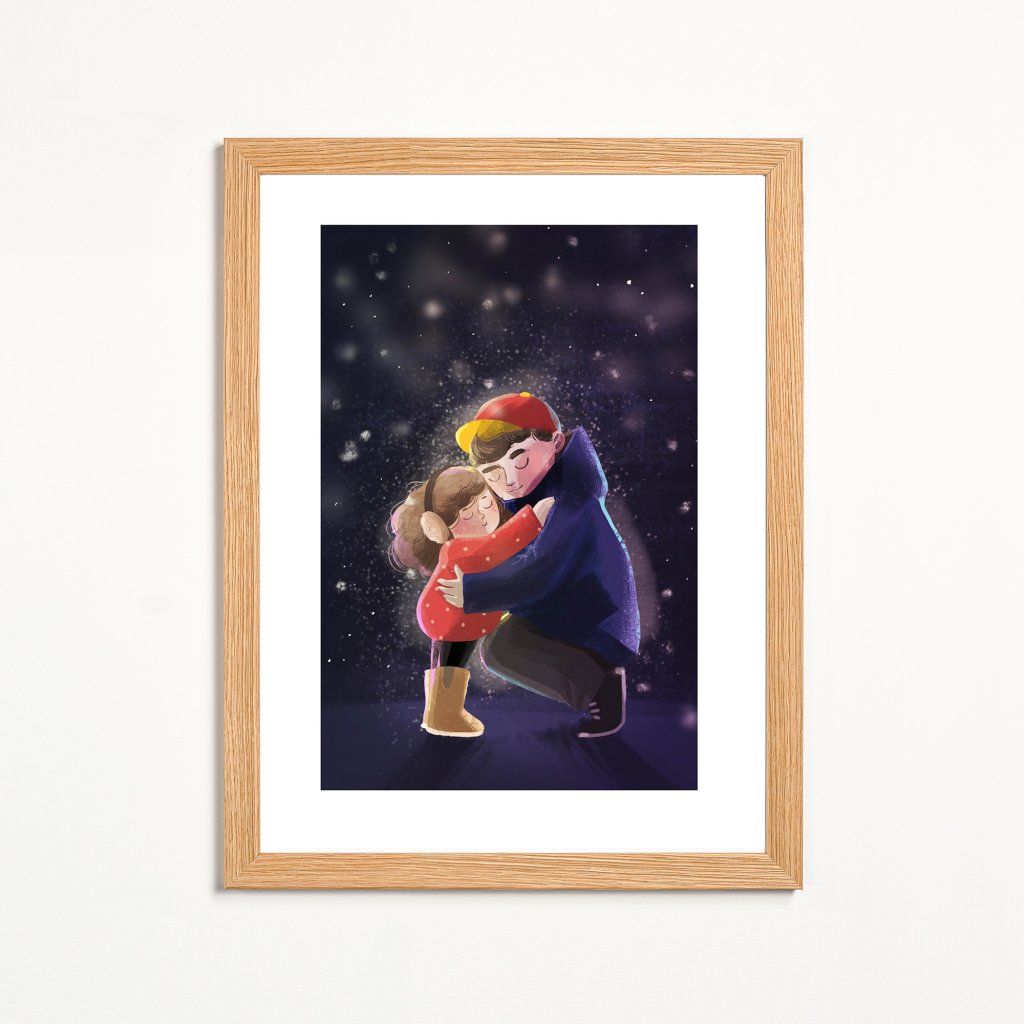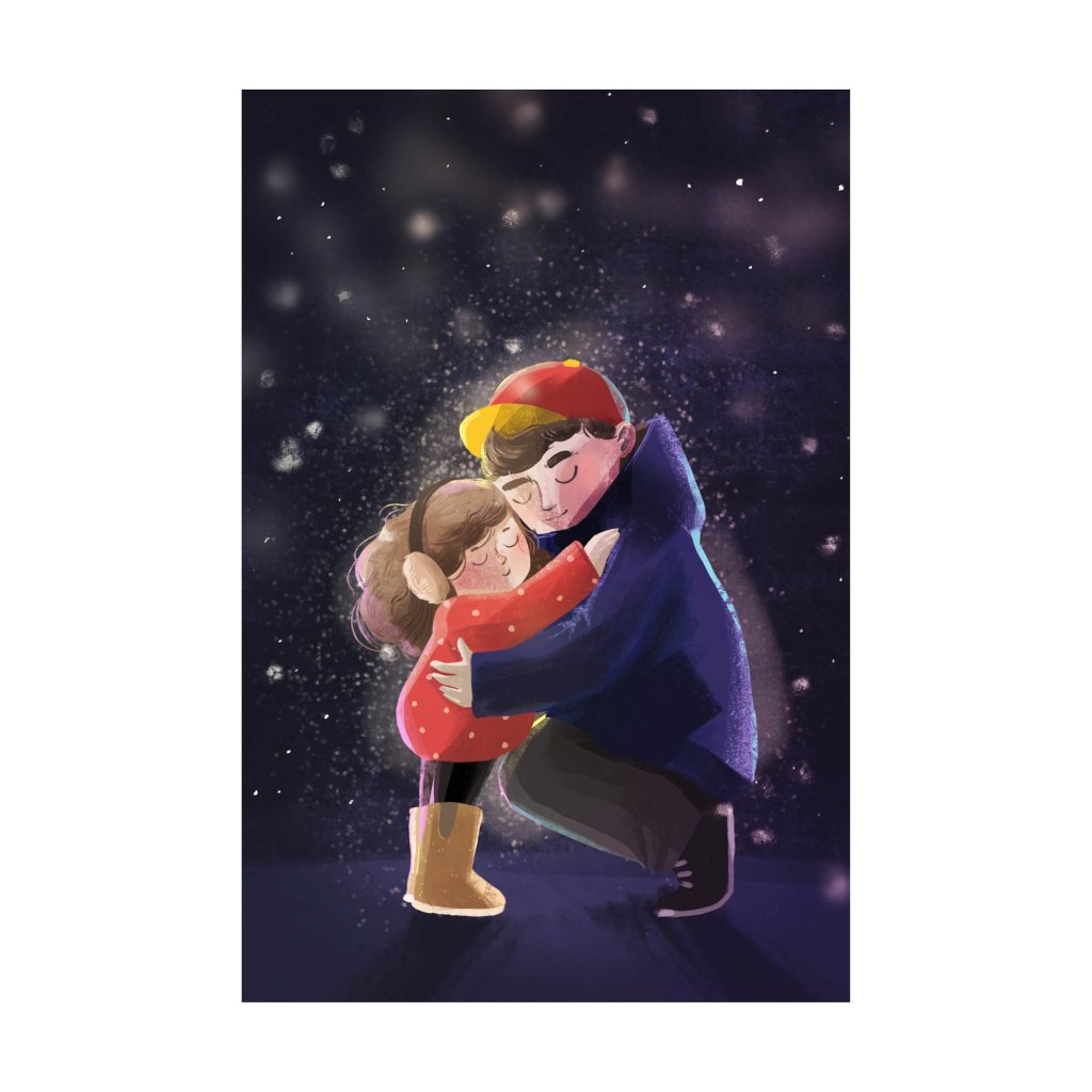 Intimní a důležitý moment mezi rodičem a dítětem v tlumené atmosféře zimního večera. Styl s jemnou texturou a měkkým světlem podporuje pocit klidu a bezpečí. Scéna je jednoduchá, ale silná ve svém sdělení, které nám připomíná hodnotu blízkosti a přítomnosti. Vhodné do rodinných prostor, ložnic nebo veřejných dětských míst.