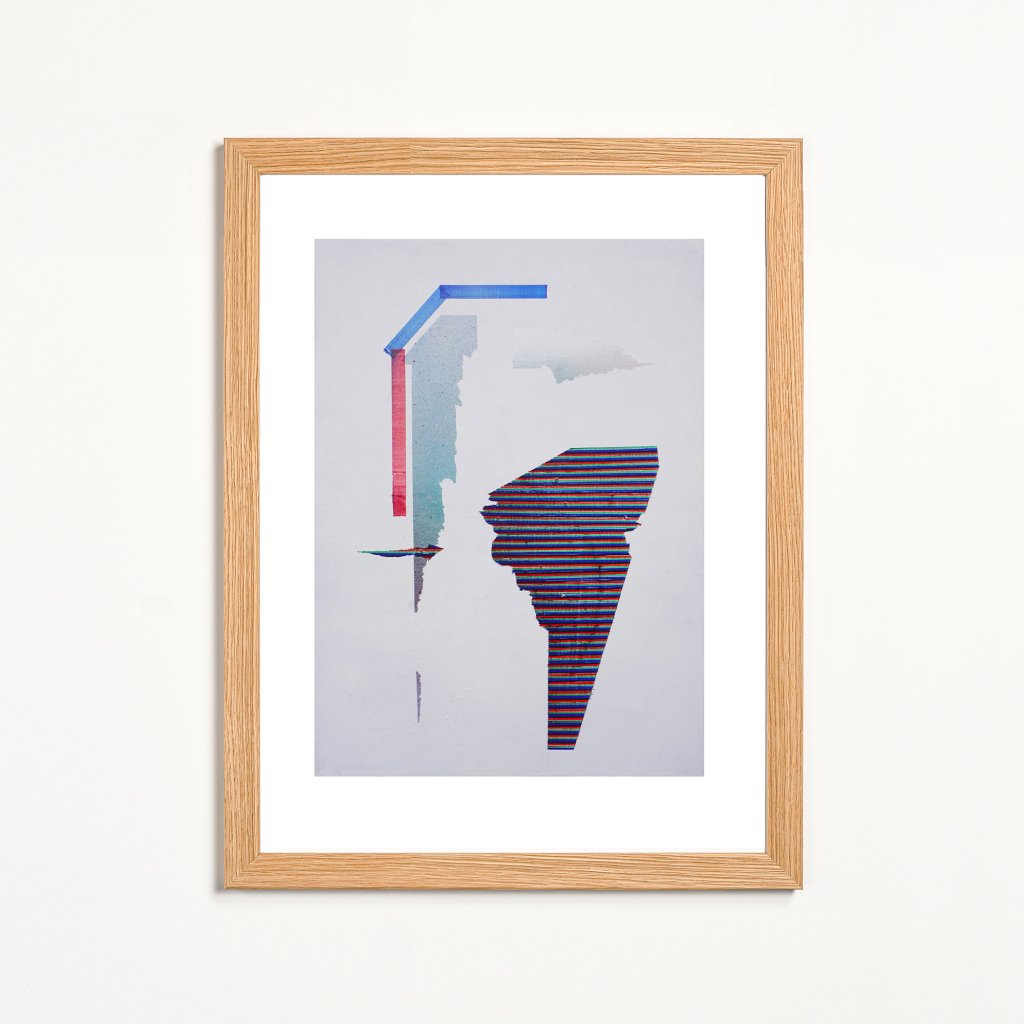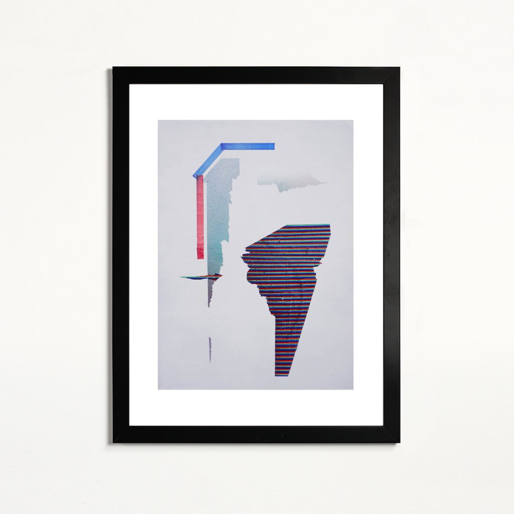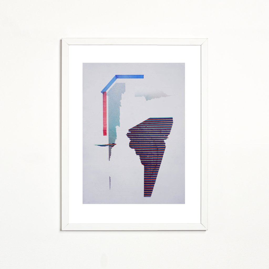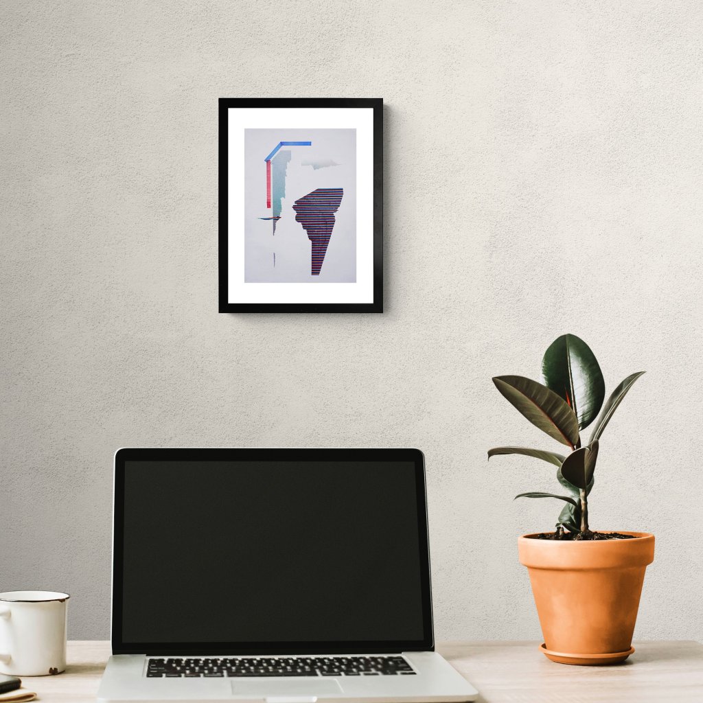 Obraz staví na kontrastu čisté bílé plochy a fragmentovaných tvarů, které působí, jako by byly vytržené z jiného obrazu nebo vrstvy reality. Barevné prvky v chladné modři, tlumená červené a výrazná plocha tvořená horizontálními pruhy v sytých barvách vytvářejí vizuální rytmus, který drží pozornost. Textura připomíná papír, tisk nebo stopu po mechanickém zásahu; celek působí lehce industriálně, ale zároveň citlivě. Dílo se skvěle hodí do moderních, vzdušných interiérů, jako jsou minimalistické byty, architektonicky čisté kanceláře nebo kreativních prostory.