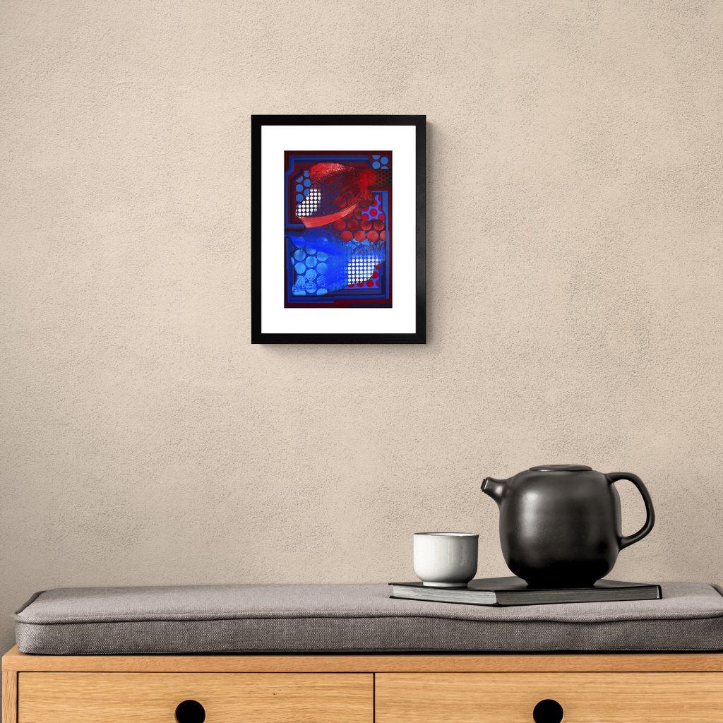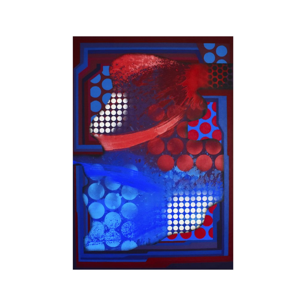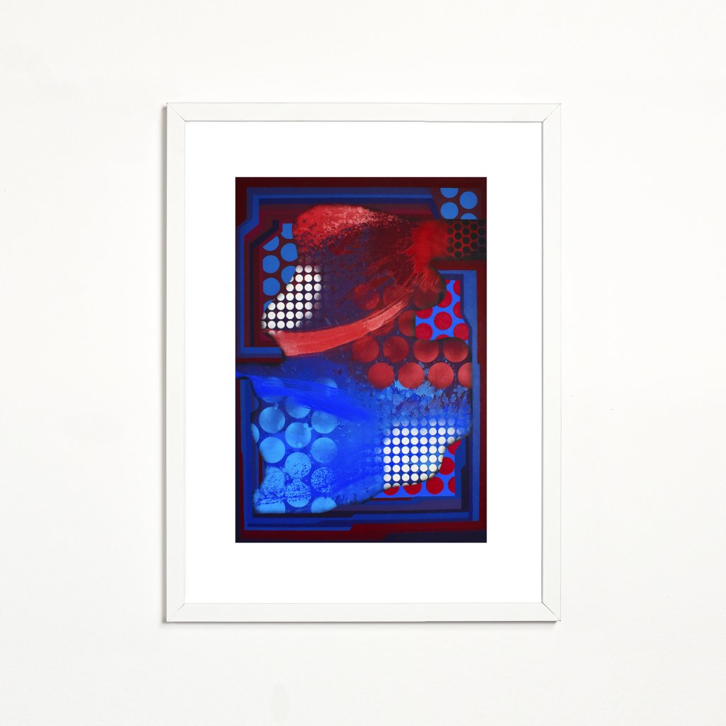 Na plátně se odehrává dialog studených modrých ploch a teplých červených akcentů. Geometrie a opakující se motivy vytvářejí pocit struktury, zatímco textury dodávají hloubku a emoci. Převážně klidný obraz, doplněný však špetkou napětí, skvěle vytvoří dominantní prvek jakémkoliv současném interiéru.