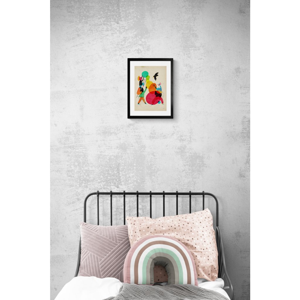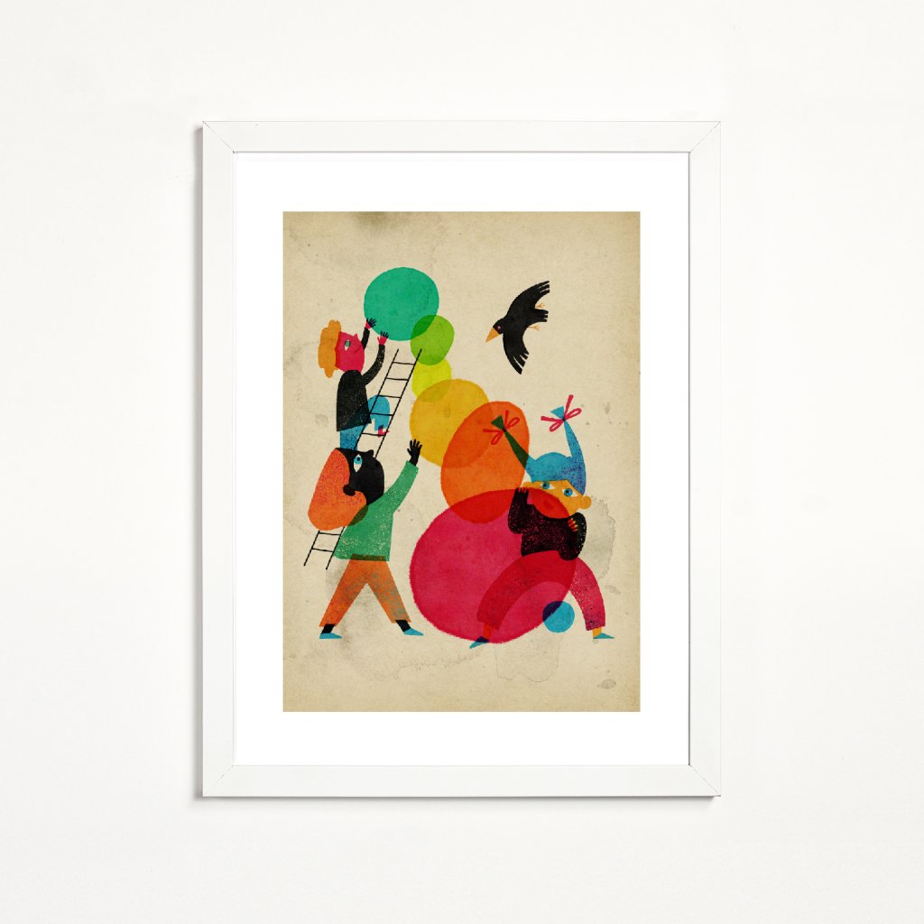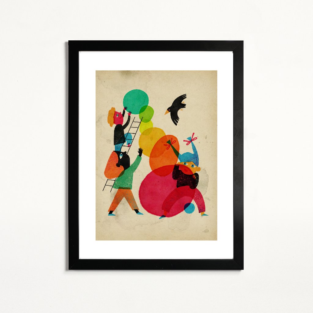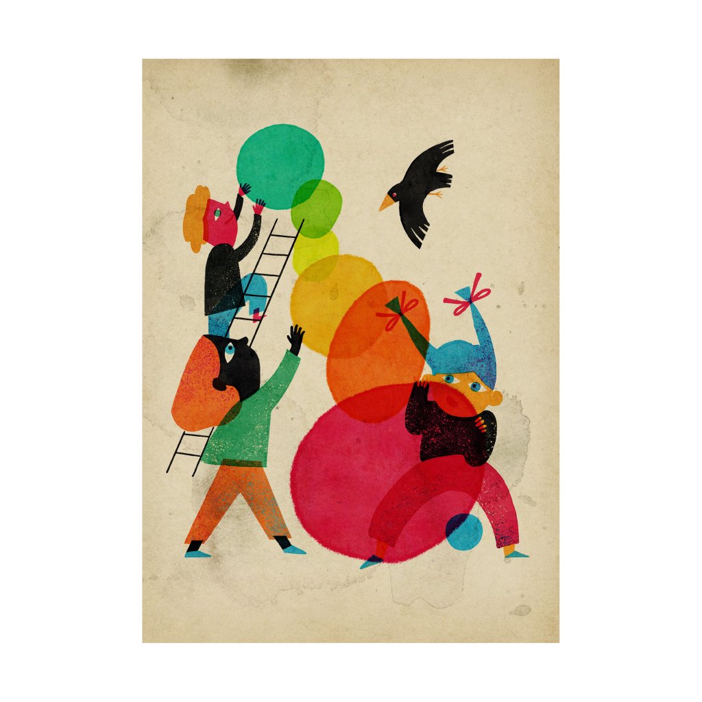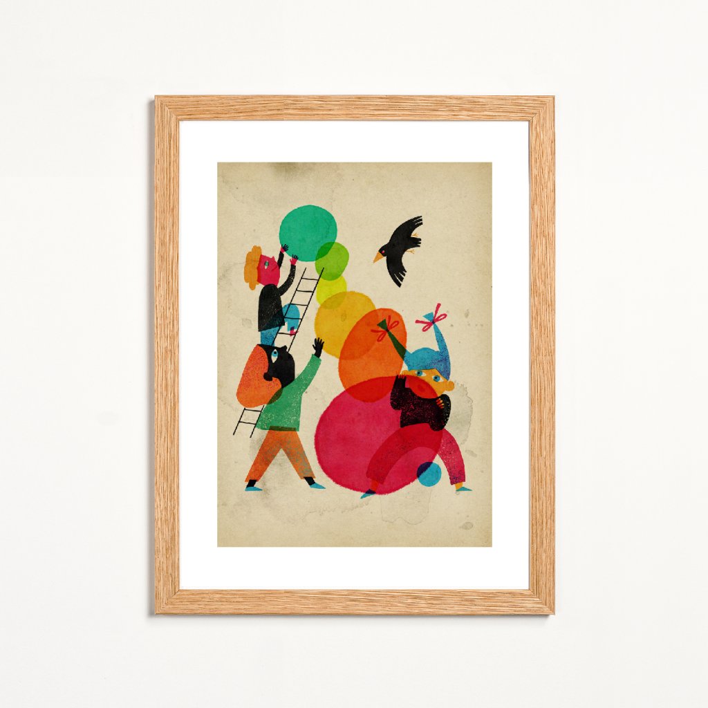 Kompozice spojuje stylizované postavy, výrazné barevné plochy a jemně strukturované pozadí připomínající papír s patinou. Transparentní překrývání barevných tvarů vytváří pocit pohybu a spolupráce, zatímco černý pták dodává scéně symbolickou rovinu. Autorka pracuje s jednoduchou, ale promyšlenou stylizací, která osloví děti i dospělé. Ideální do dětského pokoje, kreativní pracovny nebo obývacího prostoru, kde má obraz podporovat hravost a otevřenost.