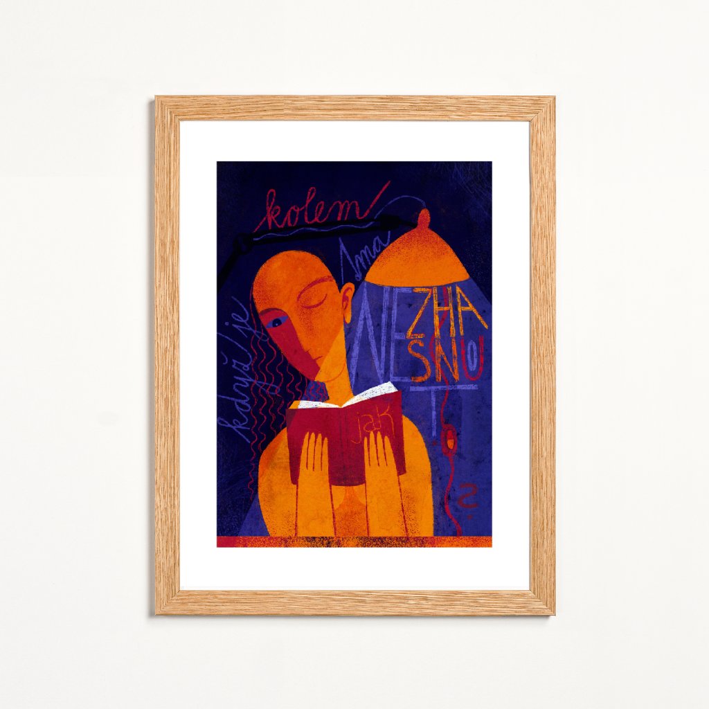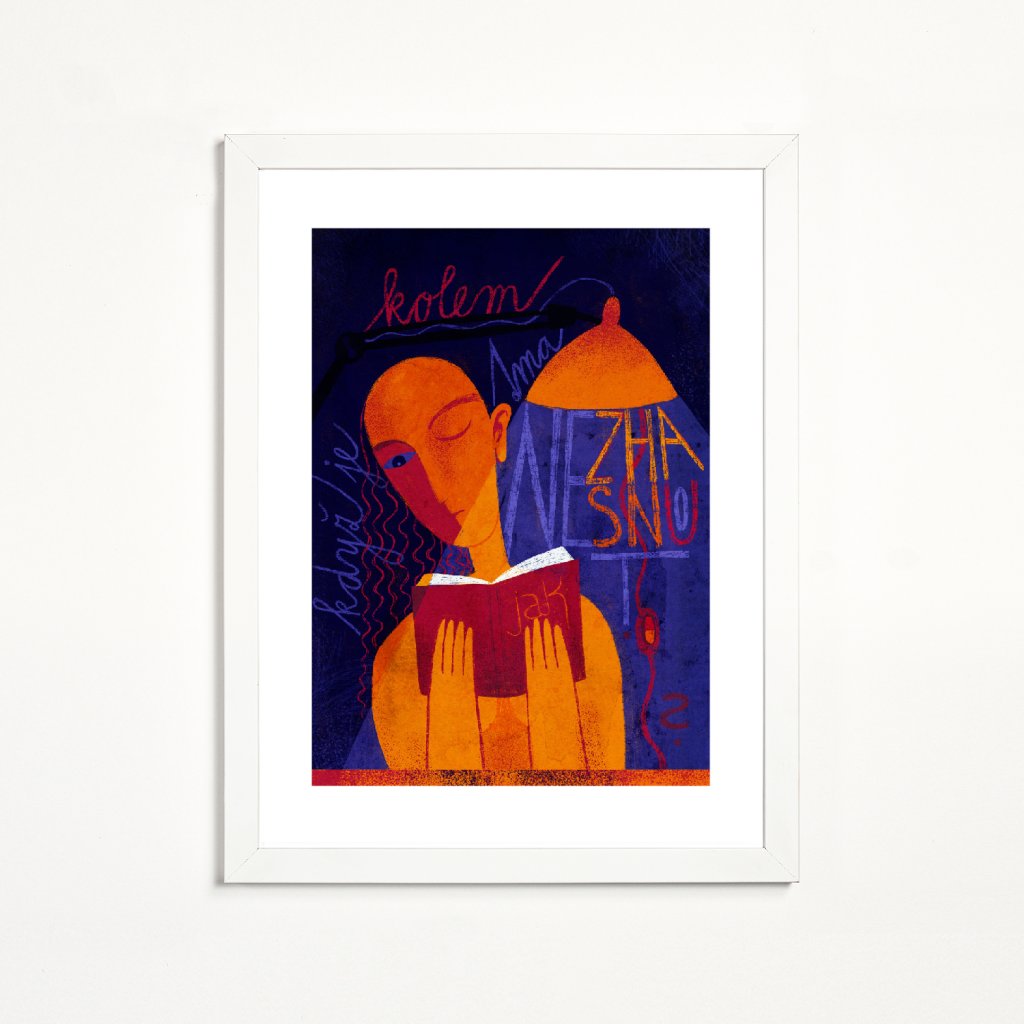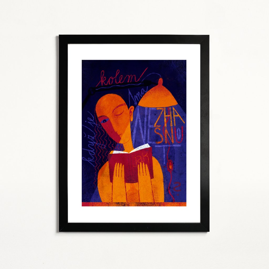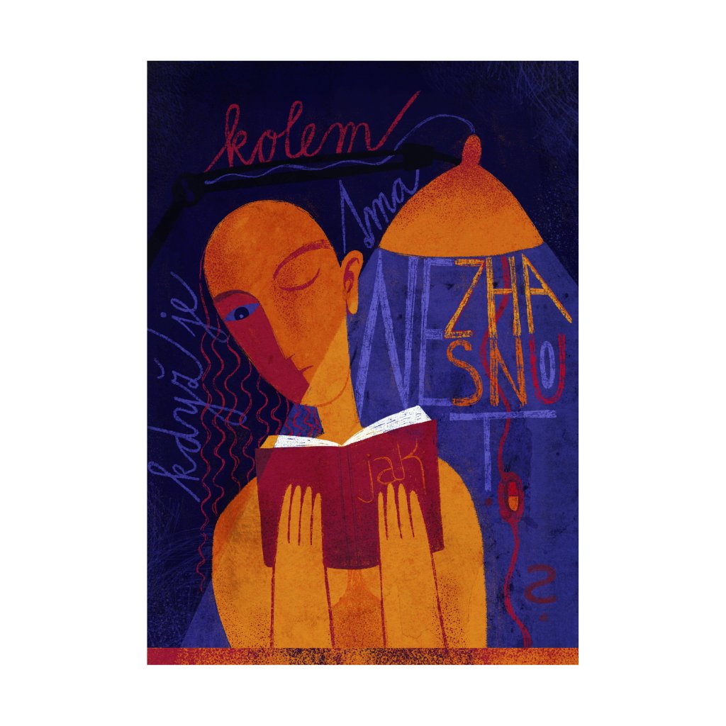 „Jak nezhasnout, když je kolem tma?“ ptá se doslovně ilustrace s klidnou, až noční atmosférou, z níž vystupuje stylizovaná postava ponořená do knihy. Teplá oranžová a červená kontrastují s hlubokou modří a fialovou, čímž obrázek získává vizuální napětí, aniž by ztratil jemnost. Textové fragmenty jsou jako vizualizace myšlenkového proudu; tichého, ale intenzivního. Dílo osloví každého, kdo má blízko ke čtení, psaní a/nebo svému vnitřnímu světu.