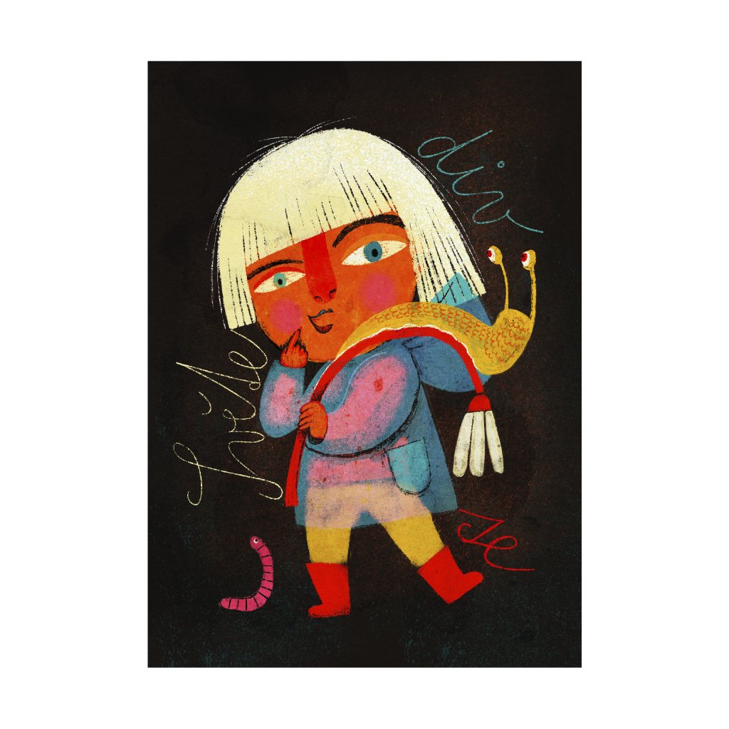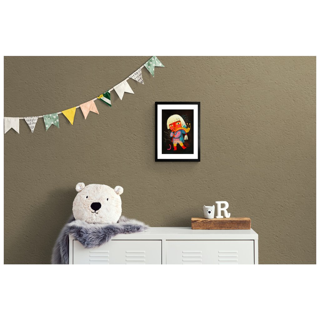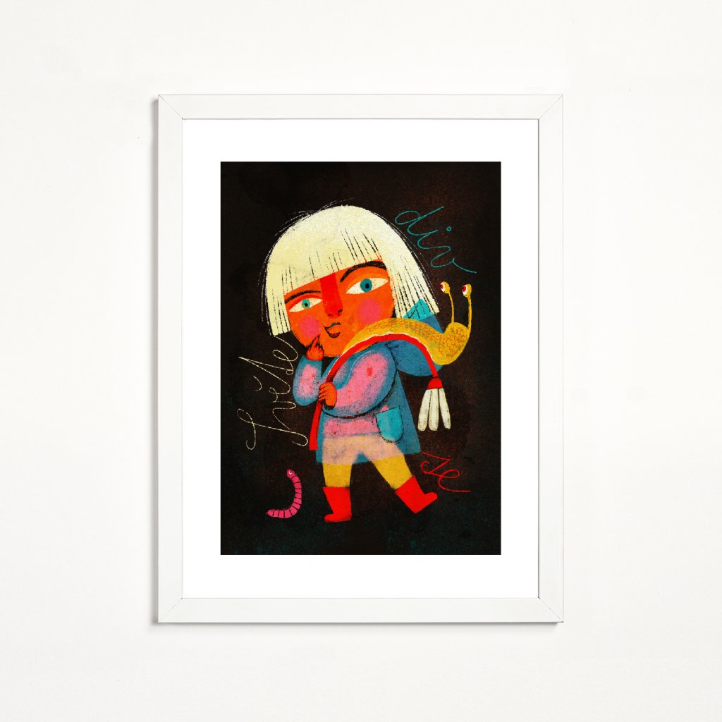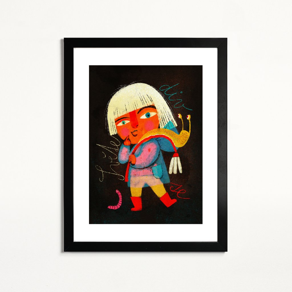 Odvážná holčička v holinkách stylizovaným se slimákem na zádech vytváří originální, téměř pohádkový motiv. Kontrast zářivých barev proti tmavému pozadí zvýrazňuje emoce i detaily kresby. Skvěle zapadne do kreativních domácností, dětských pokojů i moderních interiérů, kde chcete zdůraznit hravost a otevřenost dětské představivosti.