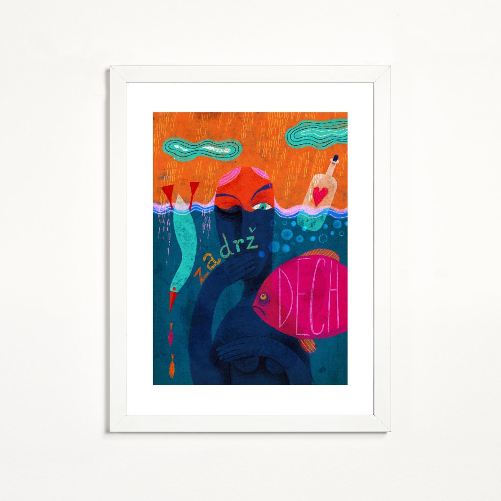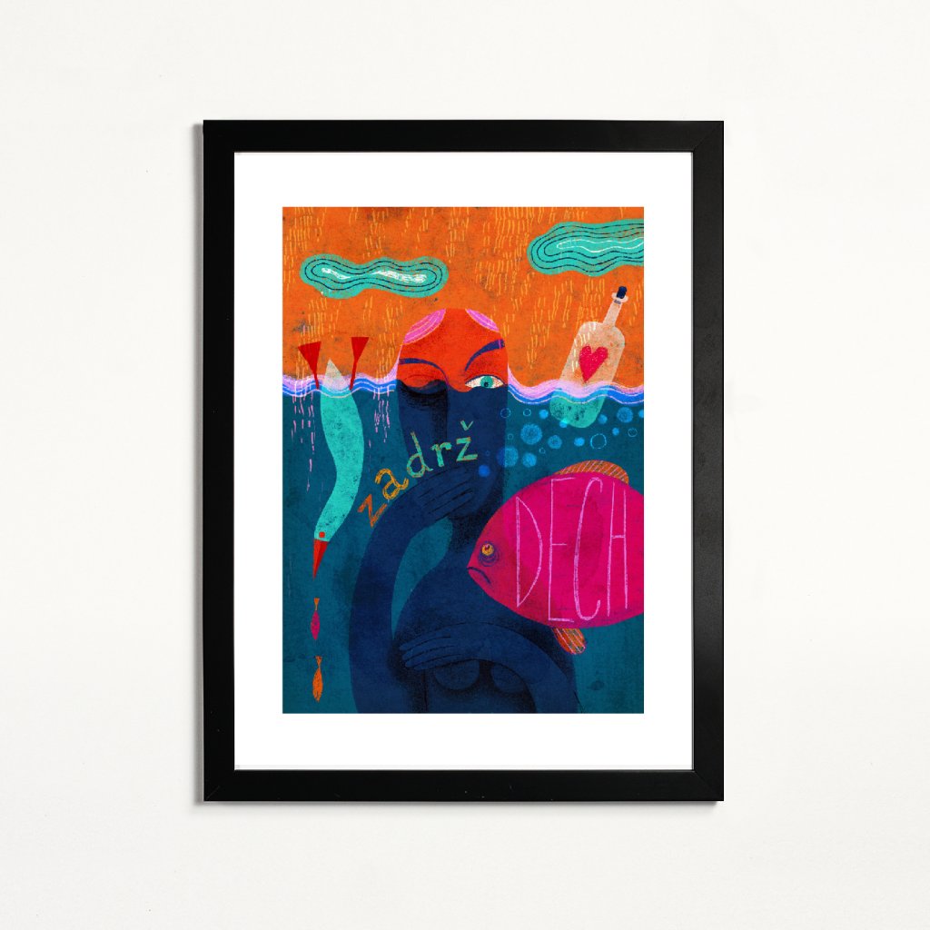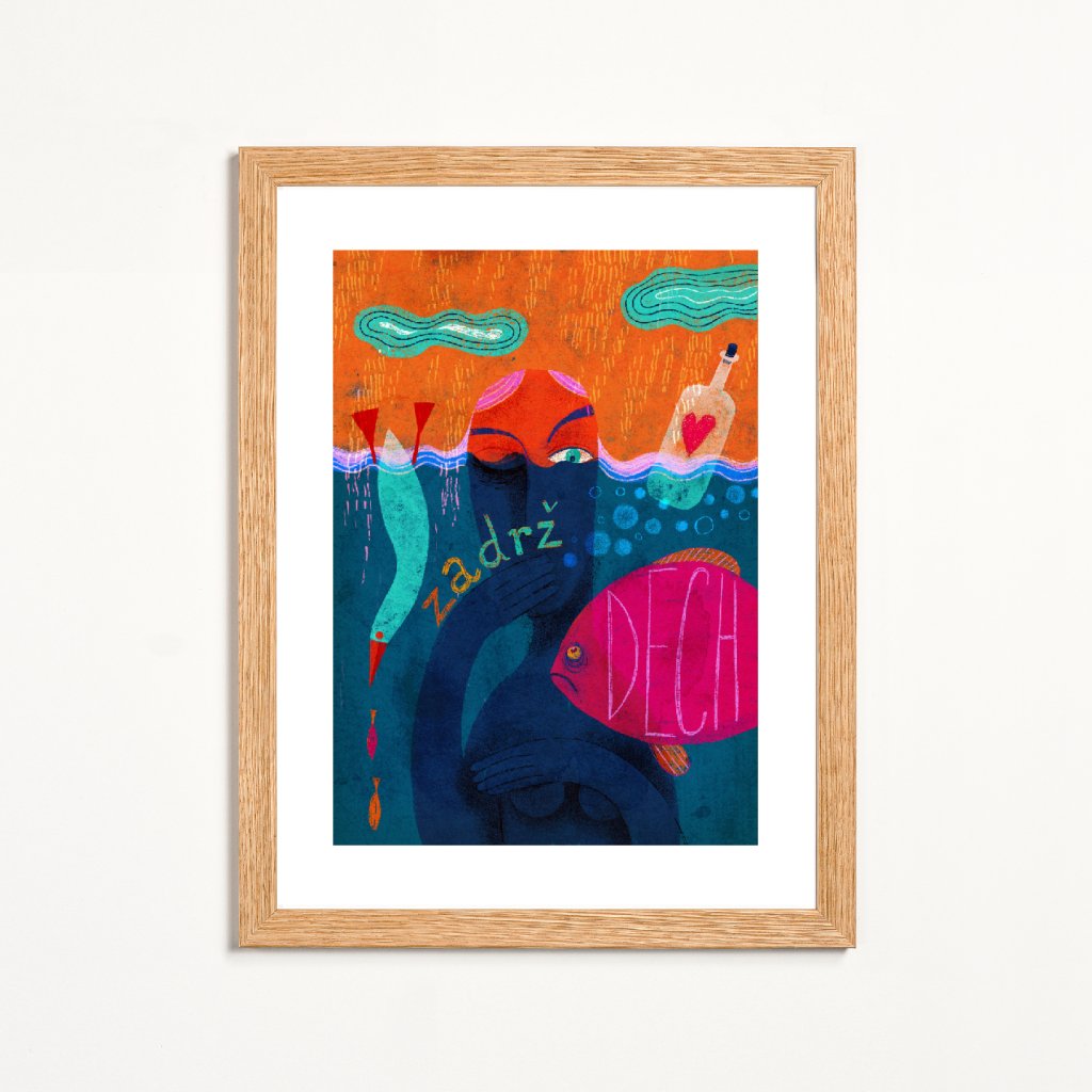 Ilustrace pracuje s motivem ponoření, doslova i symbolicky. Postava částečně skrytá pod hladinou je obklopena sytými odstíny tyrkysové, modré a růžové, které kontrastují s teplým oranžovým pozadím. Výrazný nápis dotváří dílo nejen vizuálně, ale především myšlenkově. Styl kombinuje hravost s určitou dávkou existenciálního napětí, což z ilustrace dělá silný vizuální prvek. Hodí se do obývacích pokojů, pracoven nebo kreativních prostorů.