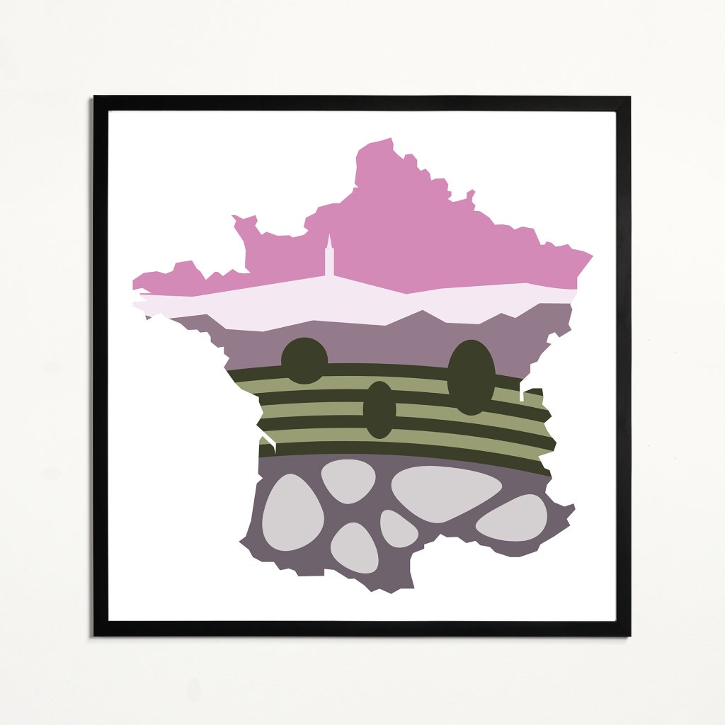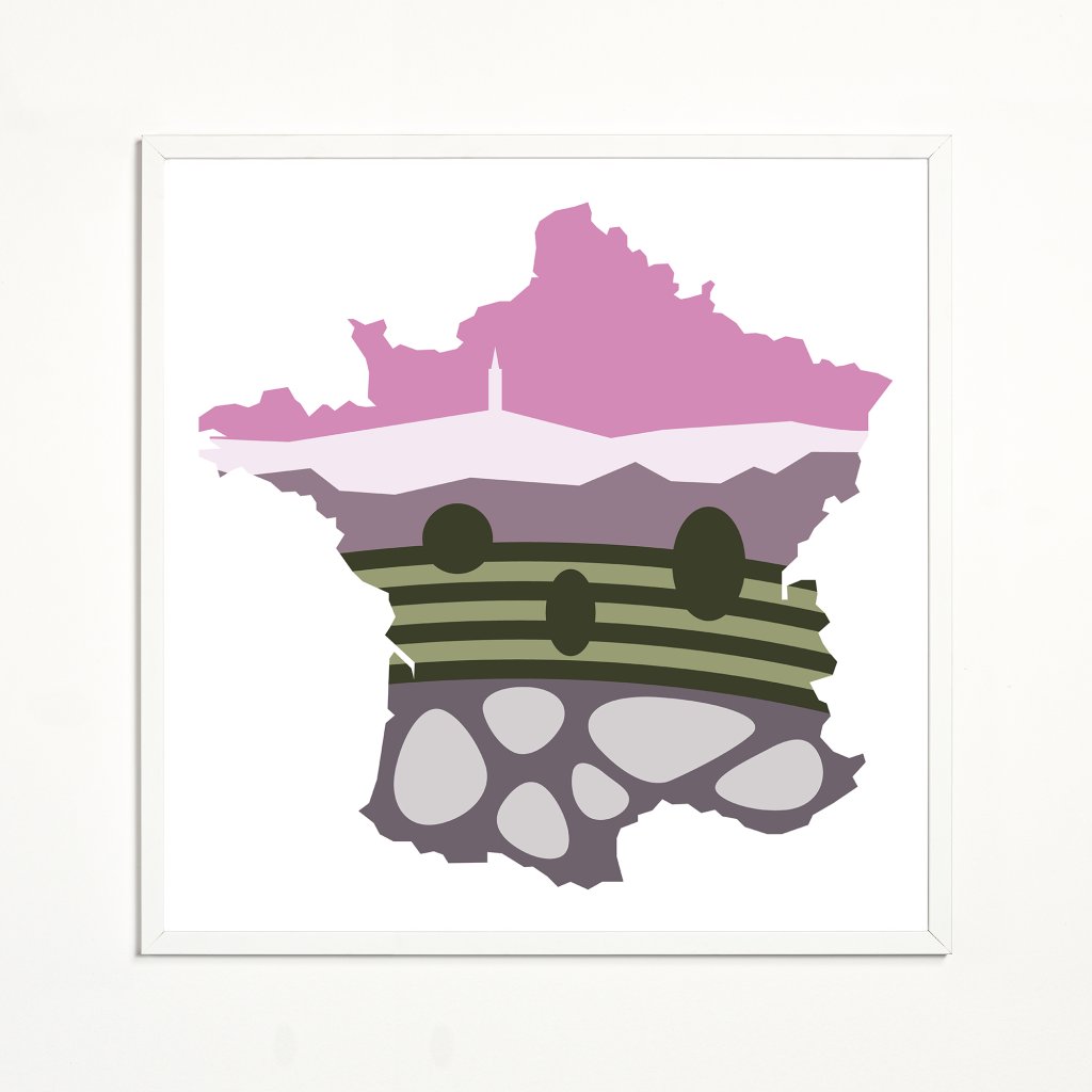 Stylizovaná krajina uzavřená v siluetě mapy zachycuje ikonickou oblast kolem hory Mont Ventoux ve francouzské Provence. Jednoduché barevné plochy vrství horizonty kopců, vinice i charakteristickou krajinu, kterou tato slavná hora obklopuje, a převádějí ji do čistého, současného grafického jazyka. Ilustrace je hravým a moderním obrazem místa – osobitým printem pro milovníky Provence, cyklistiky i výrazné krajinářské stylizace.