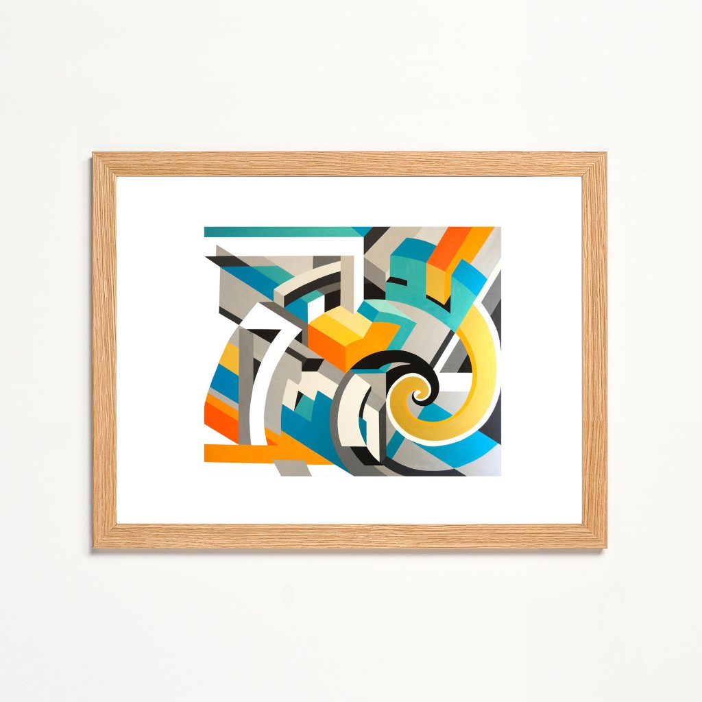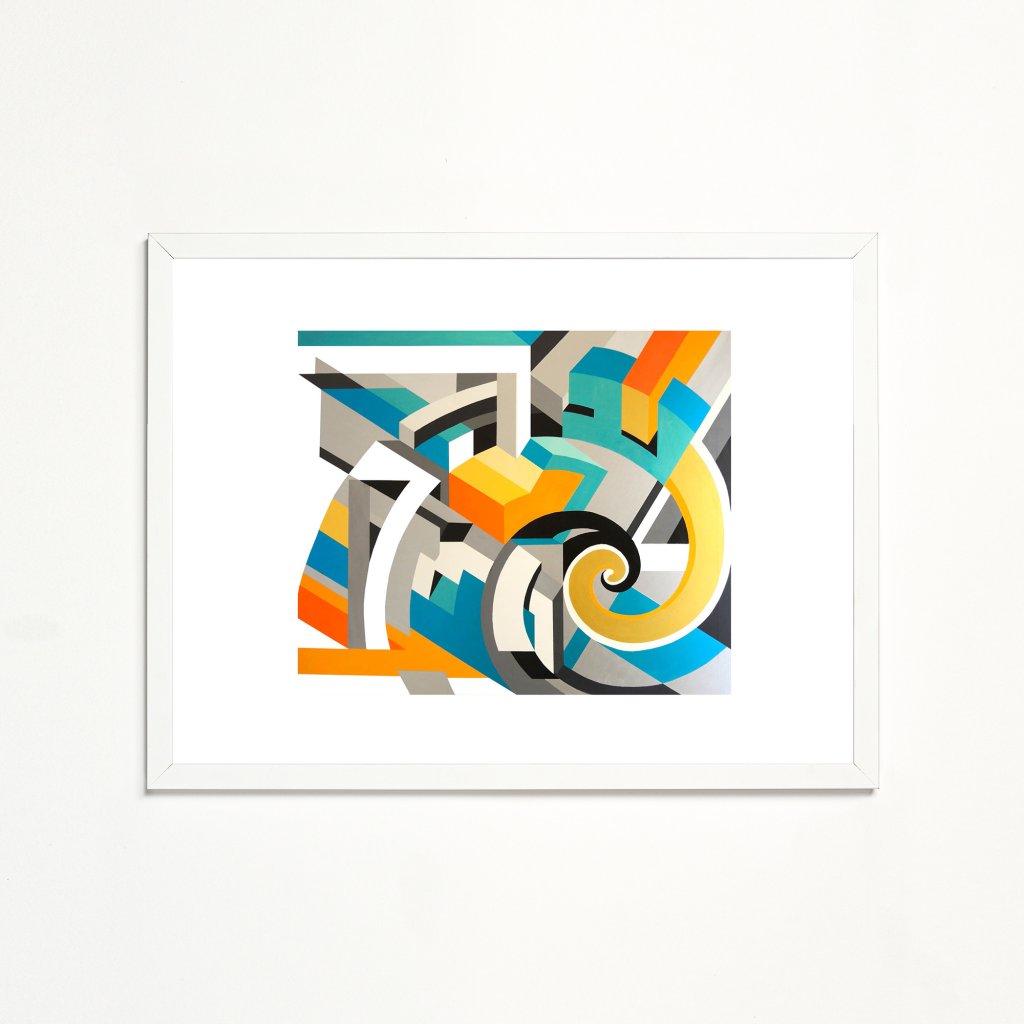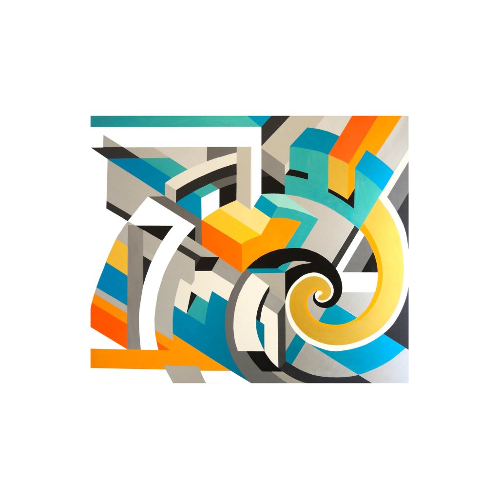 Žlutá a oranžová spirála se točí mezi tyrkysovými bloky, šedými liniemi a modrými prvky na světlém pozadí, evokujíc nekonečný vír energie. Vibrující kontrasty a geometrické tvary hledají mystérium v abstraktní harmonii. Obraz symbolizuje alchymii snů a meditativní tvorbu.