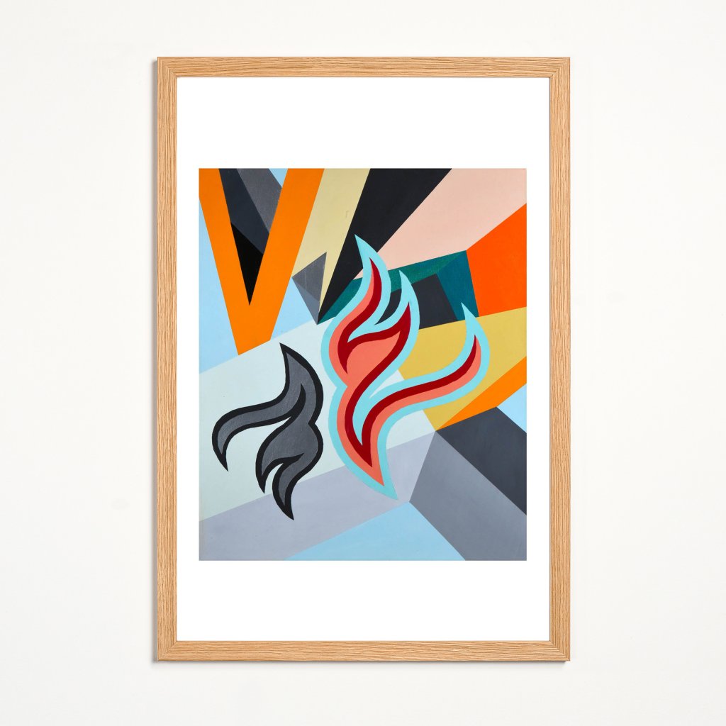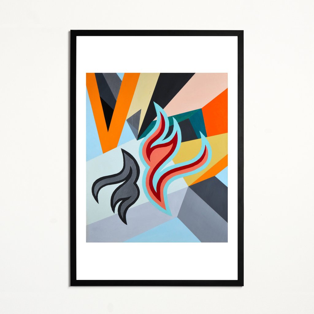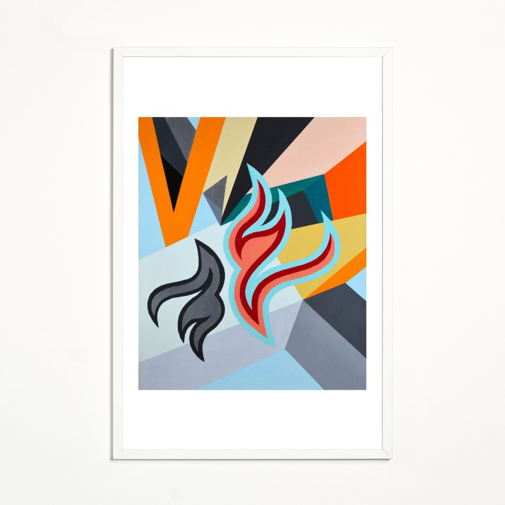 Ilustrace stojící na kombinaci ostrých geometrických ploch a organicky tvarovaných motivů, které vůči sobě fungují jako vizuální protějšky. Jejich výrazná barevnost kontrastuje s tmavšími částmi a vytváří pocit pohybu a vnitřního napětí. Kompozice je přesná a vyvážená, přesto nepůsobí staticky. Print se hodí do interiérů, které pracují s moderní grafikou, výraznými barvami a jasně definovanou vizuální strukturou.