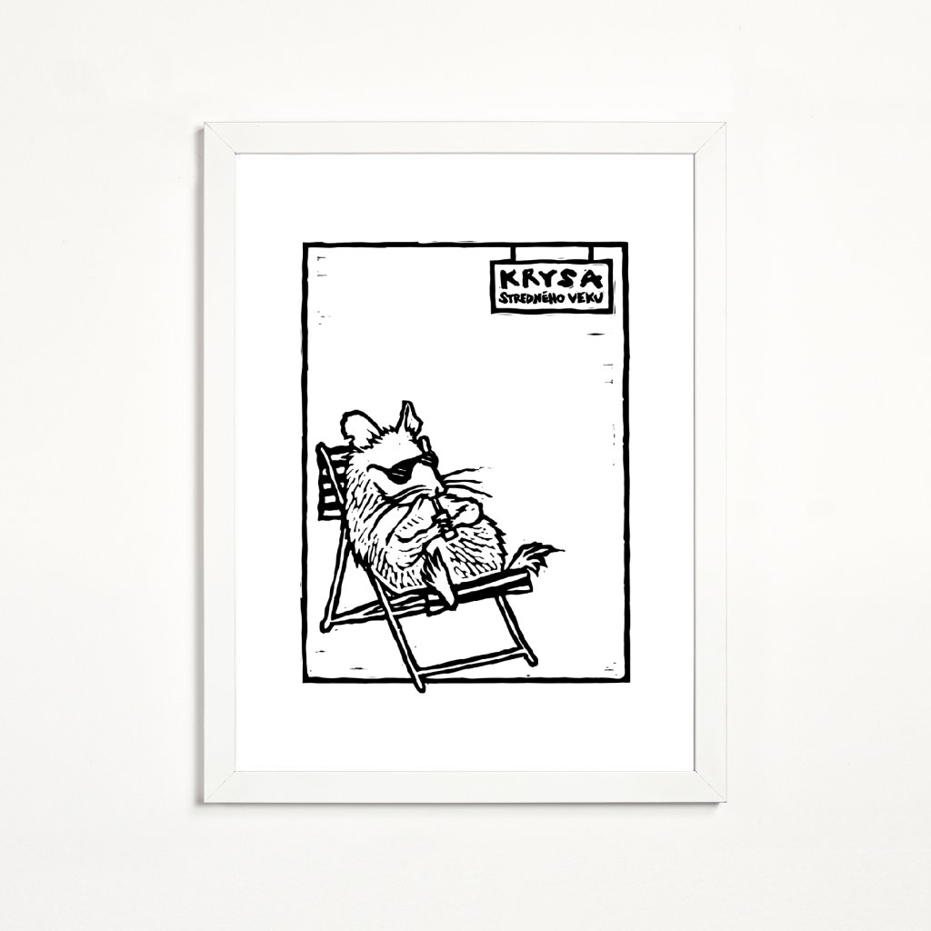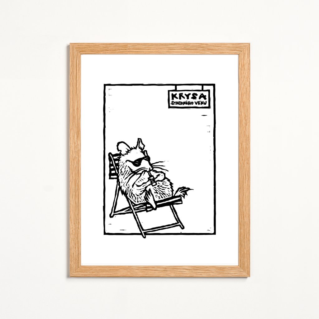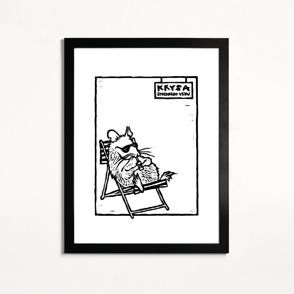 Jednoduchá kresba krysy odpočívající na lehátku pracuje s čistou linií a velkorysým bílým prostorem. Textový prvek v horní části rámuje scénu a posouvá ji do roviny jemné společenské ironie. Digitální reprodukce linorytu, kde dominuje výraz a charakter postavy, se skvěle hodí do moderních bytů, pracovních koutů i kanceláří, kde oceníte humor a nadsázku.