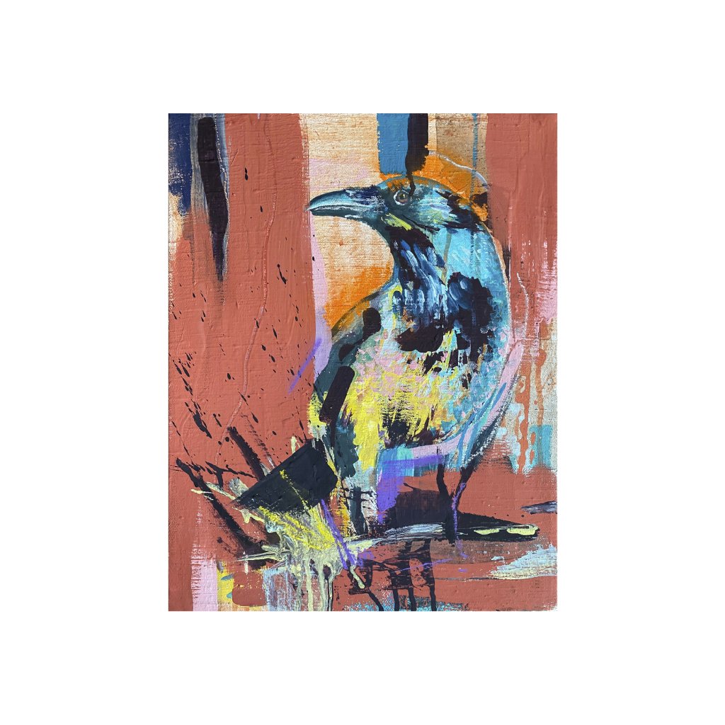 Vrána s modrým a žlutým tělem stojí na oranžovém podkladu, obklopená abstraktními pruhy a linkami v tyrkysu a černi. Drsná textura a intenzivní kontrasty zachycují inteligenci a divokost ptáka. Akryl na plátně, který evokuje zvířecí mýty v současném expresionismu.