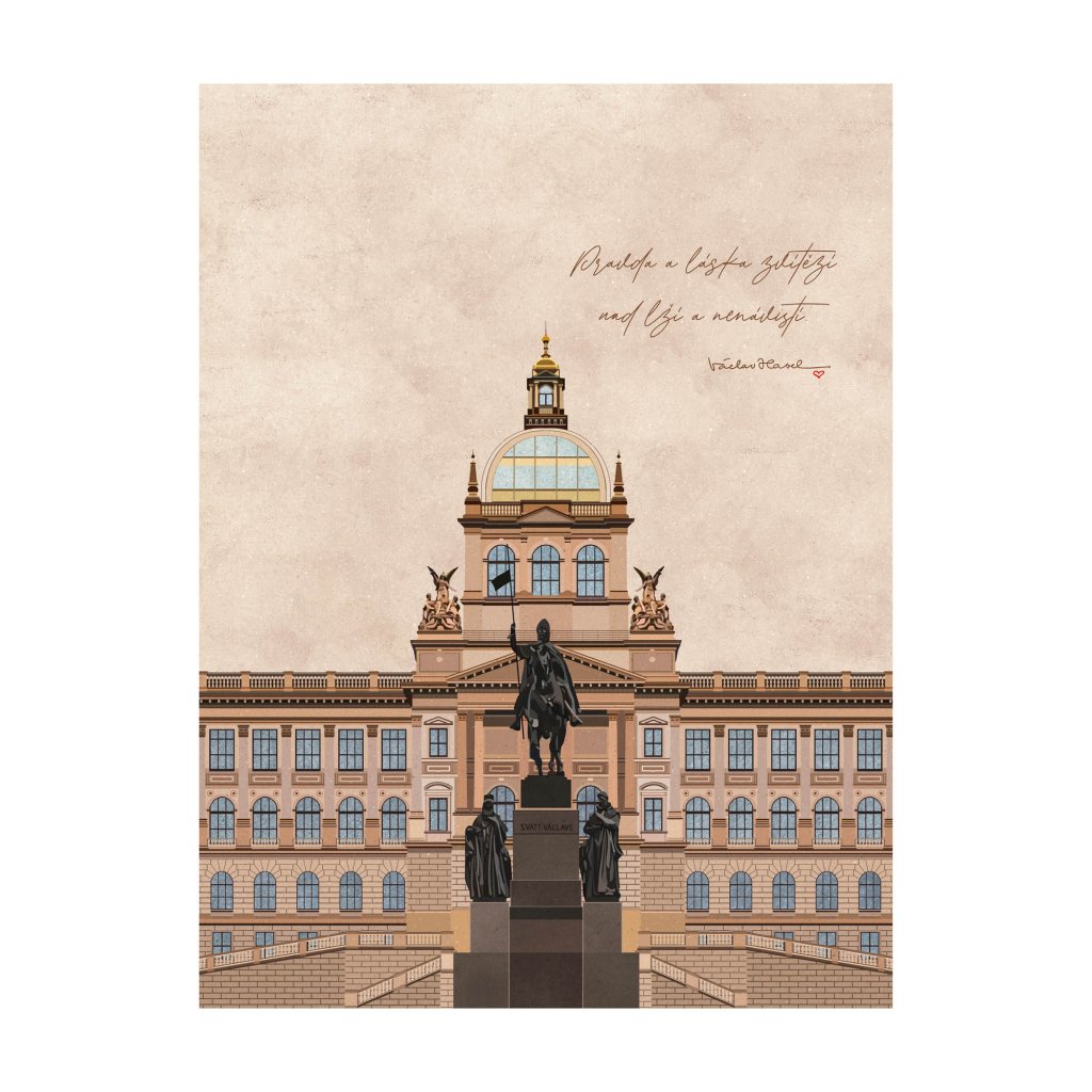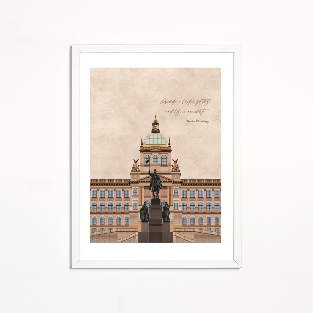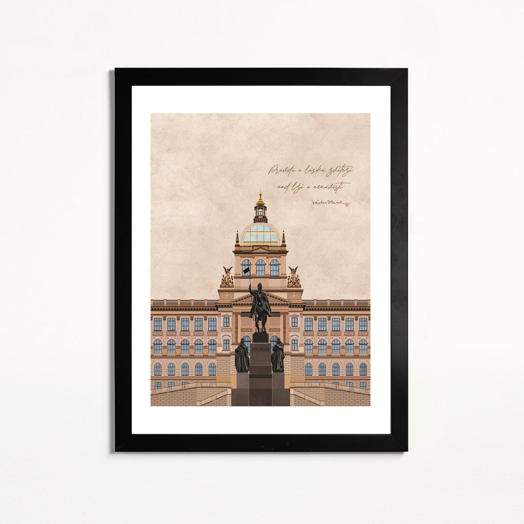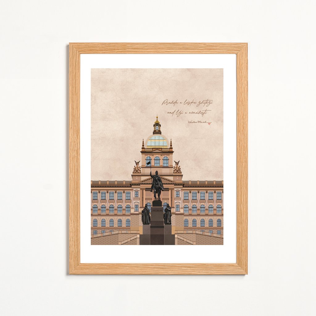 Ilustrace ikonické budovy Národního muzea v přesné, stylizované kresbě s důrazem na symetrii, proporce a historický detail. Centrální kompozici doplňuje jezdecká socha sv. Václava, která motiv ukotvuje v českém kulturním kontextu. Citát je doplněn nenápadně a funguje spíš jako doplněk obrazu než hlavní sdělení. Do interiérů, které pracují s architekturou, českou historií a jemnou symbolikou bez přehnané dekorativnosti.