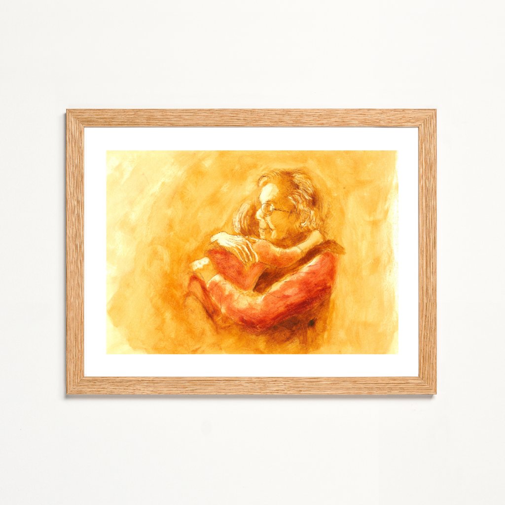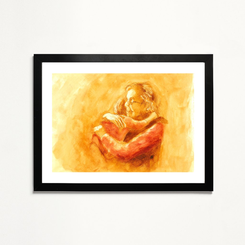 Lehce expresivní ilustrace zachycuje okamžik hlubokého objetí, kde se postavy rozpíjejí do teplé barevné mlhy. Jemná kresba obličejů kontrastuje s uvolněnými tahy, což dílu dodává citovou intenzitu. Dominantní teplá paleta působí uklidňujícím a bezpečným dojmem. Ideální volba pro interiéry, které chtějí zdůraznit sílu rodinu, vztahů a blízkosti.