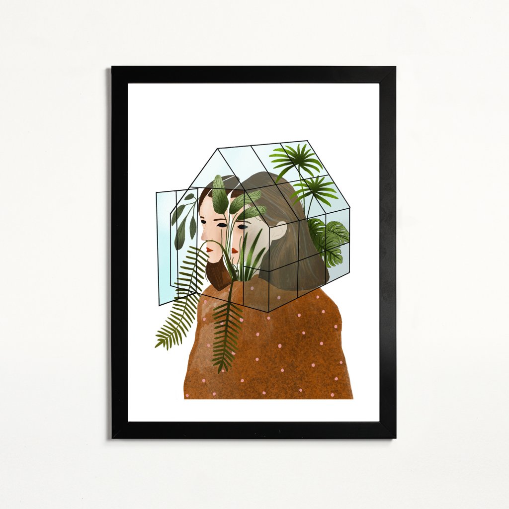 Obraz pracuje s motivem křehkého úkrytu, kdy je hlava doslova uzavřená v konstrukci skleníku. Rostliny prorůstající dovnitř i ven působí jako tiché svědectví o potřebě růstu, kontaktu a života, i když je člověk schovaný před okolním světem. Ilustrace je klidně, melancholická a velmi intimní. Hodí se do prostoru, kde má obraz vytvářet tichý dialog: do pracovny, čtecího koutku nebo ložnice.
