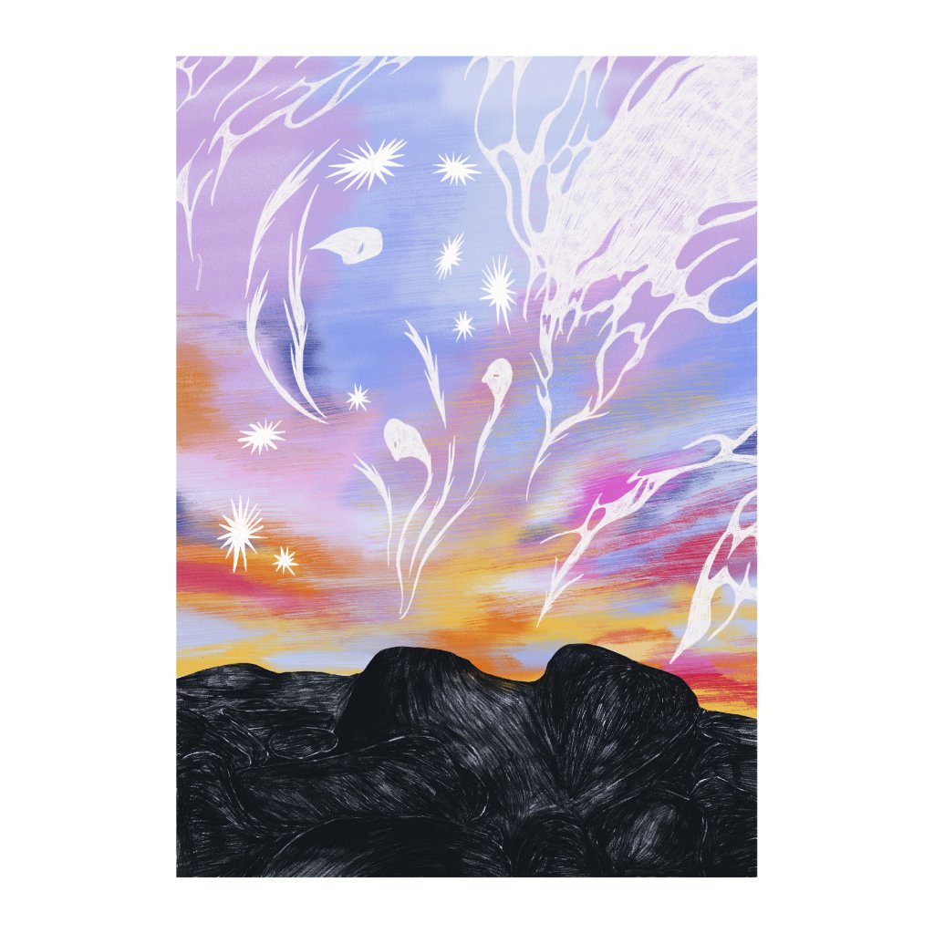 Dílo kombinuje výrazně temné kopce či skály ve spodní části s jemně vrstvenou, barevně bohatou oblohou v odstínech fialové, modré, růžové a oranžové. Přes oblohu se táhnou bíle kreslené prvky připomínající duchy a světelné stopy dodávají scéně snový, až kosmický charakter. Výrazná, magicky působící kresba skvěle doplní dětský i obývací pokoj.