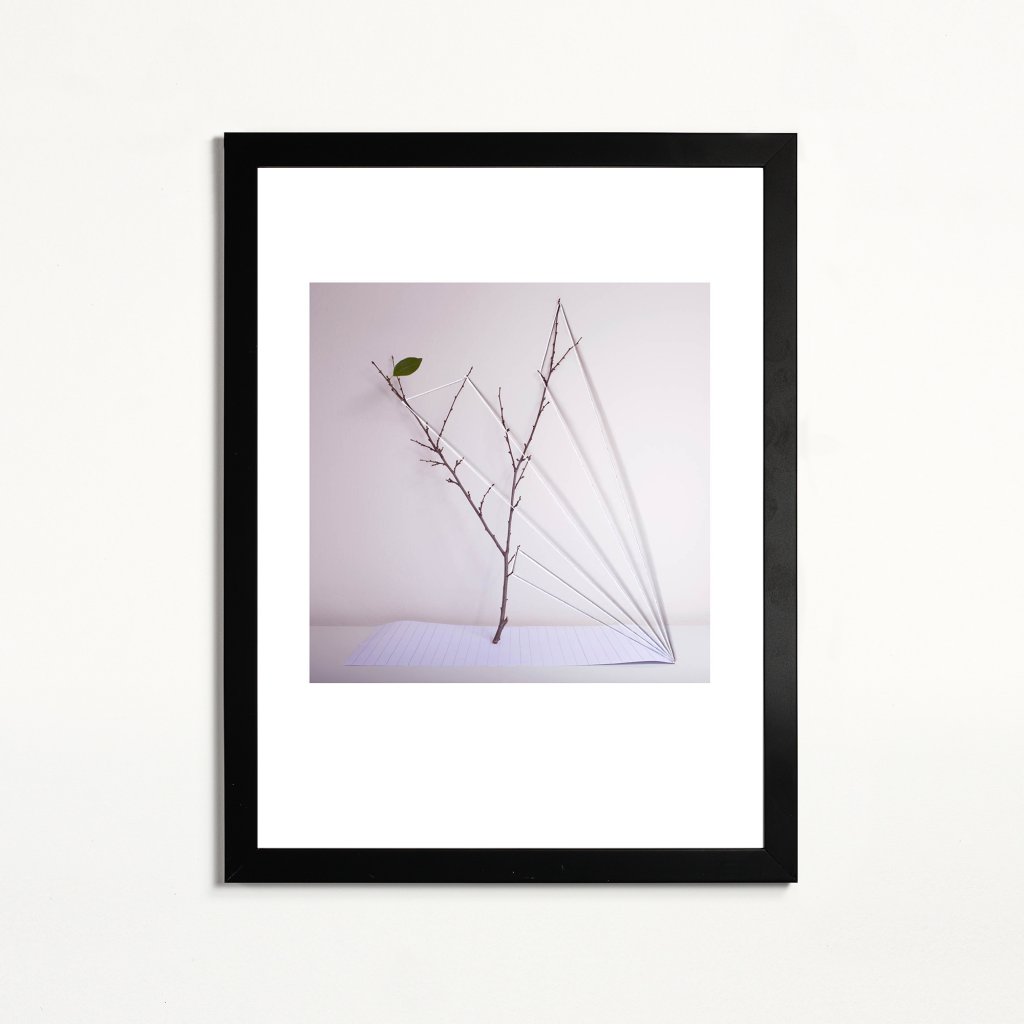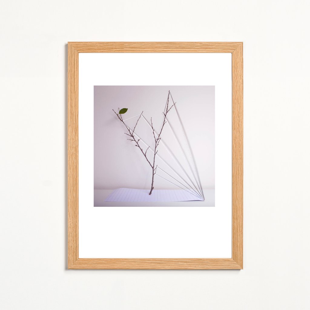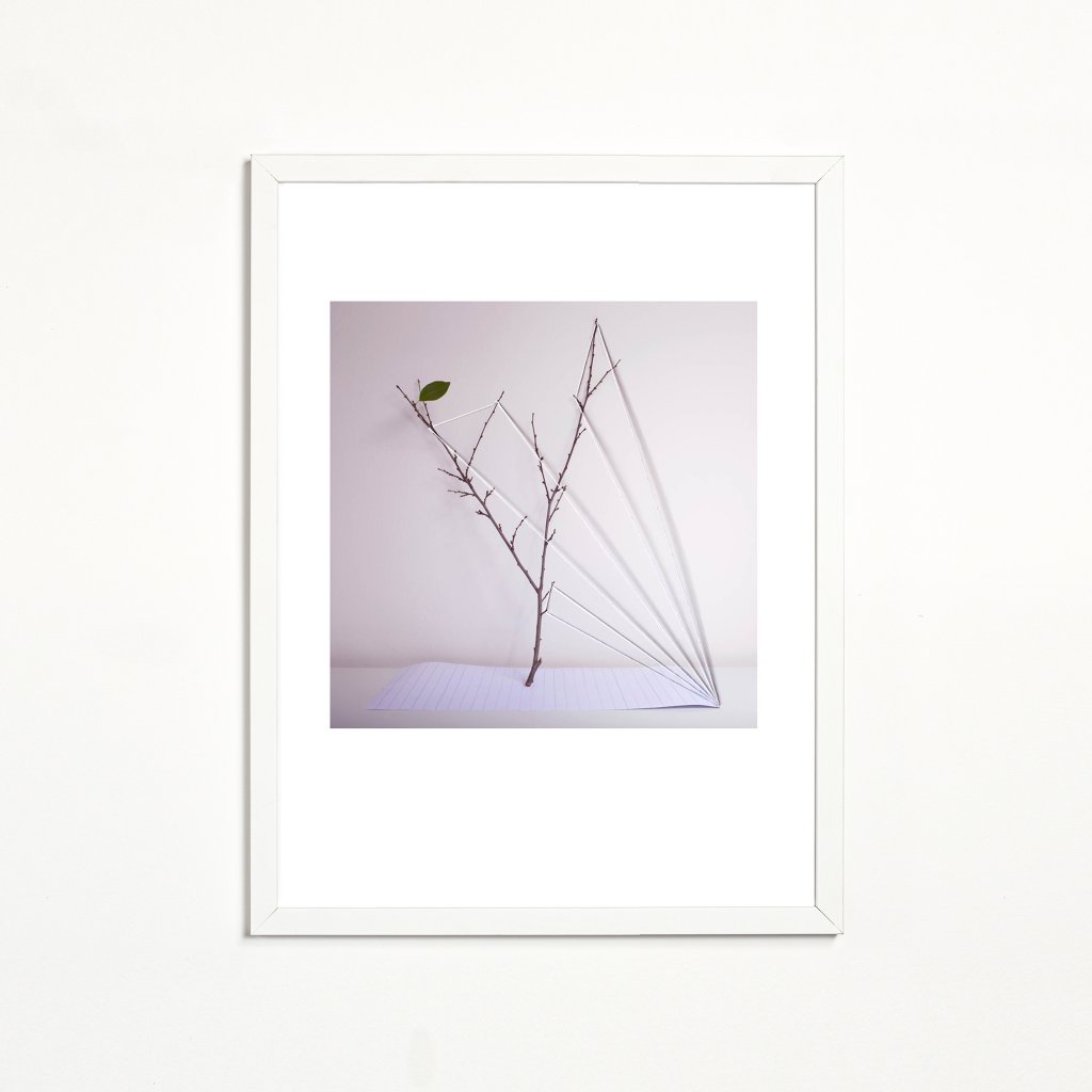 Fotka pracuje s kontrastem organického tvaru větve a přesně vedených papírových linií, které připomínají mapu pohybu nebo myšlenkový diagram. Celek působí lehce, vzdušně a klidně, s důrazem na detail a rytmus. Jeden zelený list funguje jako jemný akcent života a naděje. Dílo se hodí do světlých interiérů a prostor, kde je třeba soustředění a klid.