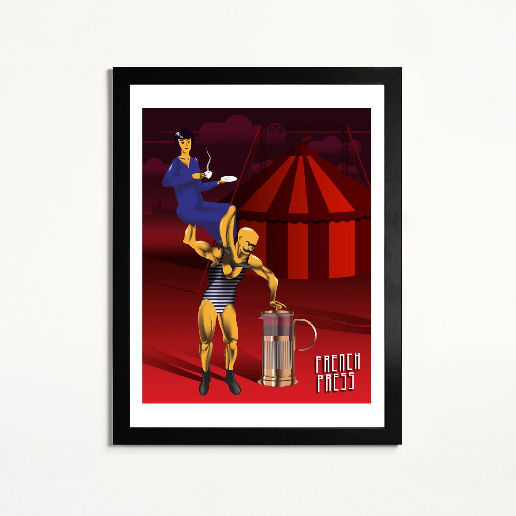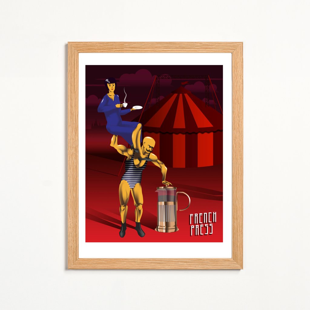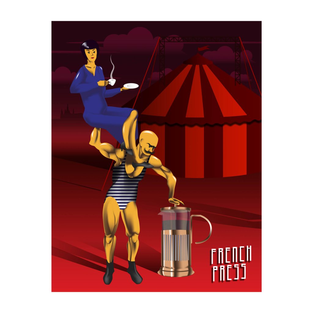 Žena v modrých šatech pije kávu na ramenou oranžového siláka v pruhovaných plavkách. Pozadí s cirkusovým stanem, temné mraky a ostré světlo dodávají tomuto způsobu každodenního rituálu ironii a dynamiku. Digitální grafika v pop-art stylu spojuje absurditu s reklamním šarmem.