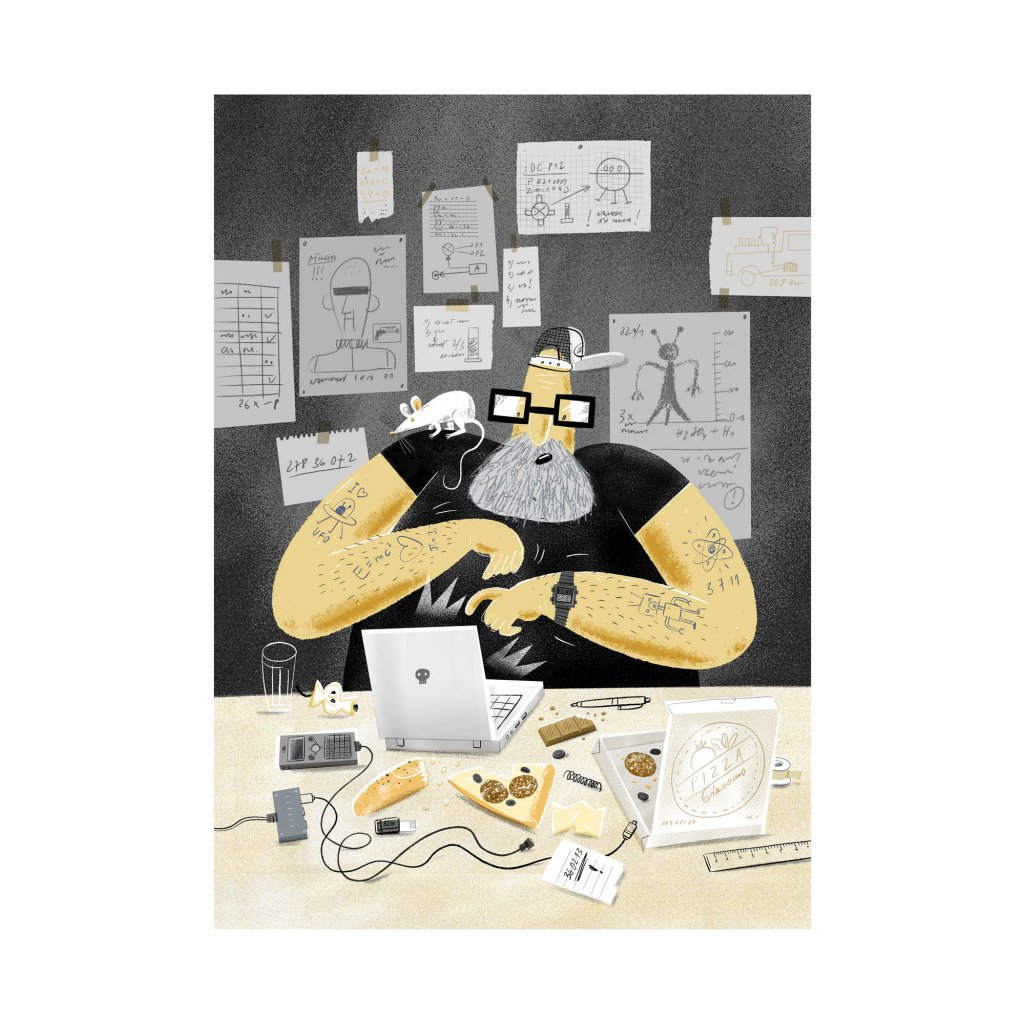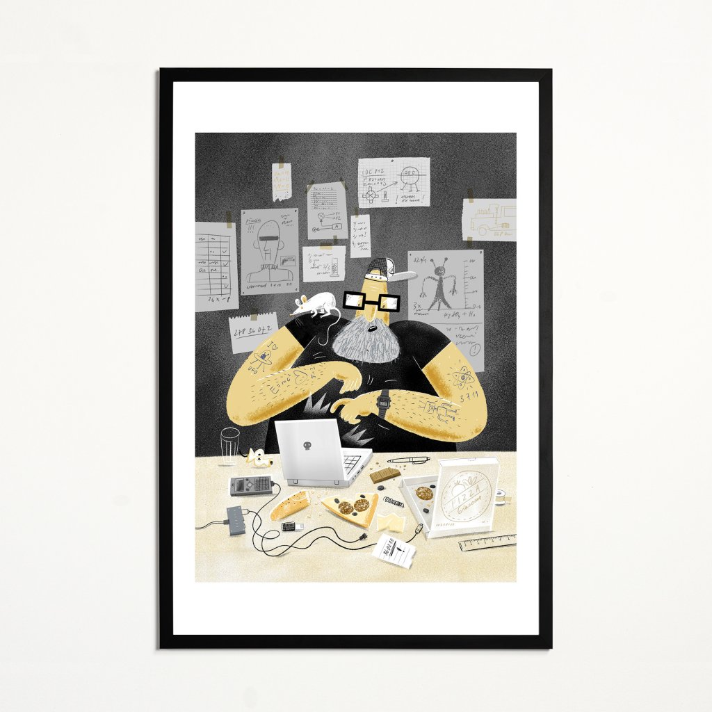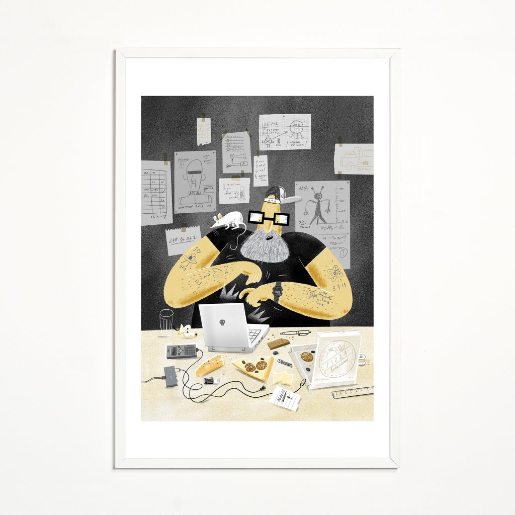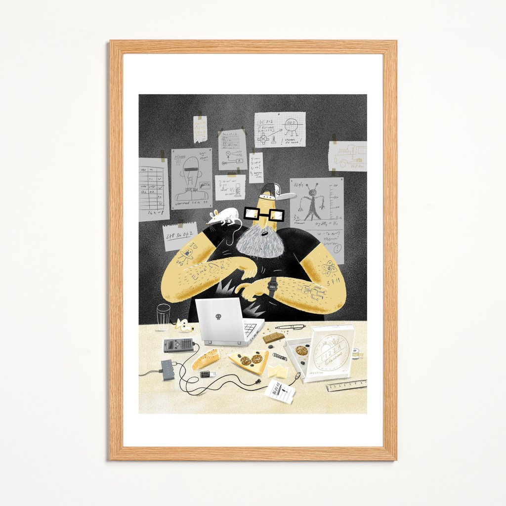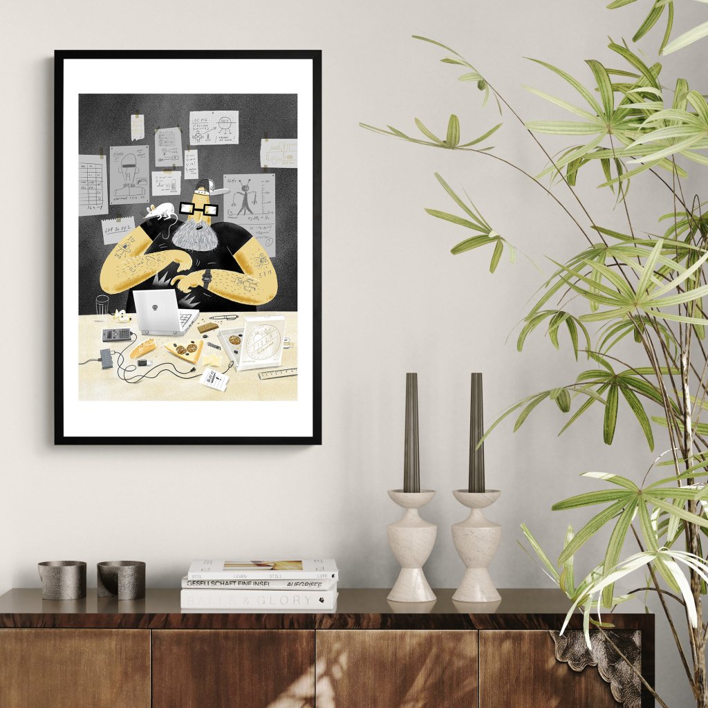 Detailní ilustrace zachycuje postavu ajťáka ponořenou do práce, obklopenou spoustou nezbytných věcí, jako pizza, čokoláda, spoustu kabelů nebo i bílá myška. Styl kombinuje hravou kresbu s tlumenou barevností a jemným humorem. Dílo působí jako portrét technické kreativity, neuhlazené, ale autentické. Vhodné do pracovních prostor, ateliérů nebo interiérů s ironickým nadhledem.
