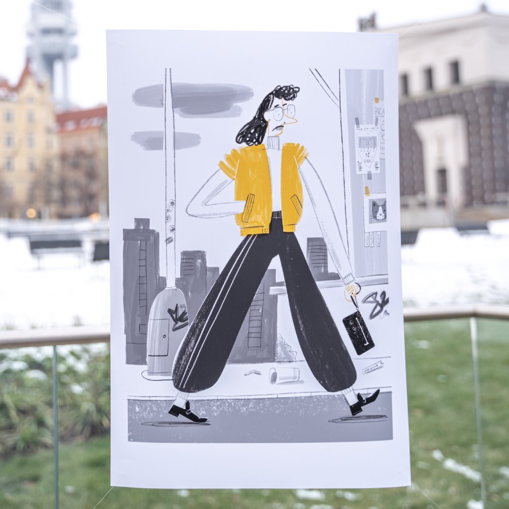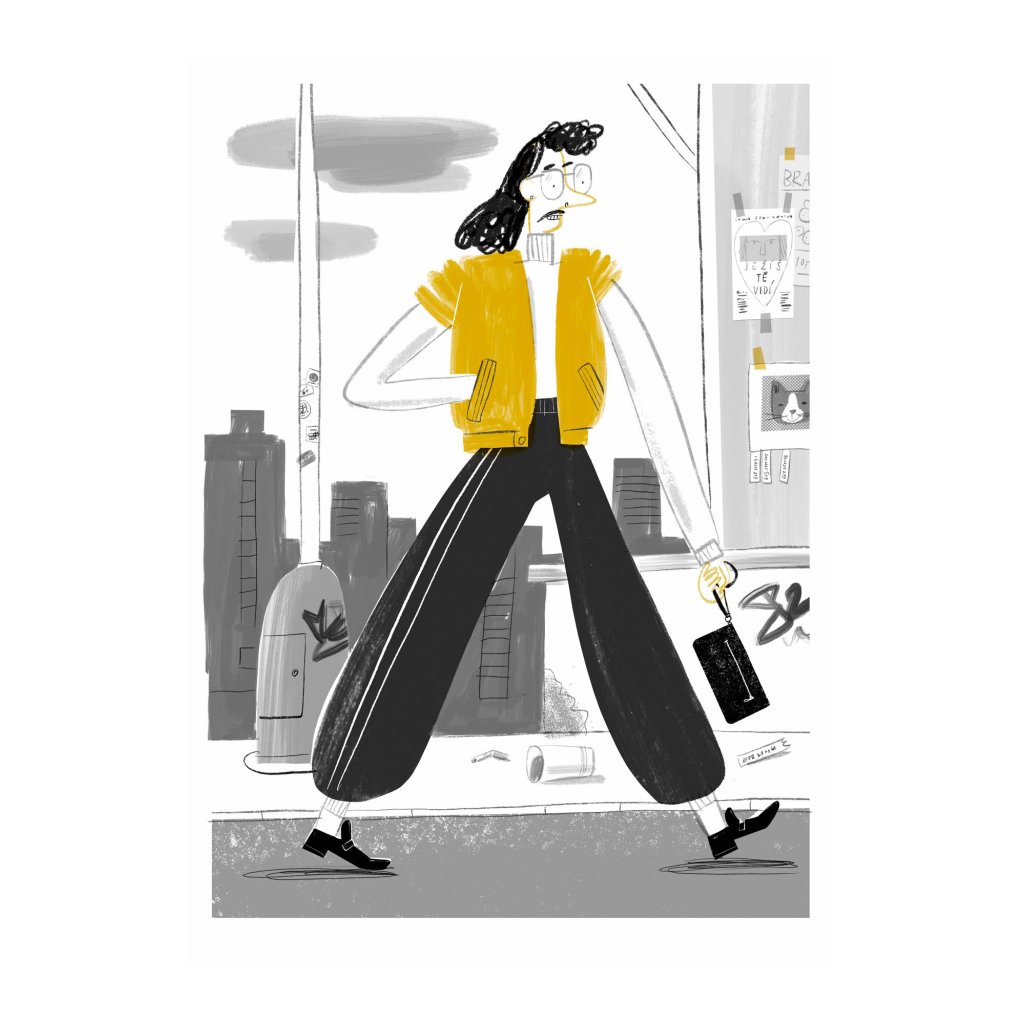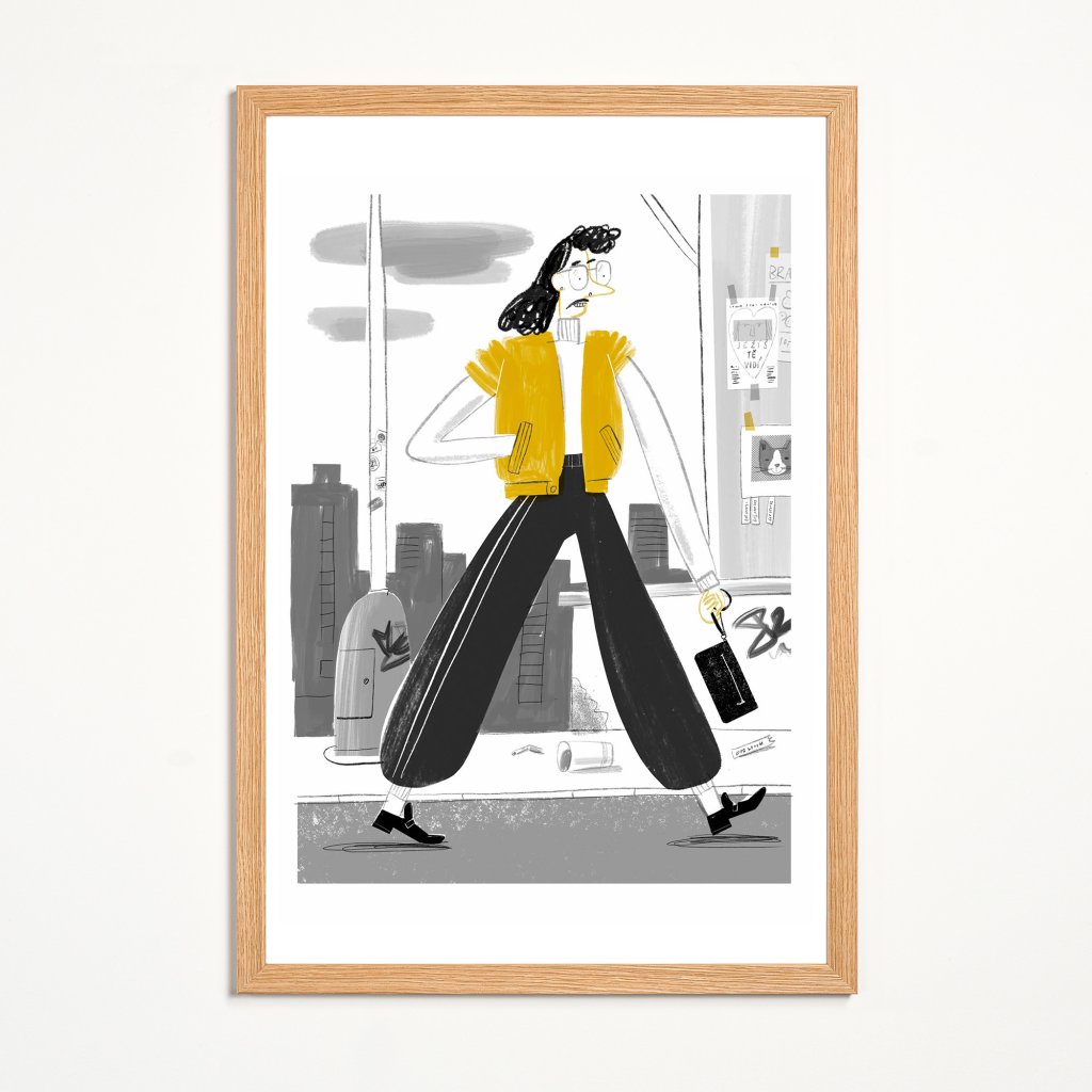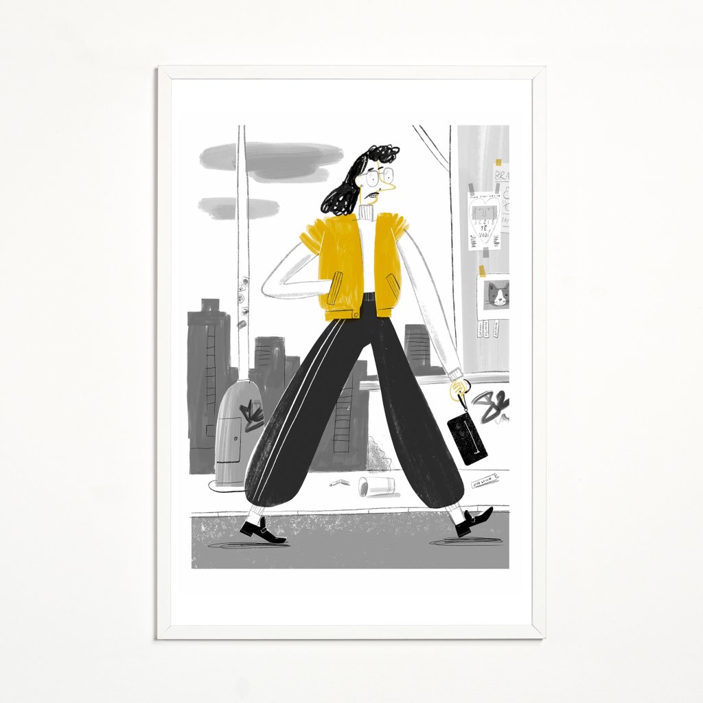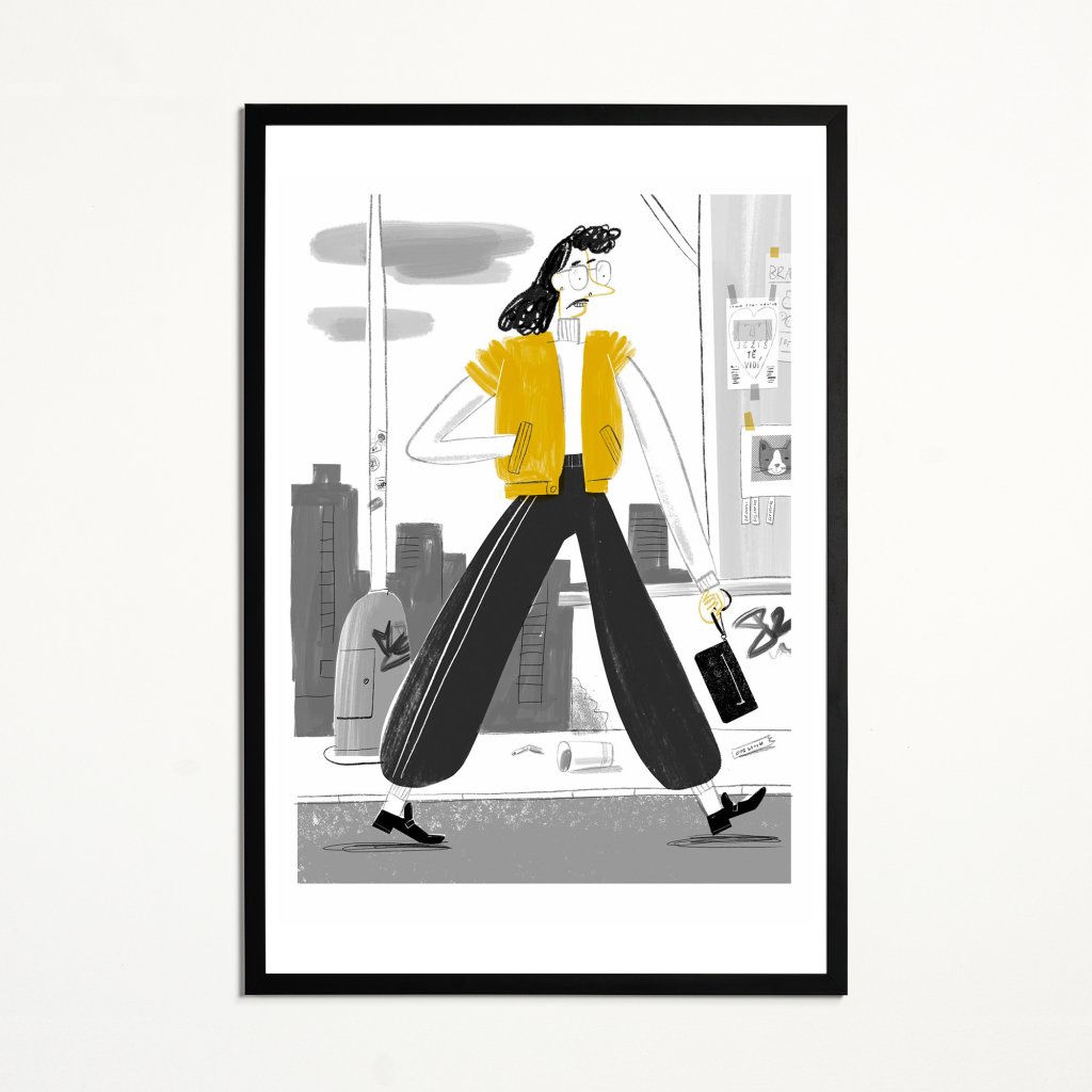 Ilustrace pracuje s výraznou siluetou a kontrastem černé, bílé a žluté. Postava kráčí městem s jasným gestem a lehce karikaturní styl dodává scéně nadhled. Dynamická ilustrace je ideální pro současné interiéry, které chtějí dodat prostoru charakter a lehkou hravost.