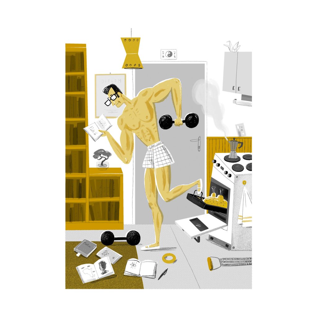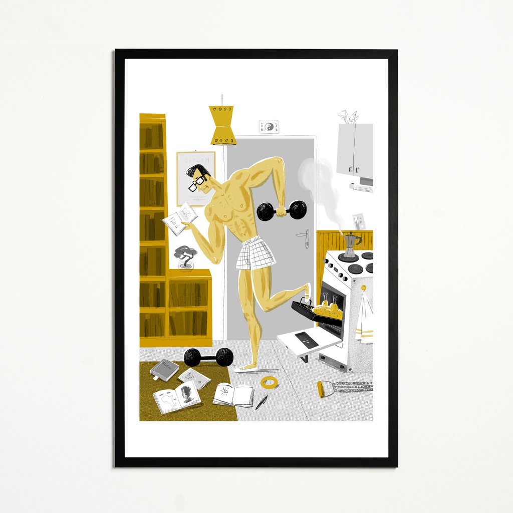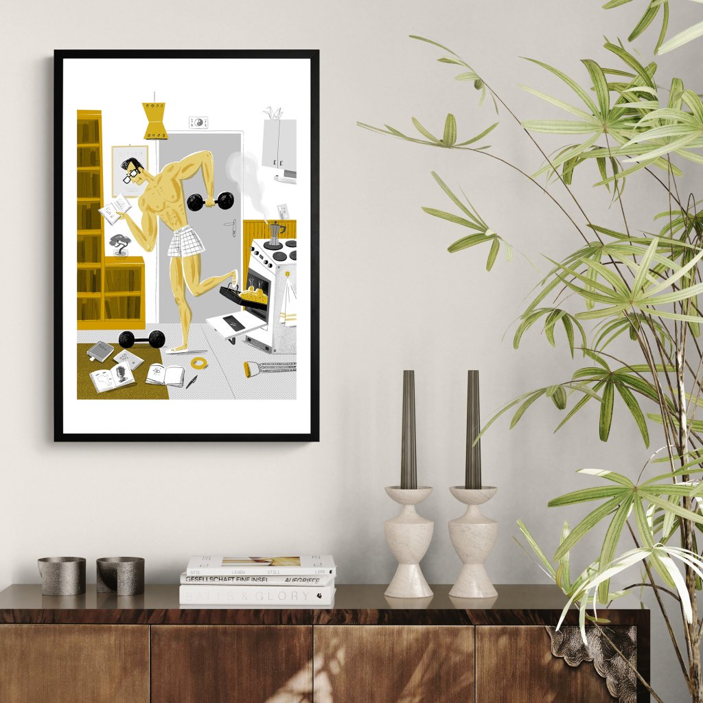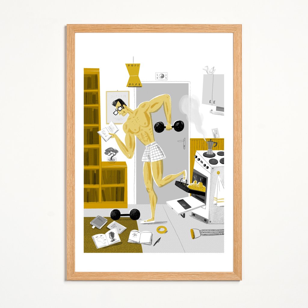 Super muž balancuje mezi cvičením, studiem a domácími povinnostmi v jediné scéně. Styl je výrazně ilustrativní, s humornými detaily a jasnou kompozicí. Ideální do současných interiérů, které mají rády chytrý humor a vizuální nadsázku.