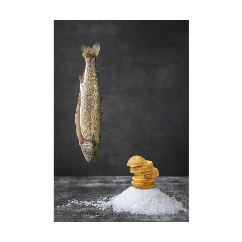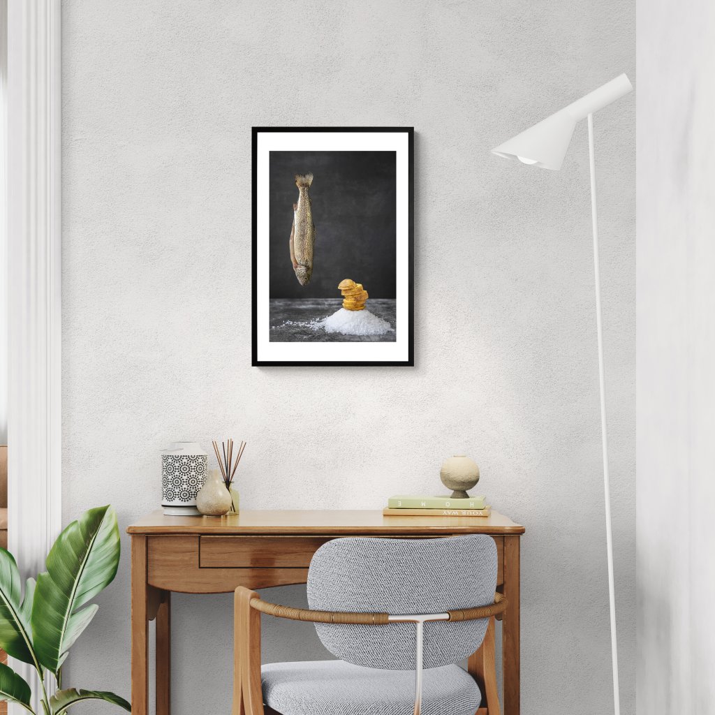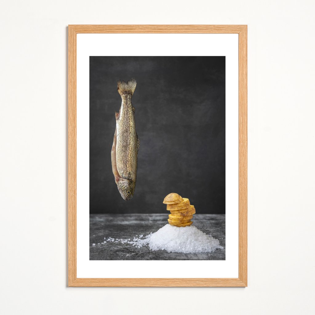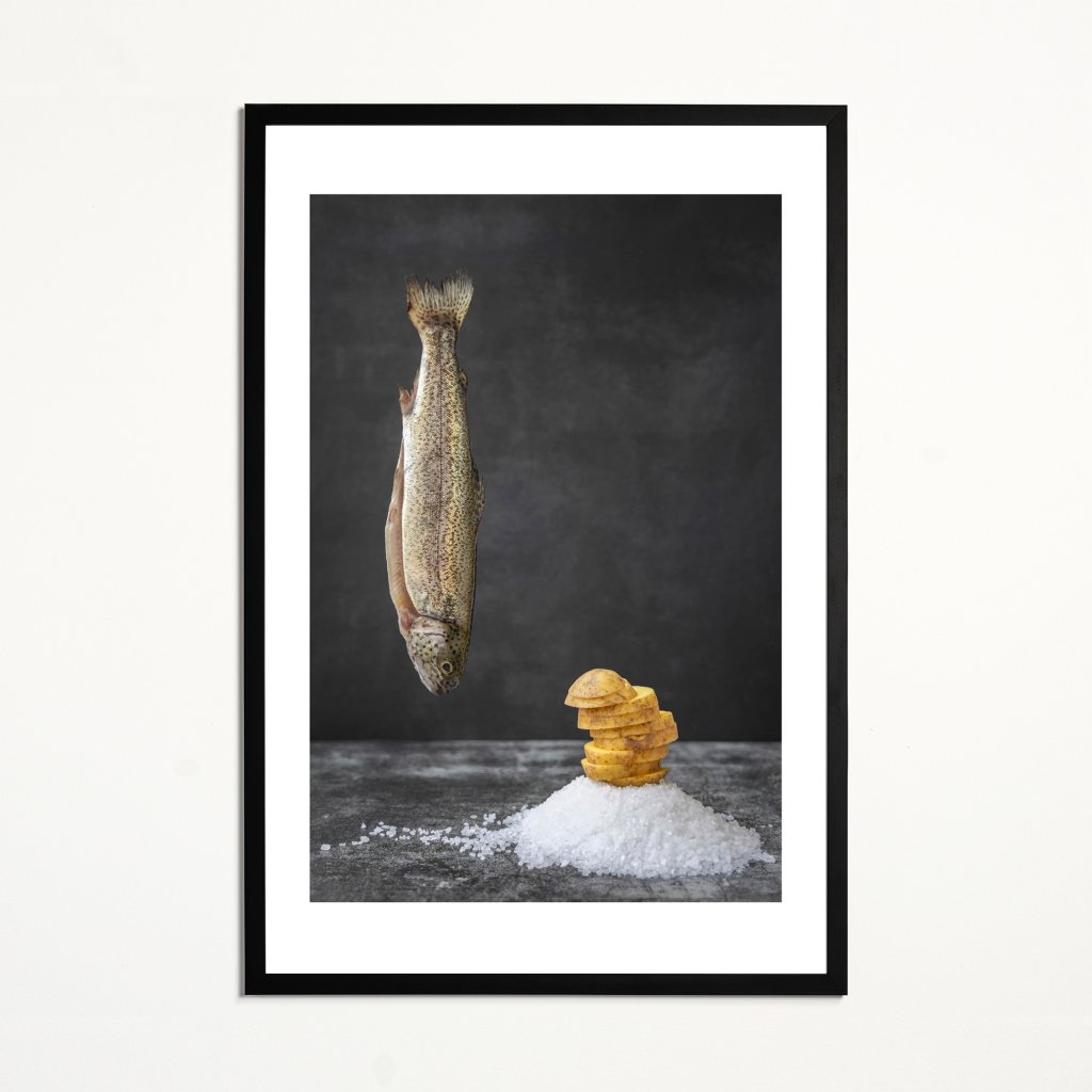 Obraz staví na kontrastu surových ingrediencí a precizní kompozice, kde každý prvek má své místo i váhu. Vertikální linie ryby vyvažuje geometrie soli a rytmus krájených brambor, čímž vzniká tichý dialog mezi přírodou a zároveň ingrediencemi k večeři. Celková atmosféra je střídmá, téměř meditativní, ale také s lehkým vtipem. Dílo skvěle funguje v moderních kuchyních, jídelnách i interiérech, které oceňují konceptuální minimalismus.