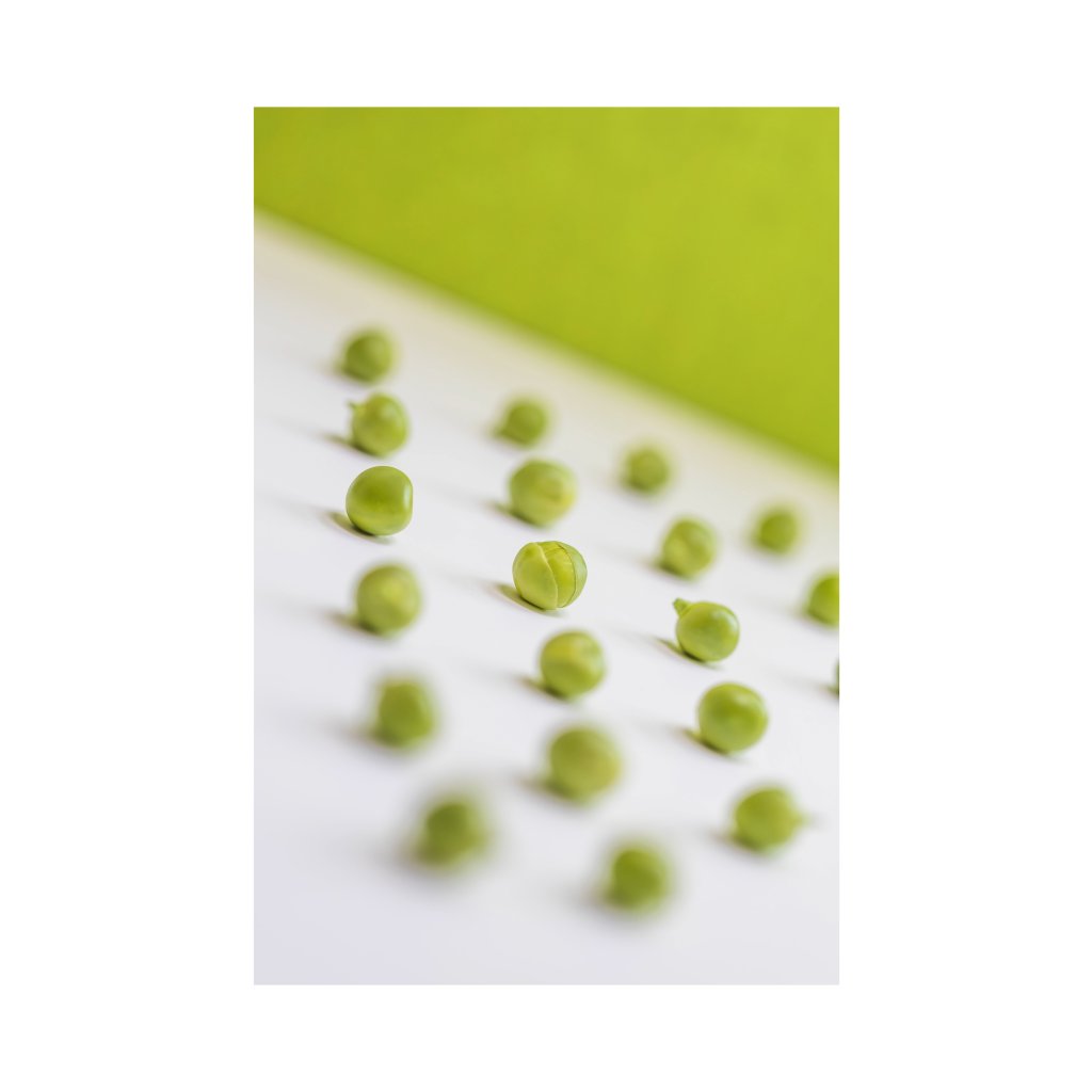 Kompozice mladých hrášků s pozadím stejné barvy stojí na jemném narušení pravidelnosti v popředí, díky čemuž obraz nepůsobí staticky. Mělká hloubka ostrosti vede oko diváctva napříč obrazem a zdůrazňuje rytmus. Celková nálada je ryze svěží a čistá. Skvěle zafunguje v moderních interiérech, restauracích, kavárnách a prostorech, kde je důležitá vizuální lehkost.