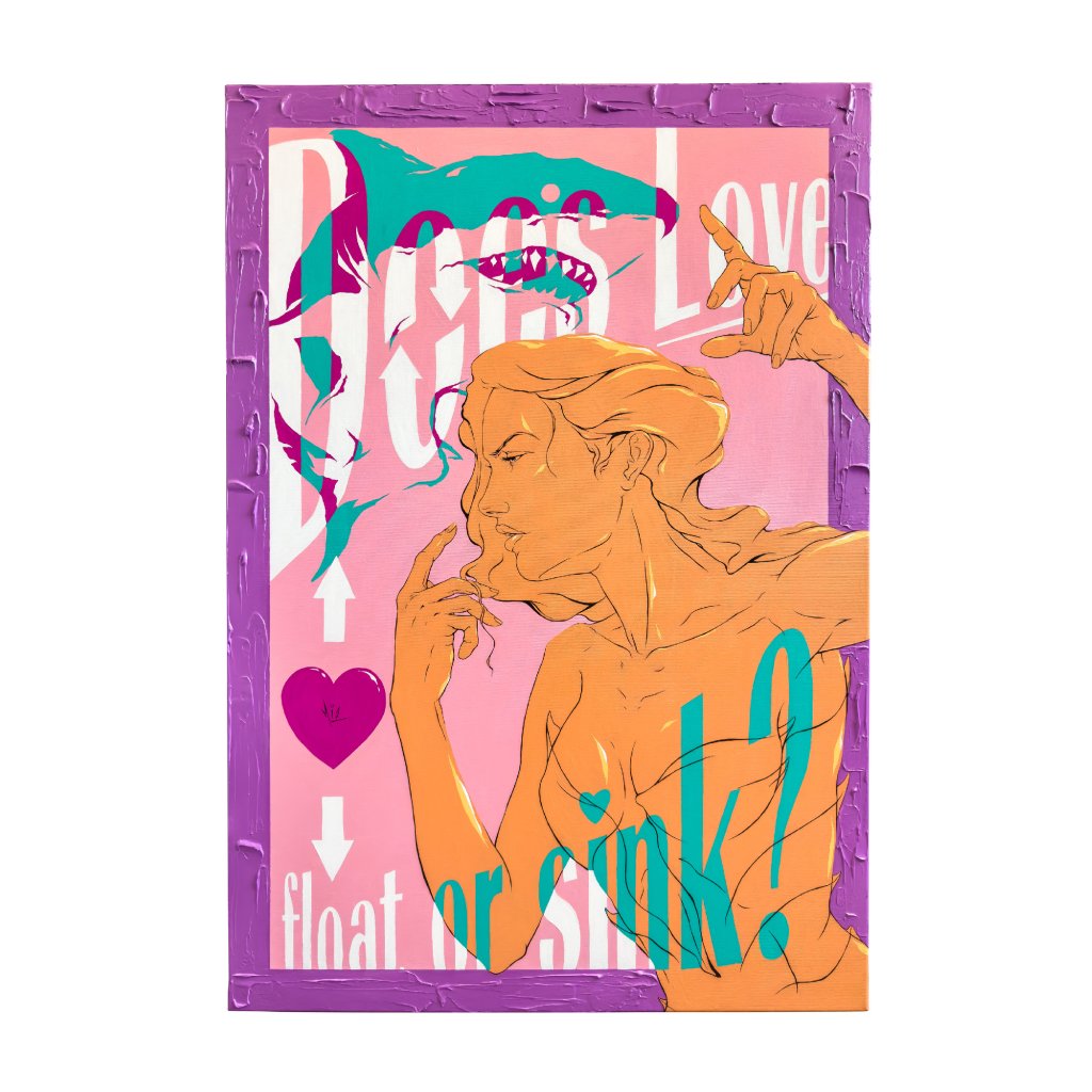 Obraz kombinuje figurativní motiv s typografickými a symbolickými prvky, které společně vytvářejí vizuální dialog o křehkosti vztahů. Láska zde není romantickým ideálem, ale stavem rovnováhy mezi nadnášením a tíhou (float or sink). Kontrastní barvy a výrazná kompozice udržují pozornost a nutí diváka hledat vlastní odpověď. Dílo se přirozeně uplatní v moderních interiérech, kde má obraz nejen zdobit, ale i klást otázky.