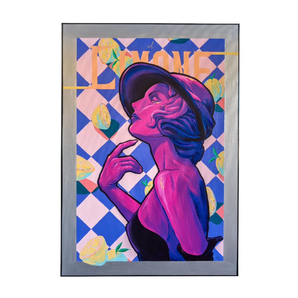 Motiv citronu zde nepůsobí jako pouhá zátiší reference, ale jako symbol intenzity, kontrastu a života. Výrazná barevnost a stylizovaná ženská figura vytvářejí atmosféru, která balancuje mezi požitkem a napětím. Obraz evokuje středomořskou lehkost a zároveň si zachovává lehce ironický odstup. Dílo vnese do prostoru energii, hravost a výraznou vizuální identitu, aniž by působilo prvoplánově.