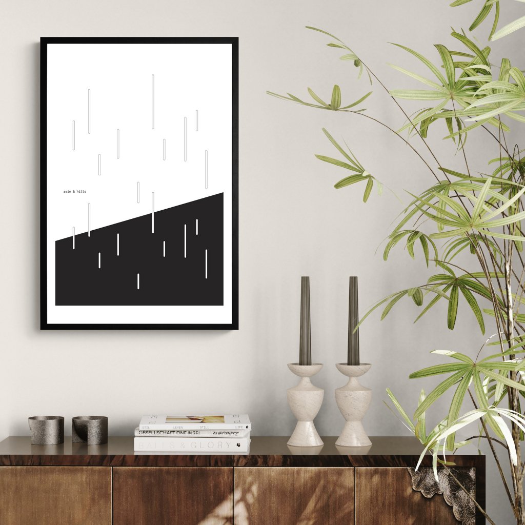 Ve světlejší variantě motivu deště pracuje Tejkl s větším množstvím prázdného prostoru, takže působí více otevřeně a klidně. Déšť tady není melancholický, ale osvěžující, přináší pocit čistoty a jednoduchosti. Dílo se dobře uplatní ve světlých interiérech, kancelářích nebo chodbách, kde dodá prostoru rytmus, aniž by ho zahltilo.