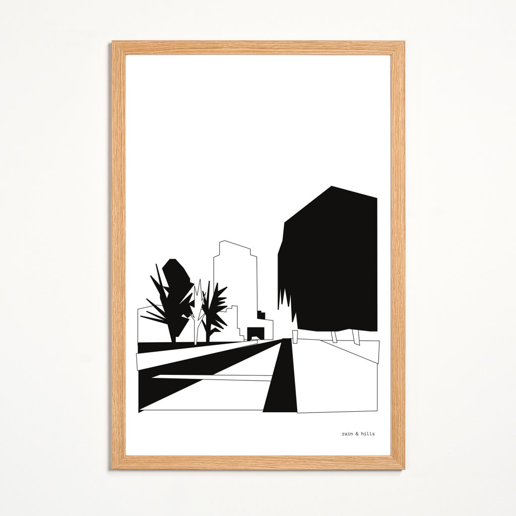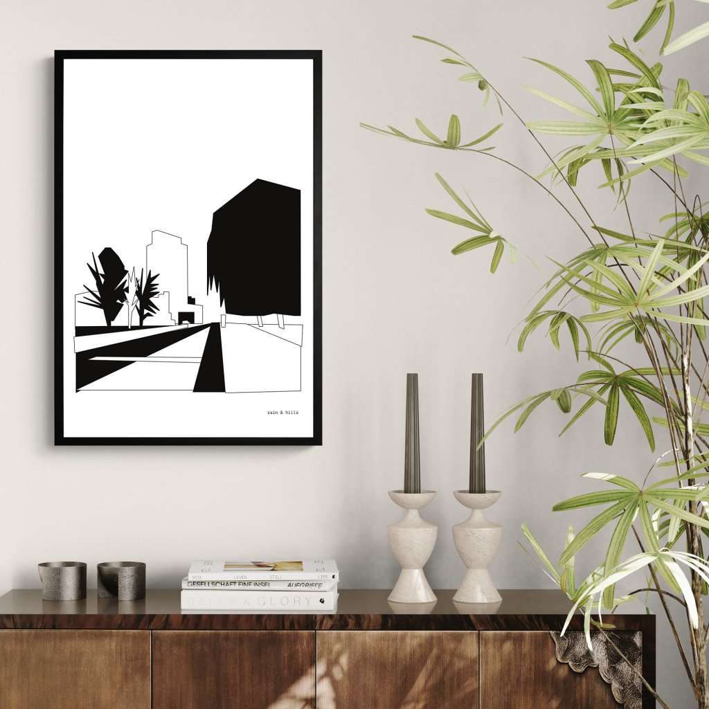 Kompozice připomíná klidné místo někde na okraji města, kde se setkává struktura s volností. Grafika je vyrovnaná a přehledná, dává prostoru řád a zároveň nechává prostor pro vlastní interpretaci. Zafunguje v obývacím pokoji nebo jídelně, kde vytvoří klidný vizuální střed bez potřeby silných barev.