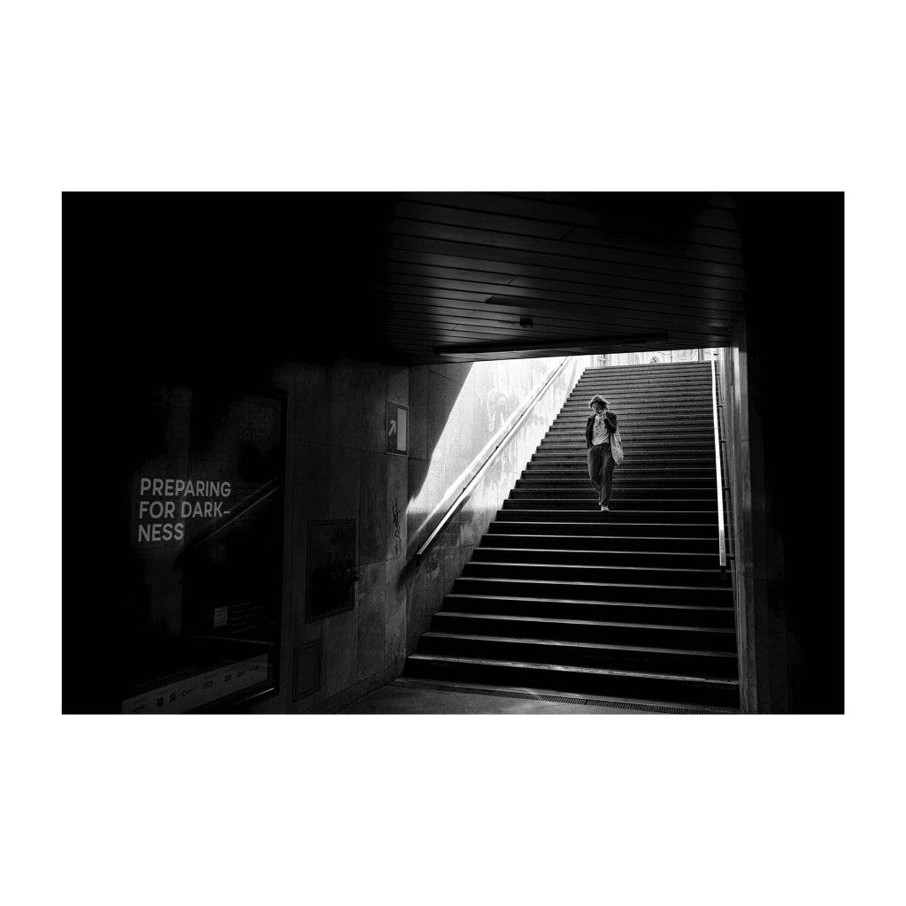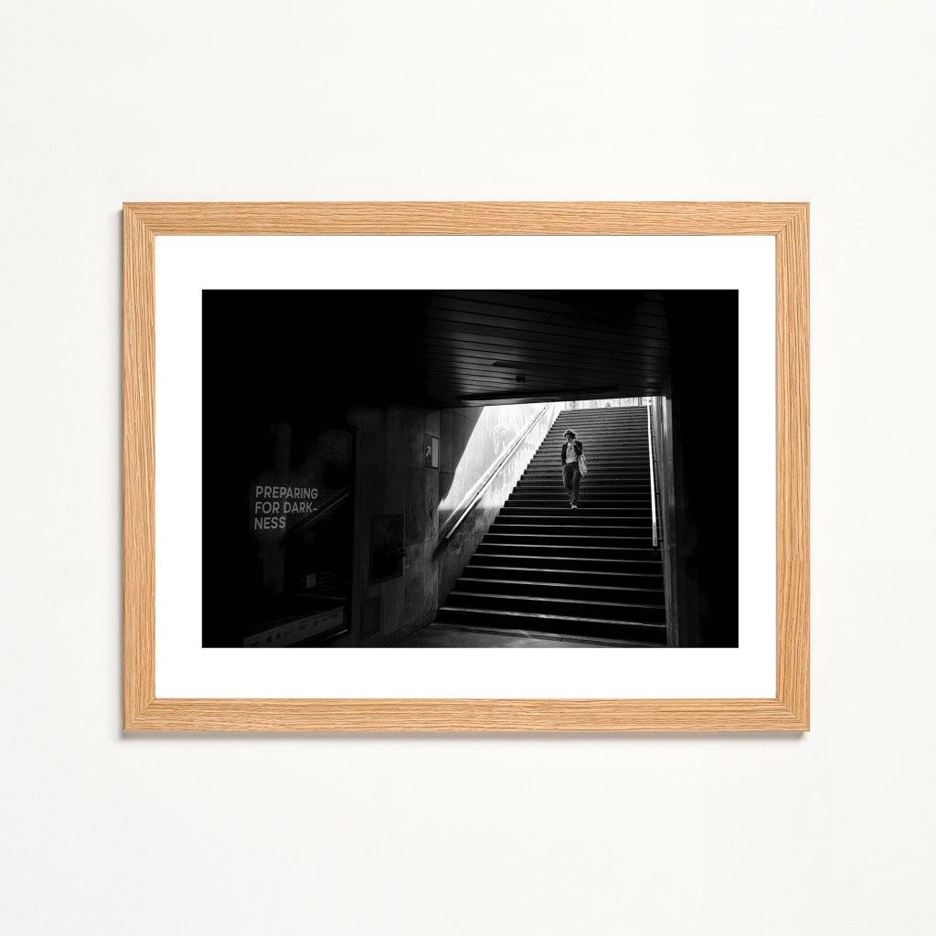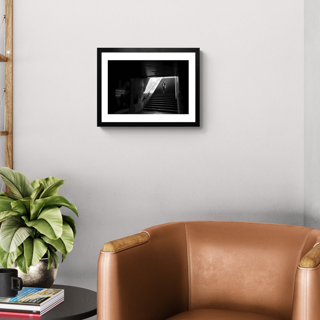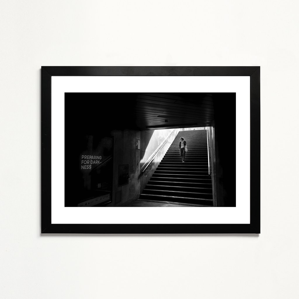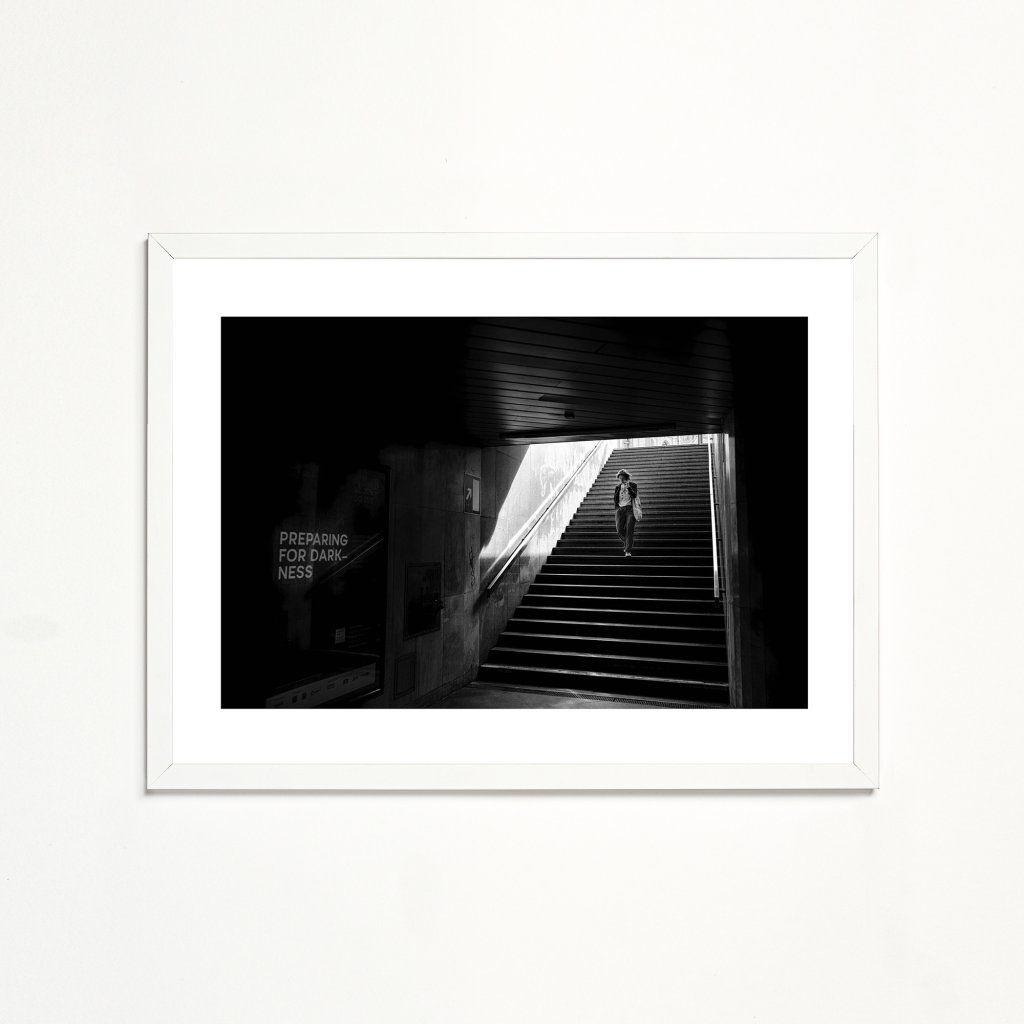 Kompozice staví na ostrém kontrastu temného prostoru a světla, které vede oko diváka vzhůru. Postava v pohybu dodává scéně lidský rozměr a pocit křehkosti. Atmosféra je syrová, introspektivní a lehce zneklidňující. Fotografie bude silně fungovat v minimalistických interiérech.