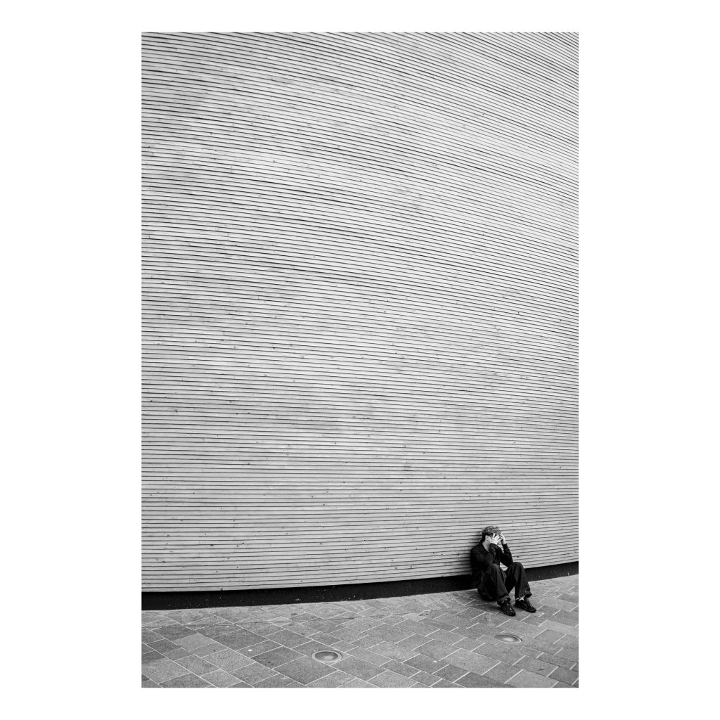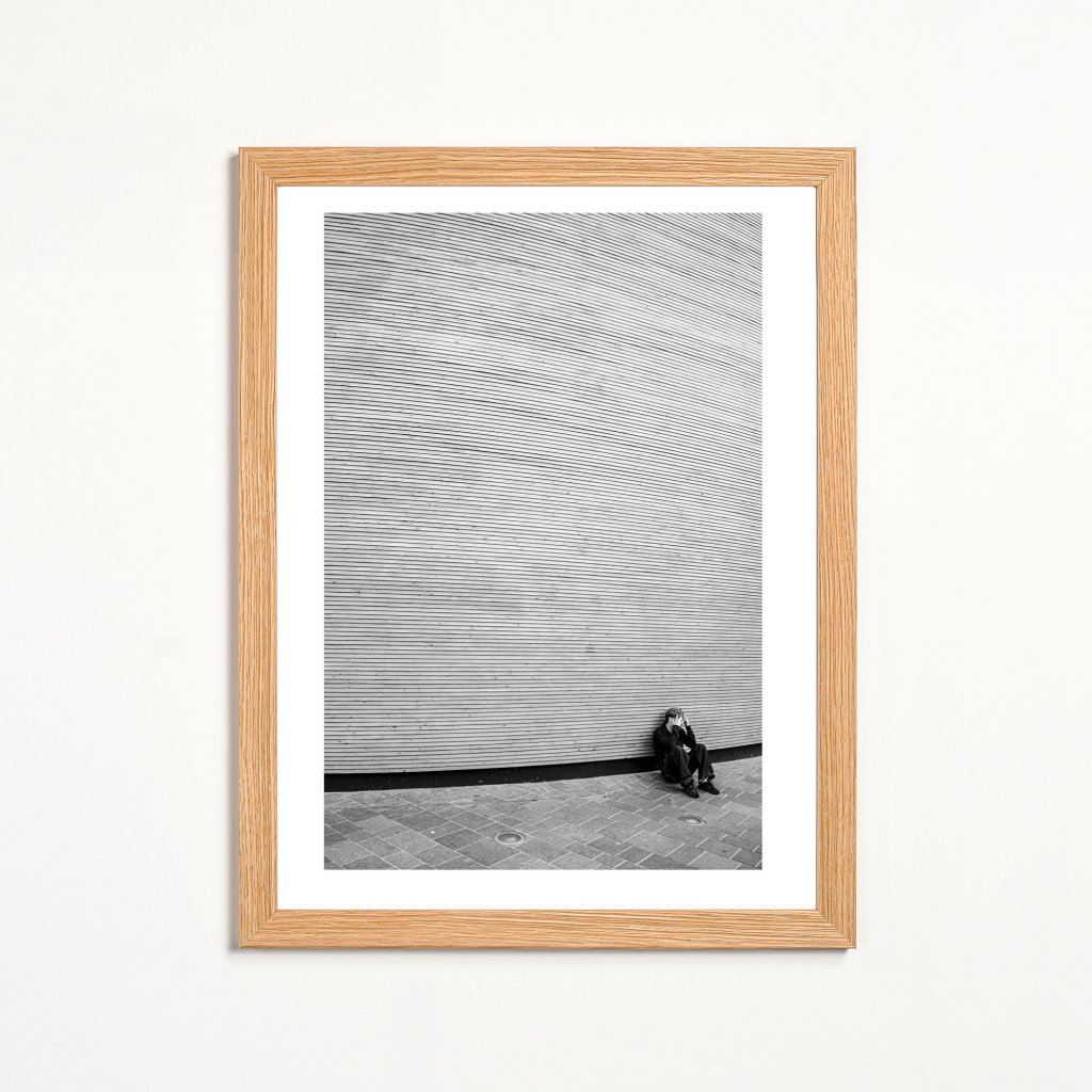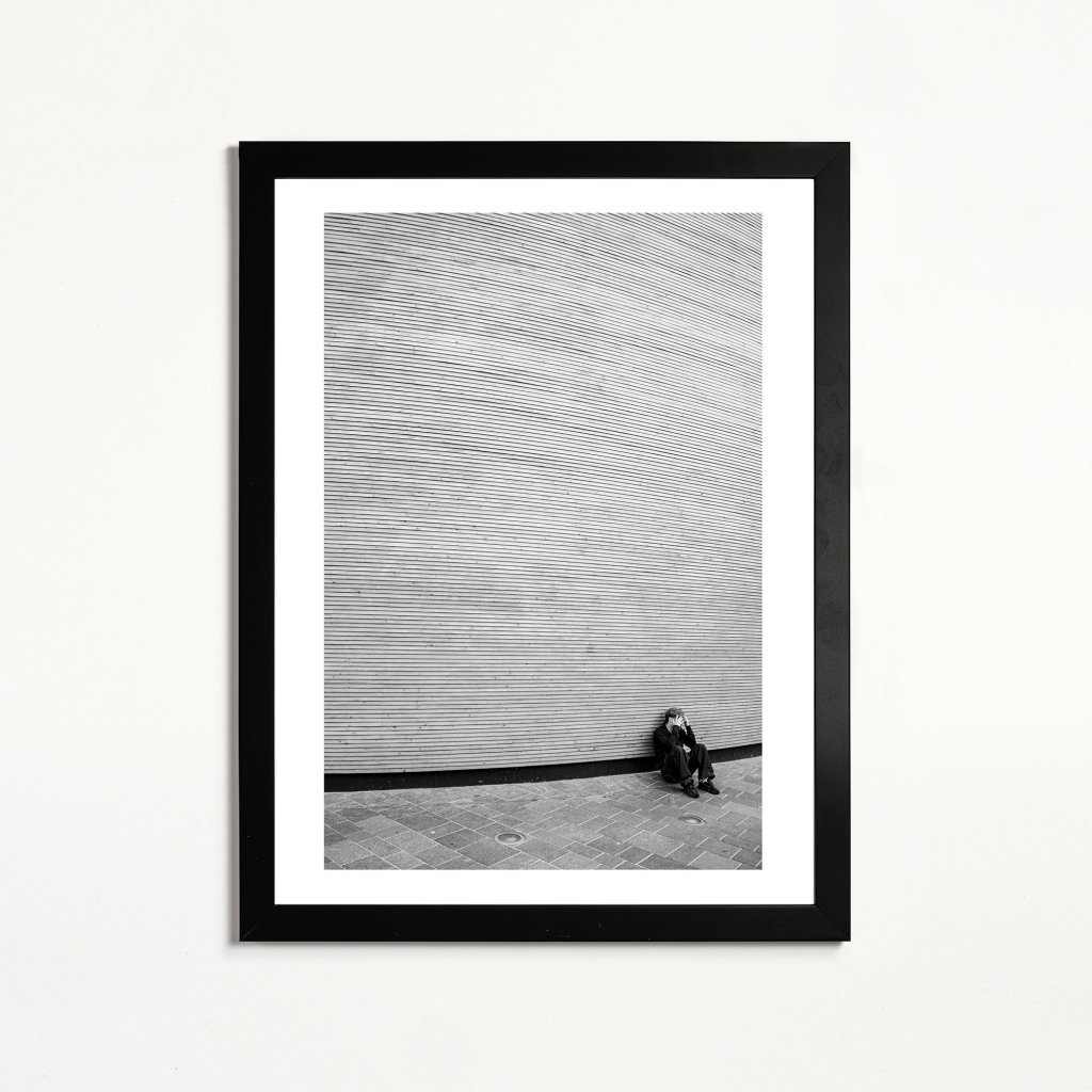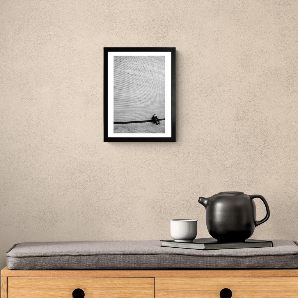 Fotografie vévodí opakování jemných linií, které vyplňují téměř celý prostor. Malá lidská postava s vyčerpaným či nešťastným gestem dodává celku měřítko, ale hlavně silnou emoci. Výsledkem je meditativní scéna s výraznou grafickou silou. Skvěle zapadne do moderních, světlých interiérů nebo kanceláří.