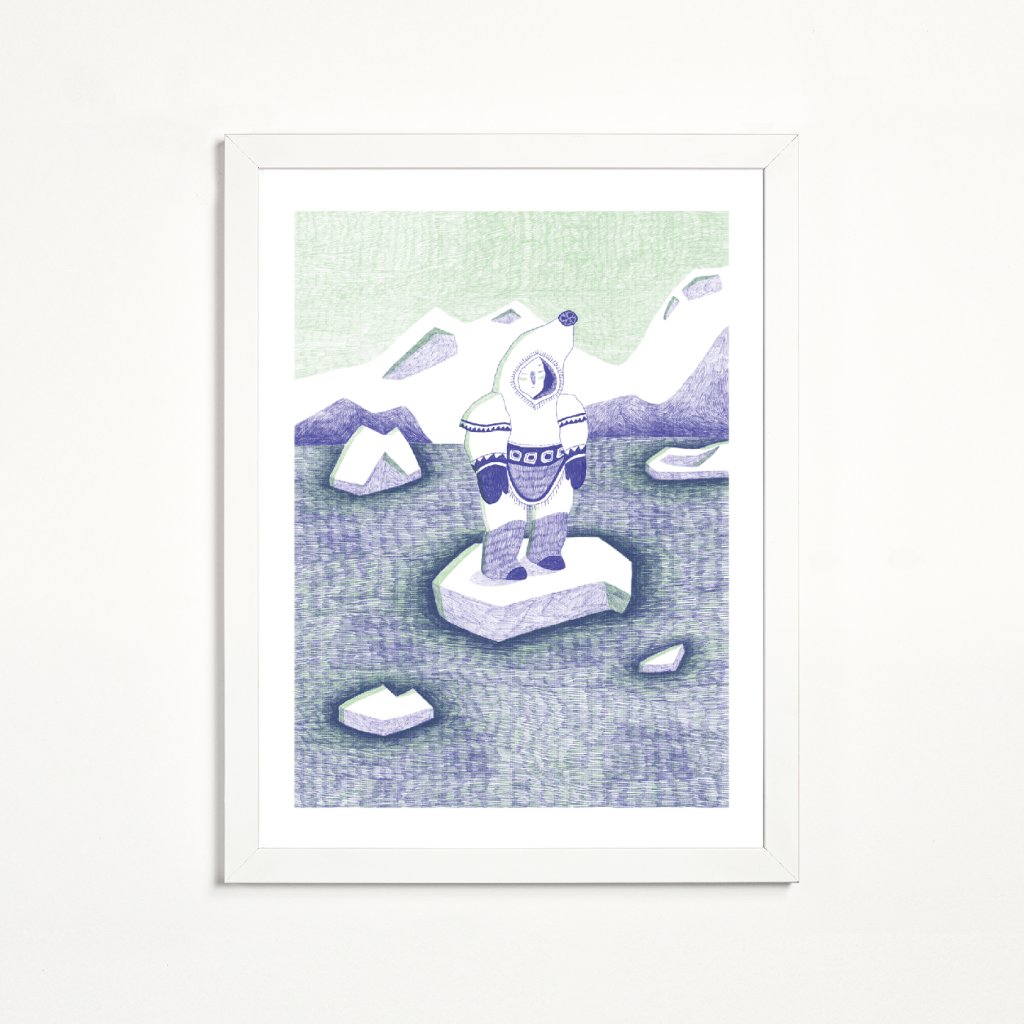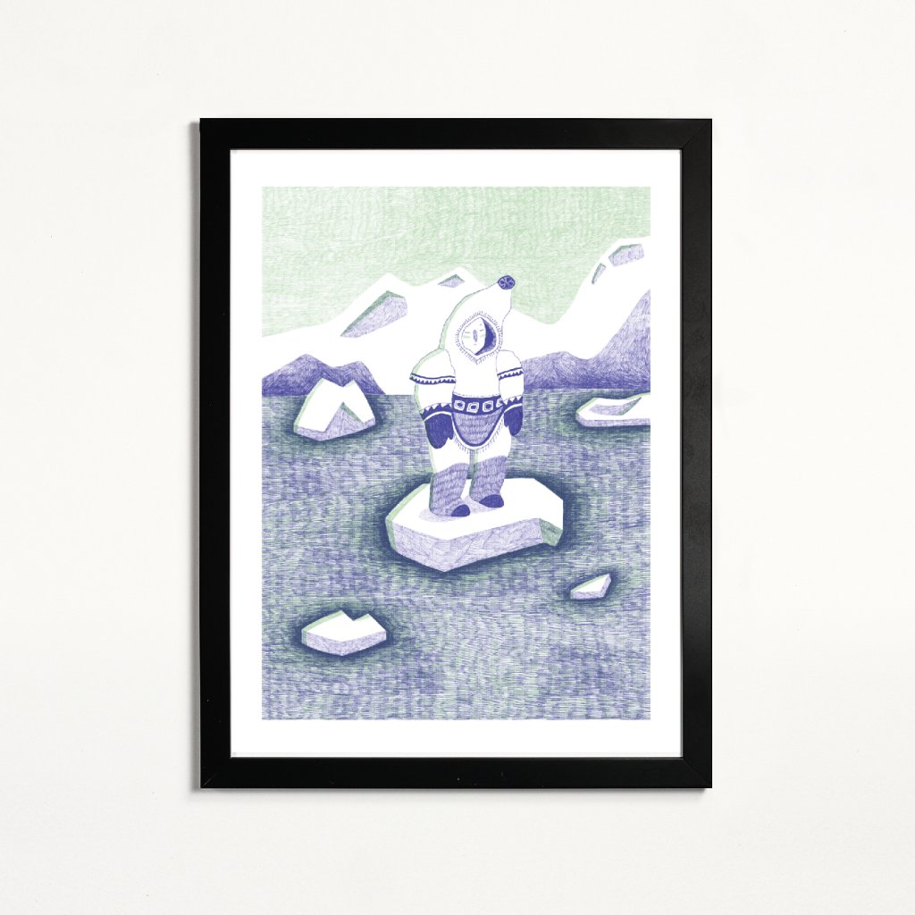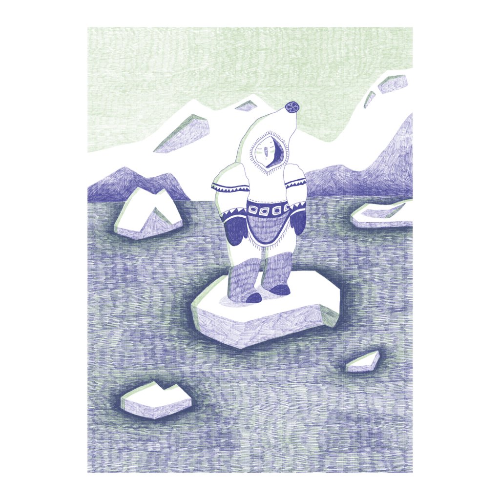 Dílo pracuje s jemnou linkou a tlumenou kombinací zelenkavých a fialových tónů, které scéně dodávají tichou a zasněnou atmosféru. Osamělá postava stojící na ledové kře působí křehce, ale současně odhodlaně, jako symbol vnitřního klidu i schopnosti obstát v nehostinném prostředí. Ledová krajina a jednoduchá stylizace vytvářejí obraz, který je vizuálně čistý, poetický a velmi citlivý.