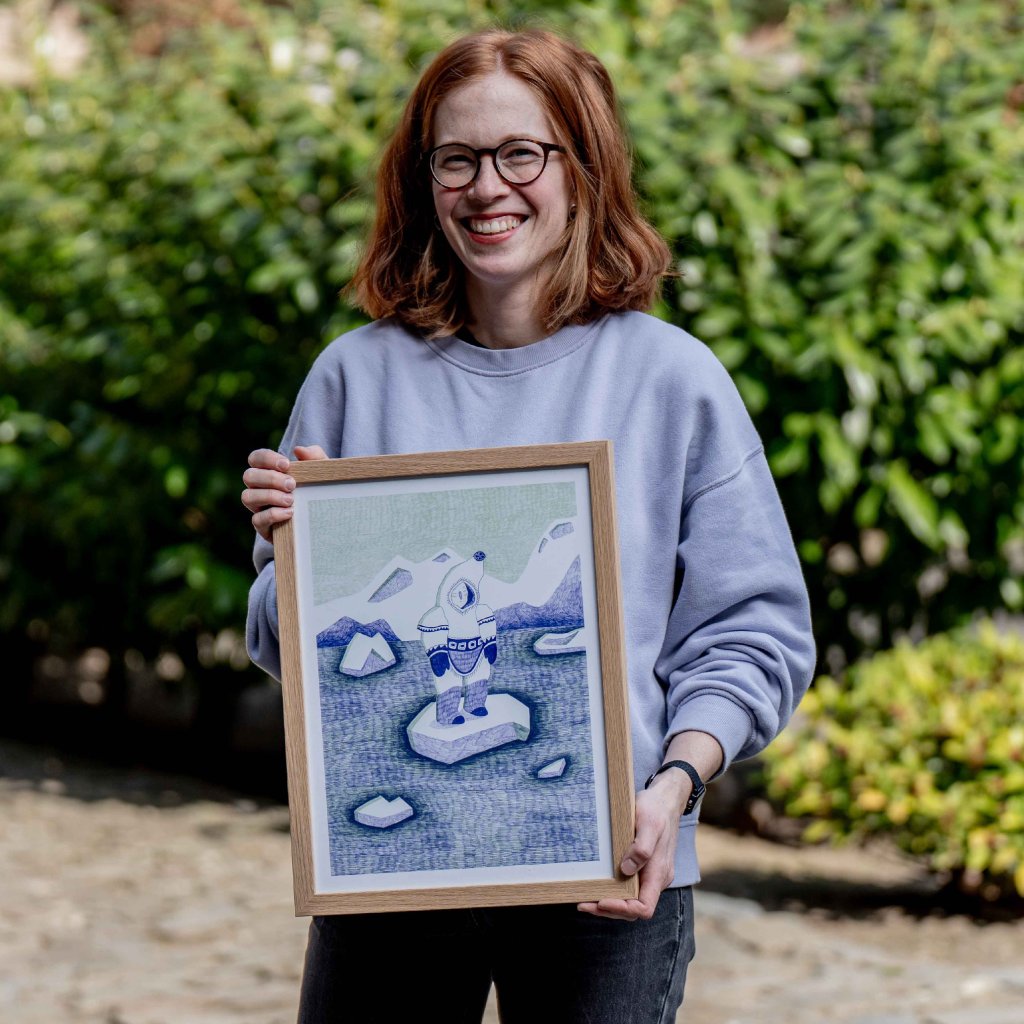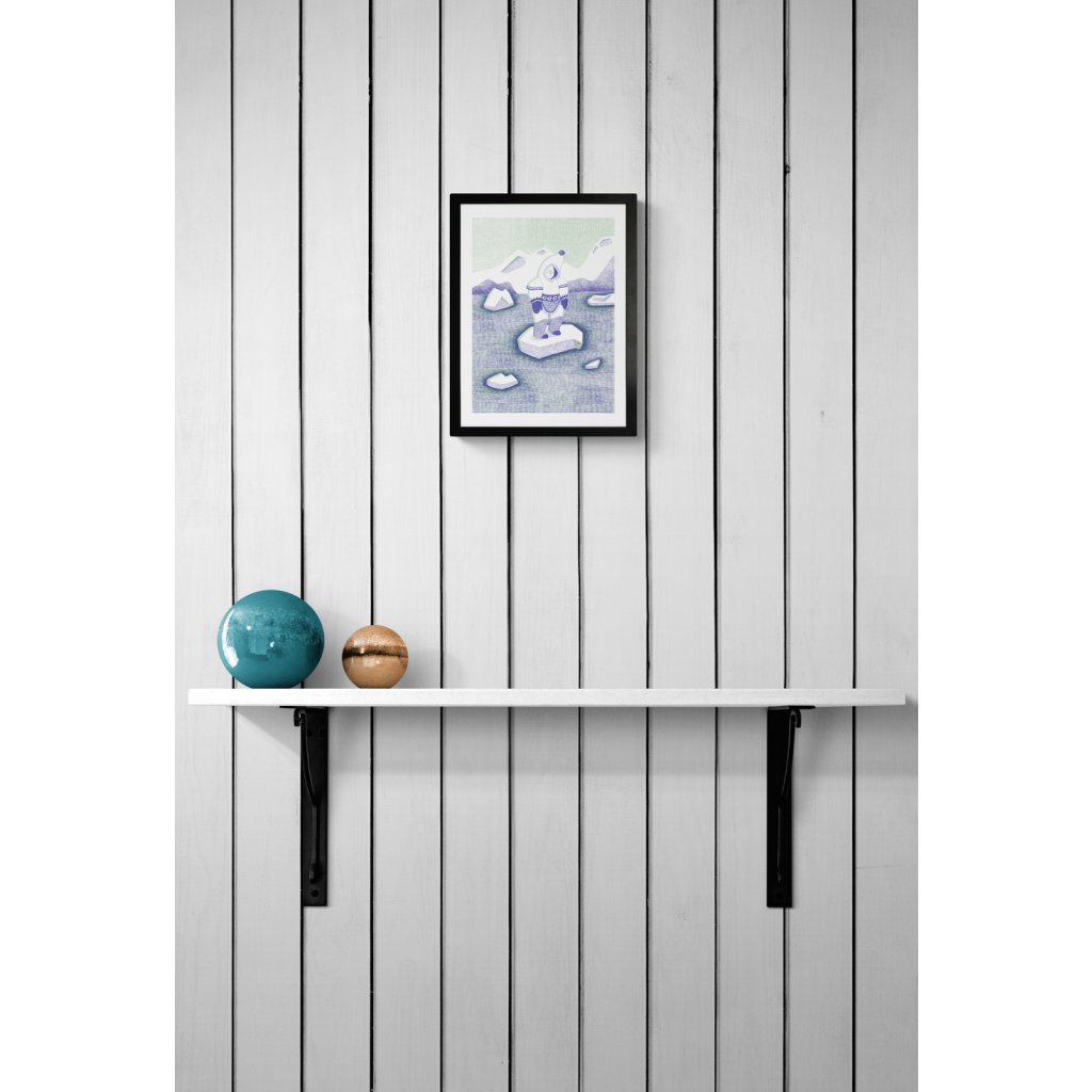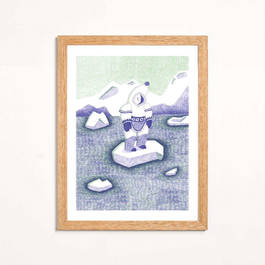 Dílo pracuje s jemnou linkou a tlumenou kombinací zelenkavých a fialových tónů, které scéně dodávají tichou a zasněnou atmosféru. Osamělá postava stojící na ledové kře působí křehce, ale současně odhodlaně, jako symbol vnitřního klidu i schopnosti obstát v nehostinném prostředí. Ledová krajina a jednoduchá stylizace vytvářejí obraz, který je vizuálně čistý, poetický a velmi citlivý.