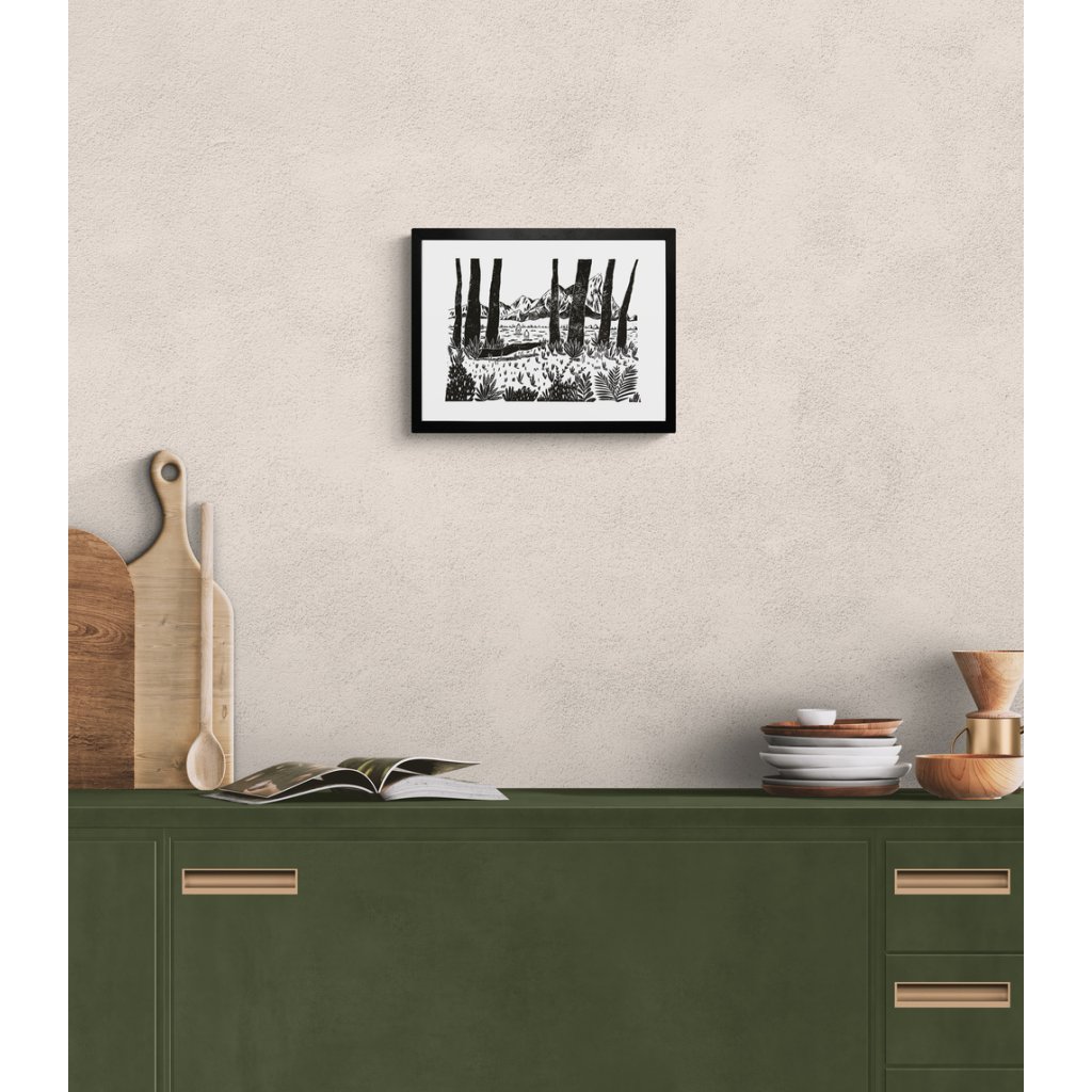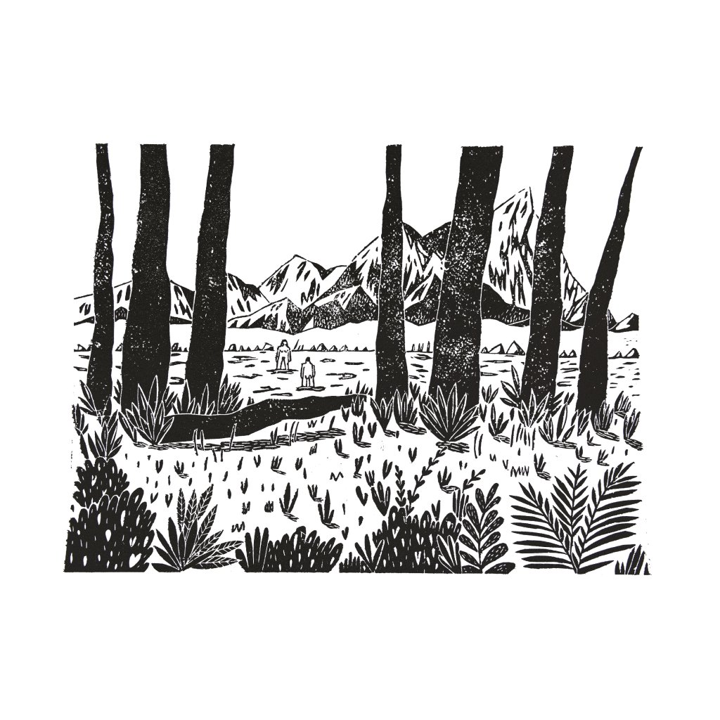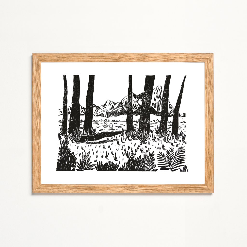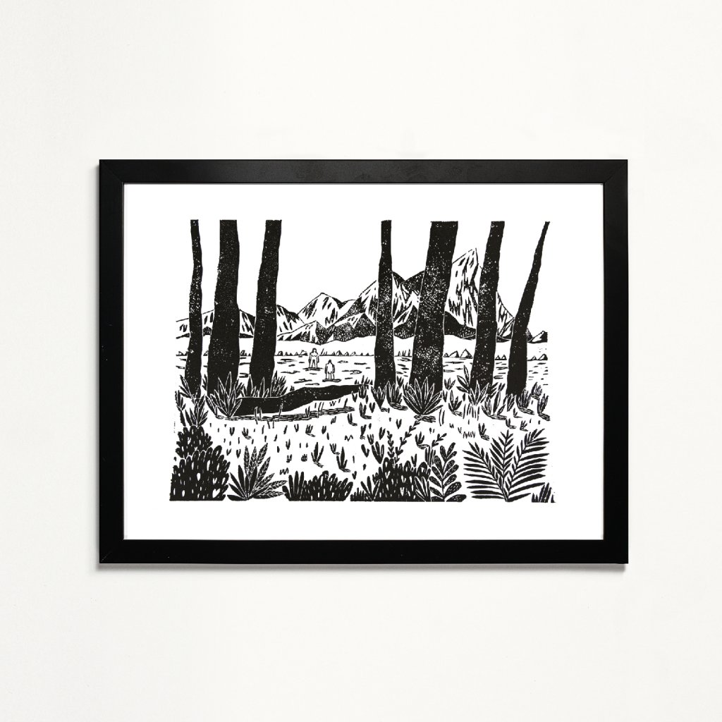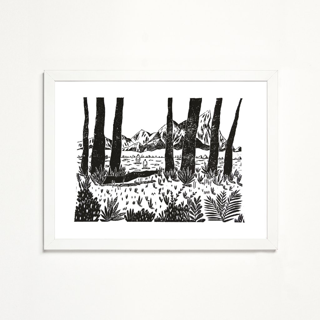 Ilustrace staví na silném kontrastu černé a bílé a připomíná linoryt s výrazným rytmem tvarů a struktur. Stromy v popředí rámují pohled do horské krajiny, kde drobné nahé postavy ve vodě působí nenápadně, ale o to silněji zdůrazňují vztah člověka a přírody. Print vyzařuje klid, čistotu a zvláštní druh soustředění, který známe z tichých okamžiků mimo ruch města.