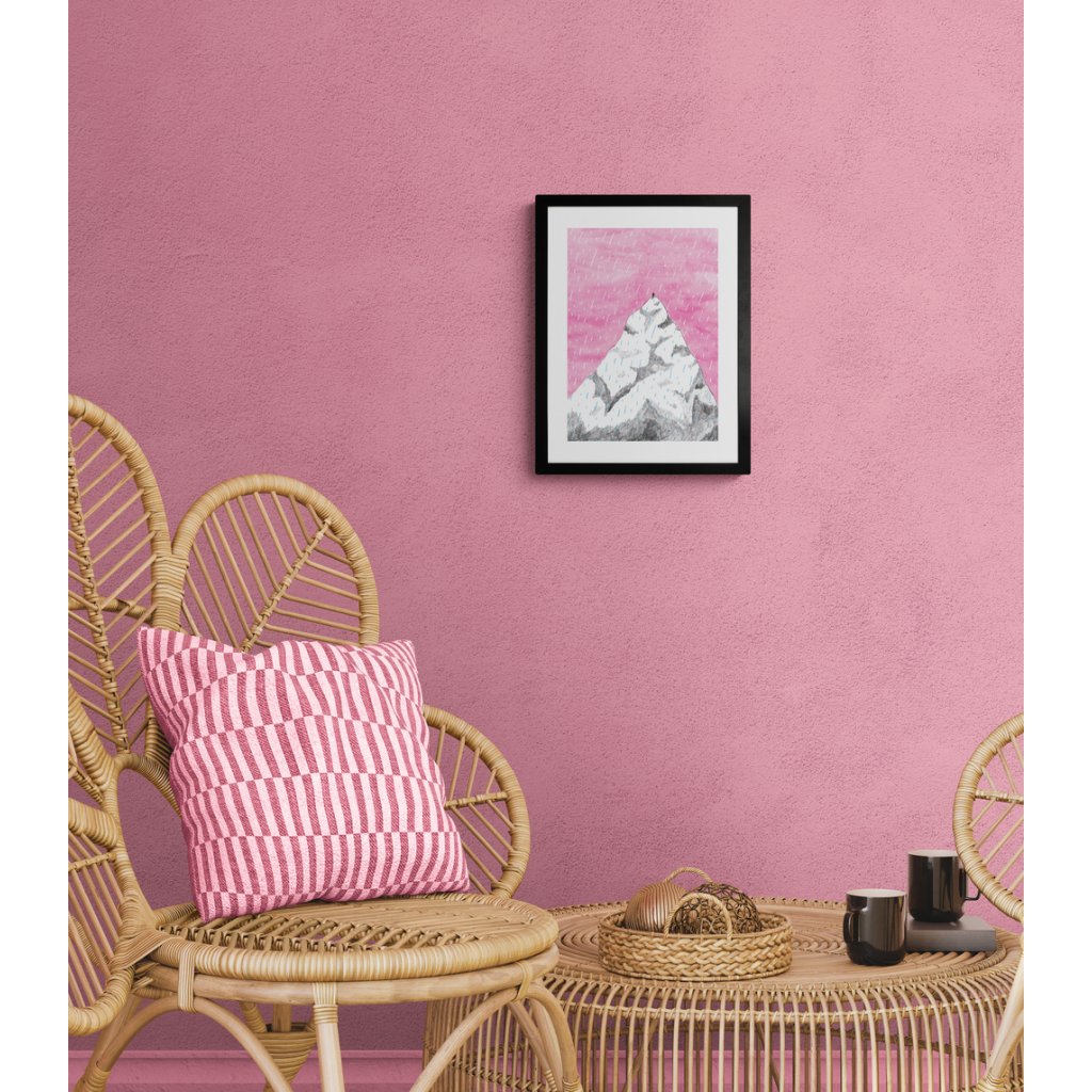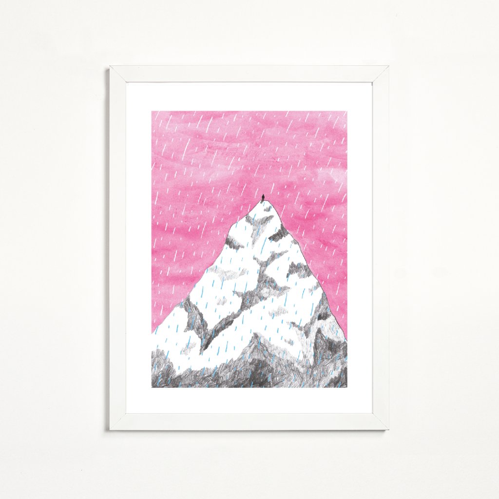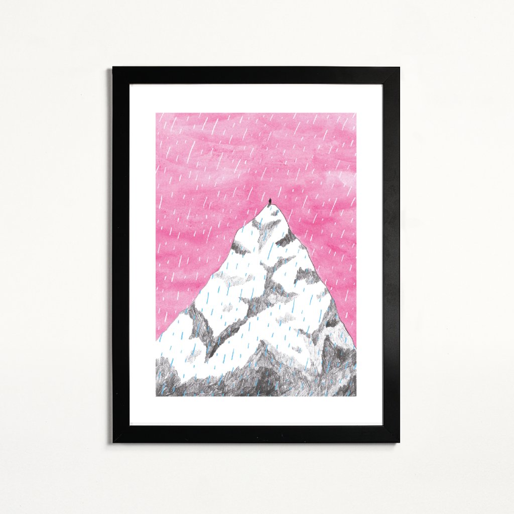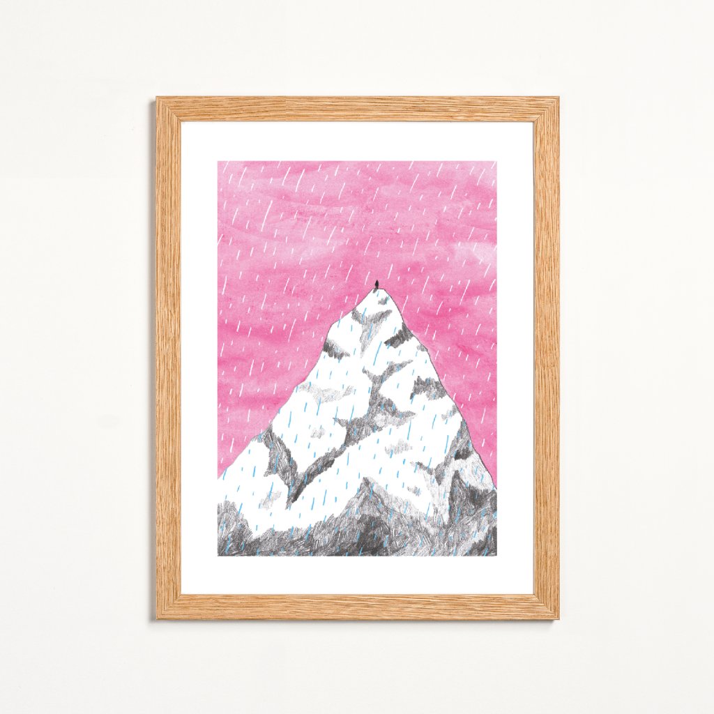 Jednoduchá, ale silnou kompozice, v níž monumentální hora kontrastuje s malou lidskou postavou. Výrazná růžová obloha dodává scéně nečekanou emocionalitu a posouvá horský motiv k poetické výpovědi o cestě, odhodlání a vnitřní síle. Kresba působí čistě, lehce a současně velmi intenzivně, protože nechává vyniknout prostor, ticho i výšku. Hodí se do interiérů, kde chcete otevírat perspektivu a připomínat, že i velké výstupy začínají jedním krokem.