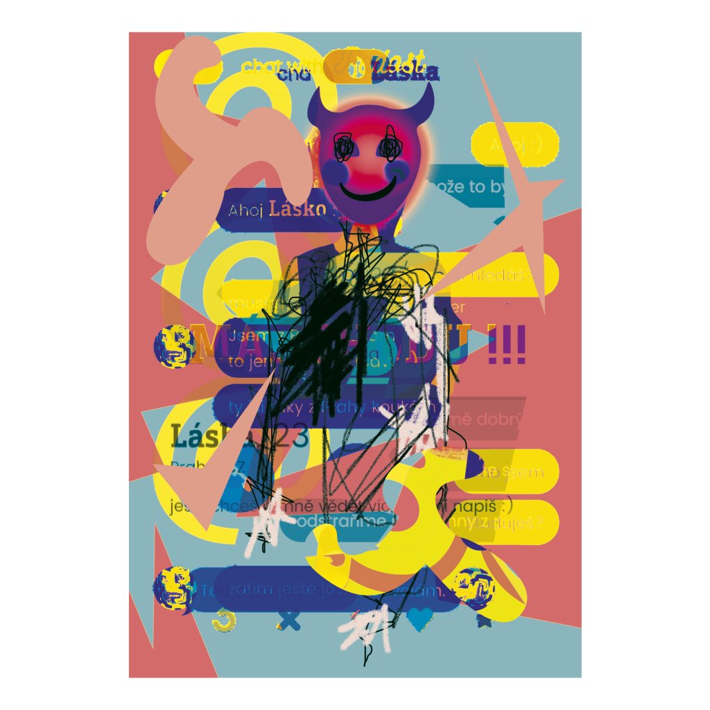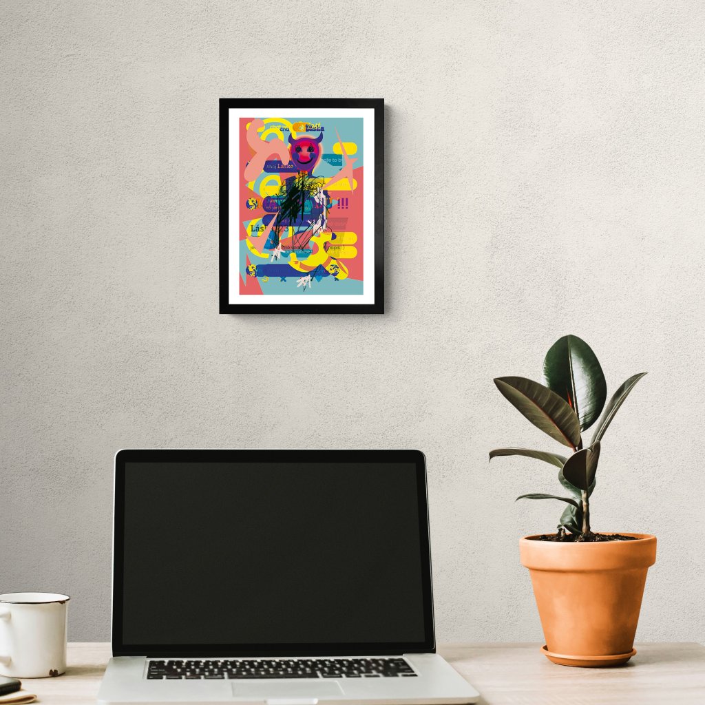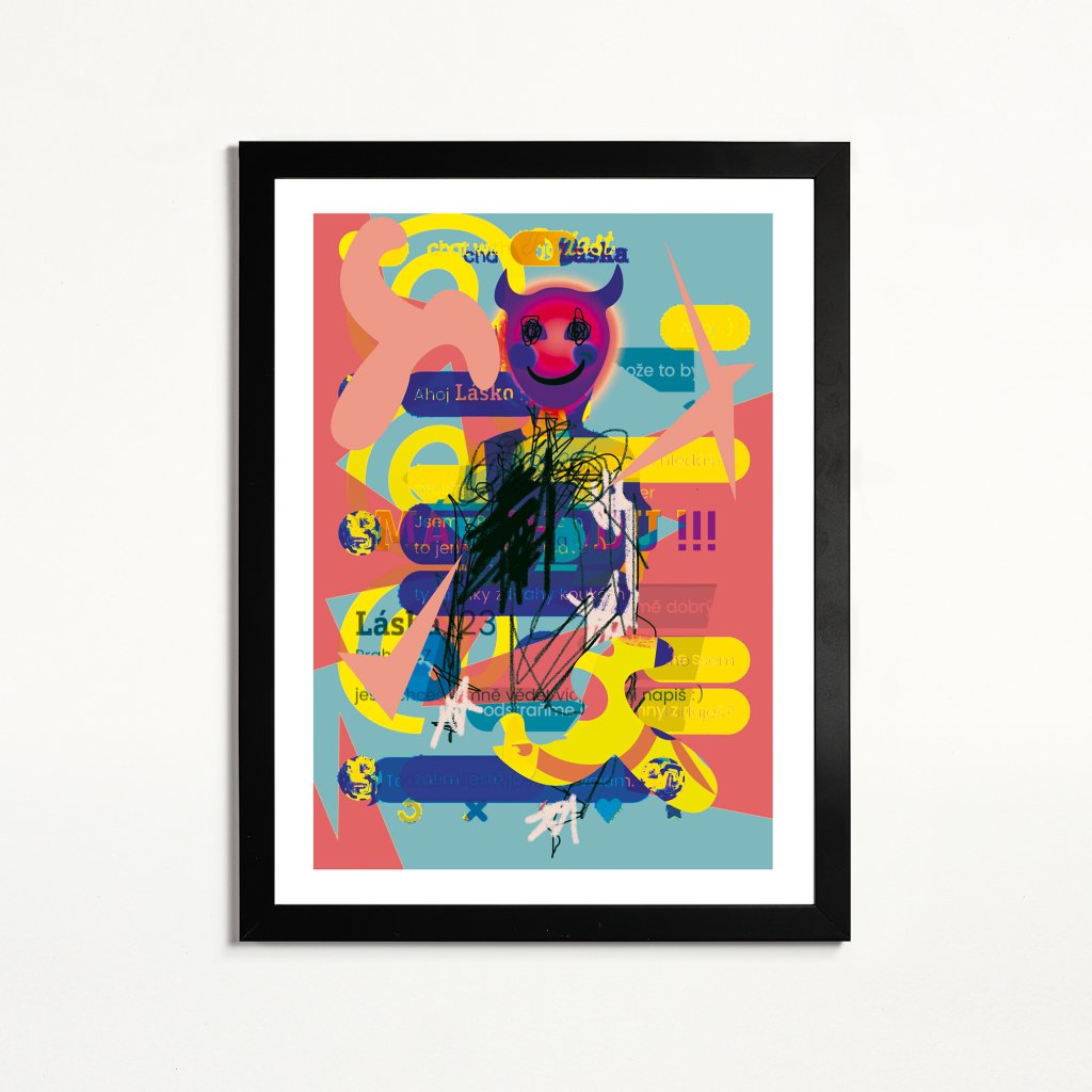 Digitální grafika plná barev, (rádoby)romantických vzkazů a abstraktních tvarů, které dohromady tvoří hustou vizuální strukturu. Celek působí energicky a současně, bez konkrétního narativu. Velmi současné, energické dílo, které bude nejlépe slušet moderním bytům, kreativní kanceláře a prostorům, které chtějí jasně reflektovat digitální dobu.