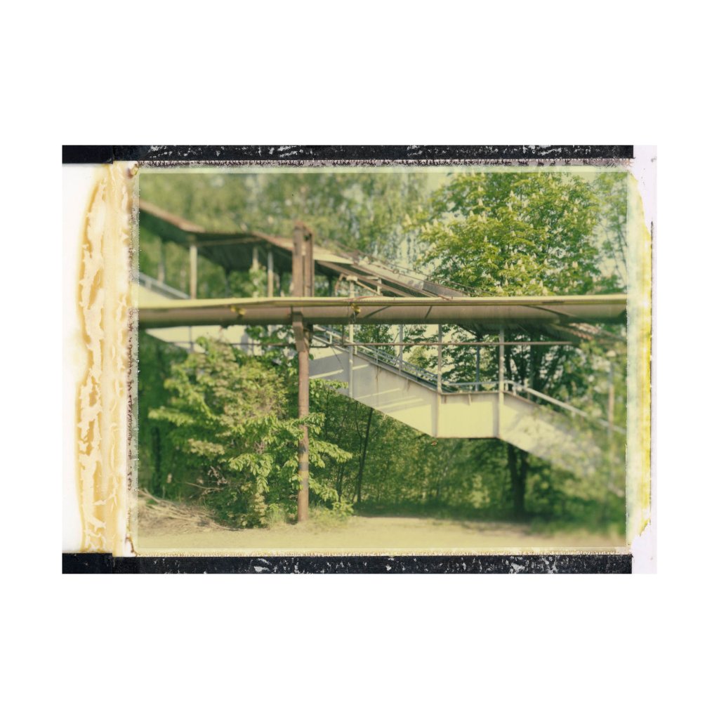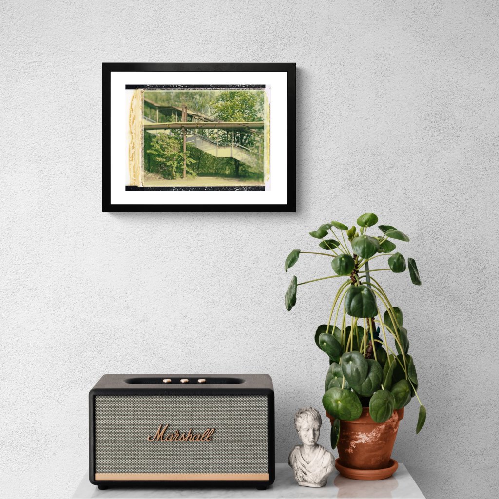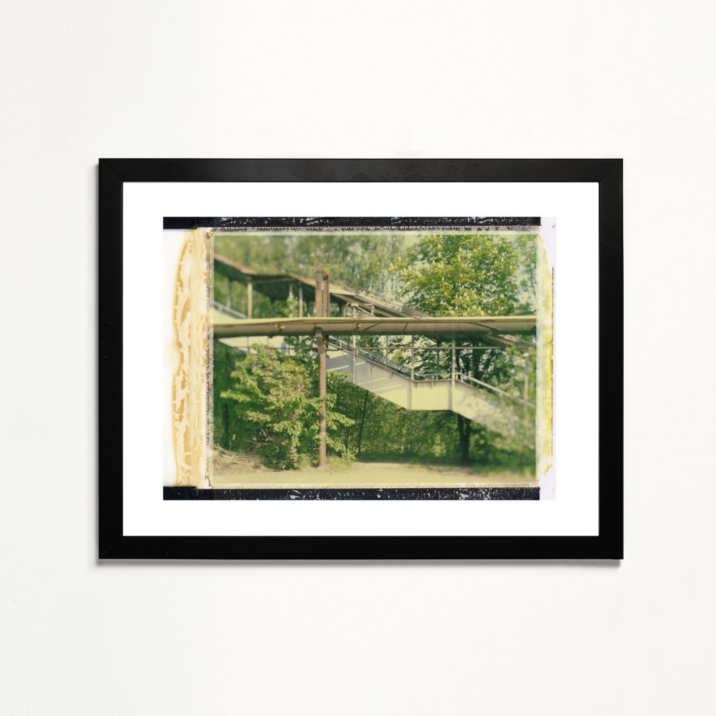 Snímek vrátnice průmyslového areálu v klidné kompozici. Viditelné okraje filmového políčka a nedokonalosti materiálu připomínají fyzický původ fotografie. Stavba je obklopena zelení, která změkčuje její funkční charakter. Fotografie pracuje s horizontálami a klidným rytmem linií. Bude se hodit do interiérů, které ocení analogovou fotografii, architekturu a dokumentární pohled.