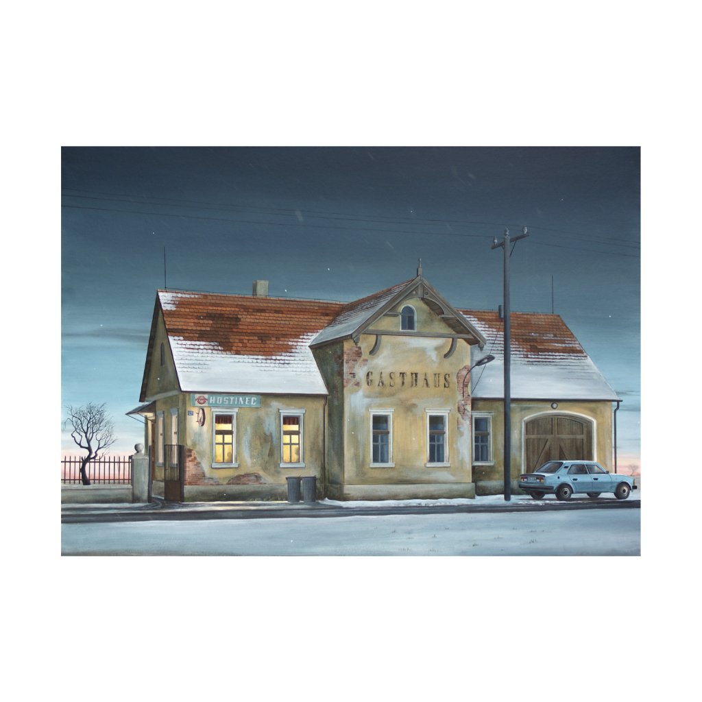 Zimní ulice, stará hospoda a tlumené světlo vytvářejí scénu zimního vesnického večera a kouzla dřívějších dob. Téměř hmatatelně je z něj cítit poletující sníh a útulnost osvětlené místnosti. Dokreslí atmosféru obývacích pokojů, chalup nebo kaváren, kde má umění evokovat vzpomínku a nostalgickou náladu.