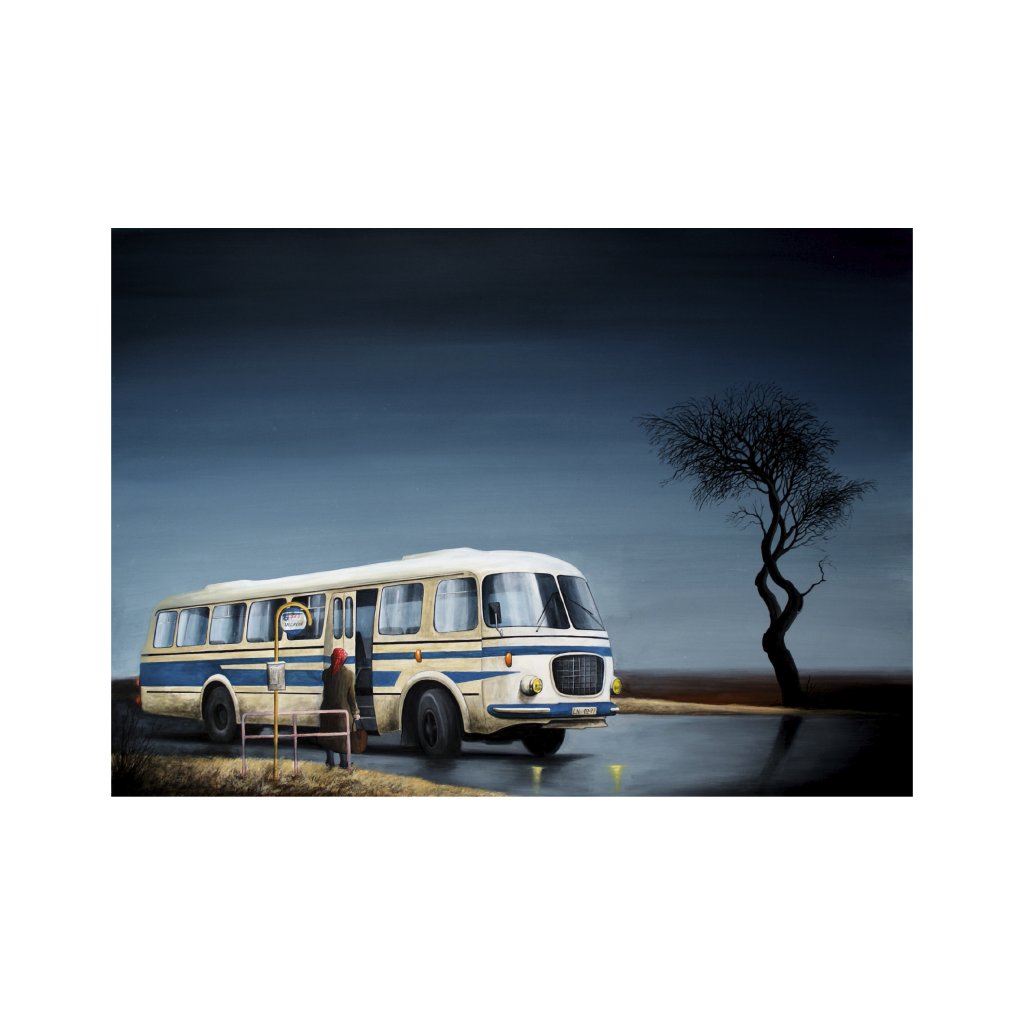 Jiná verze Jirákova motivu zastávky pracuje s jiným světlem a náladou. Vše je o pár stupňů temnější, je po soumraku a taky po dešti. Navíc obraz působí ještě otevřeněji a tišeji, s důrazem na prostor a horizont. Hodí se do interiérů, kde je prostor pro kontemplaci – chodby, pracovny nebo minimalistické obývací pokoje.