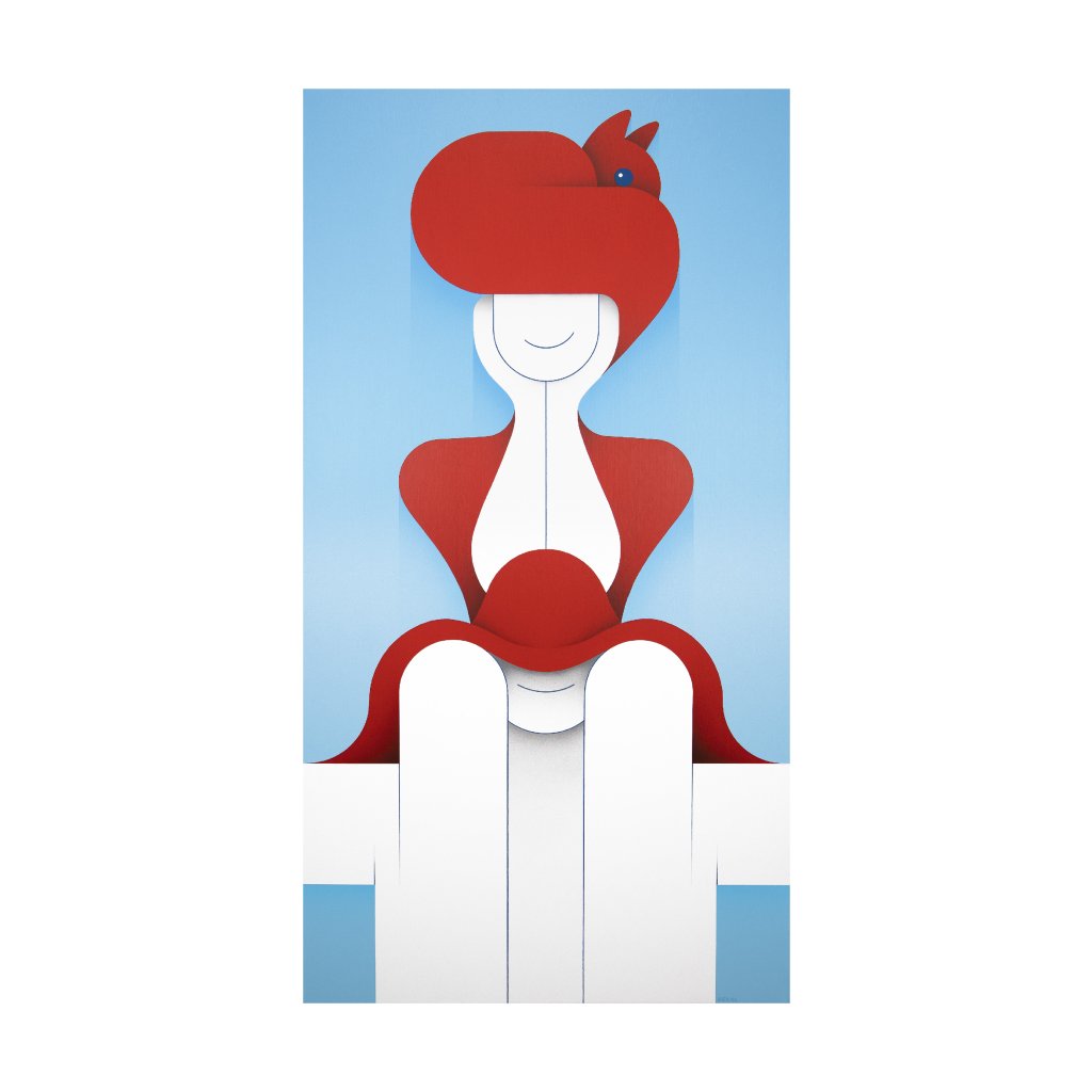 Typická ukázka autorova výtvarného stylu, kdy pomocí několika čistých linií a minima barev dokáže vytvořit dokonale propojené postavy, které nepostrádají vtip a nadsázku. Geometrická jednoduchost a čisté barevné plochy dávají obrazu stabilitu a klid. Malba přinese optimismus a odlehčení kamkoliv od obývacích pokojů a pracoven až po veřejné, společné prostory.
