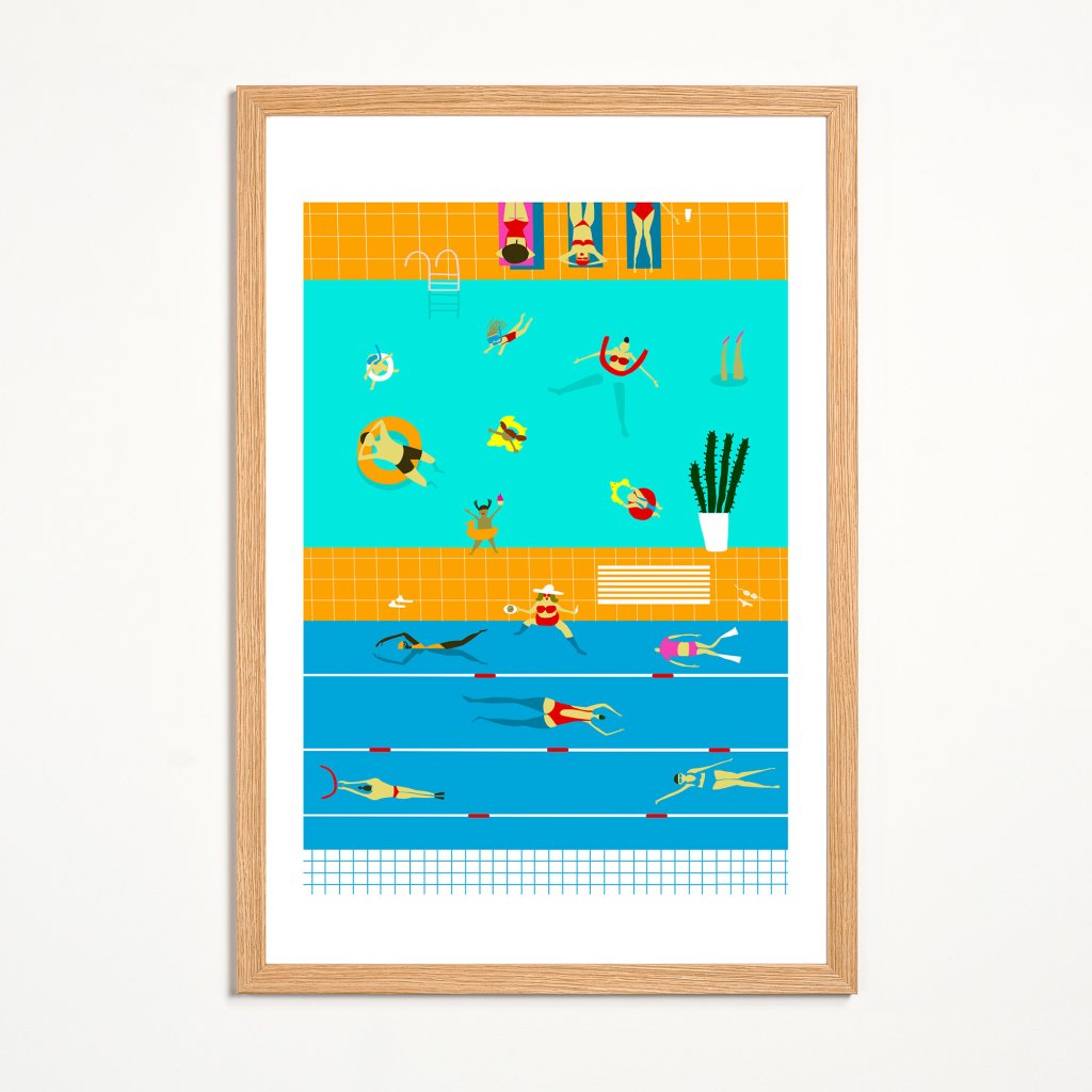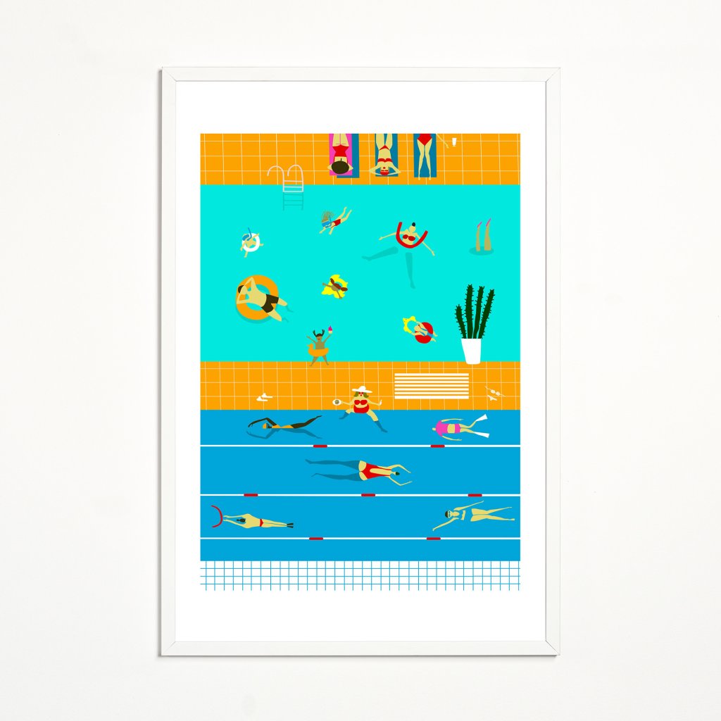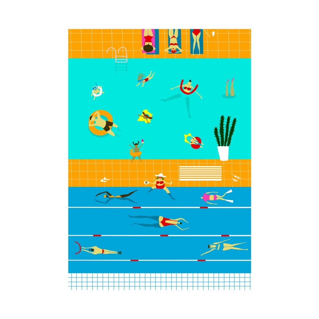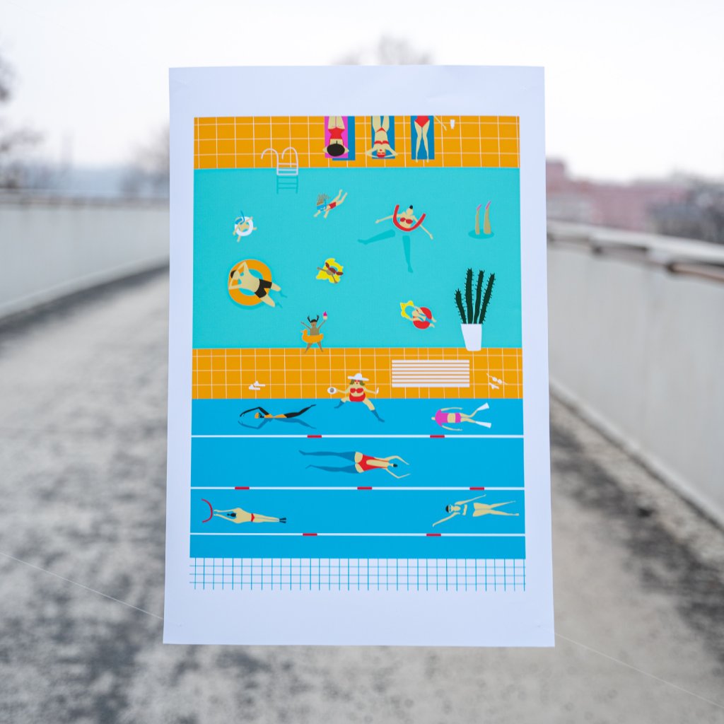 Tato okouzlující ilustrace ve „flat“ stylu nás přenáší do bezstarostného světa letních prázdnin, kde tyrkysová voda kontrastuje s teplou žlutou dlažbou. Scéna je plná drobných příběhů – od plavců v drahách přes relaxující postavy na lehátkách až po detaily jako kaktus či nafukovací kruhy. Čisté linie, geometrické zjednodušení a absence stínů dodávají obrazu vzhled, který připomíná stylizované plakáty z 50. let. Je to vizuální vitamin D, který bude fungovat i v tom nejpošmournějším dni.