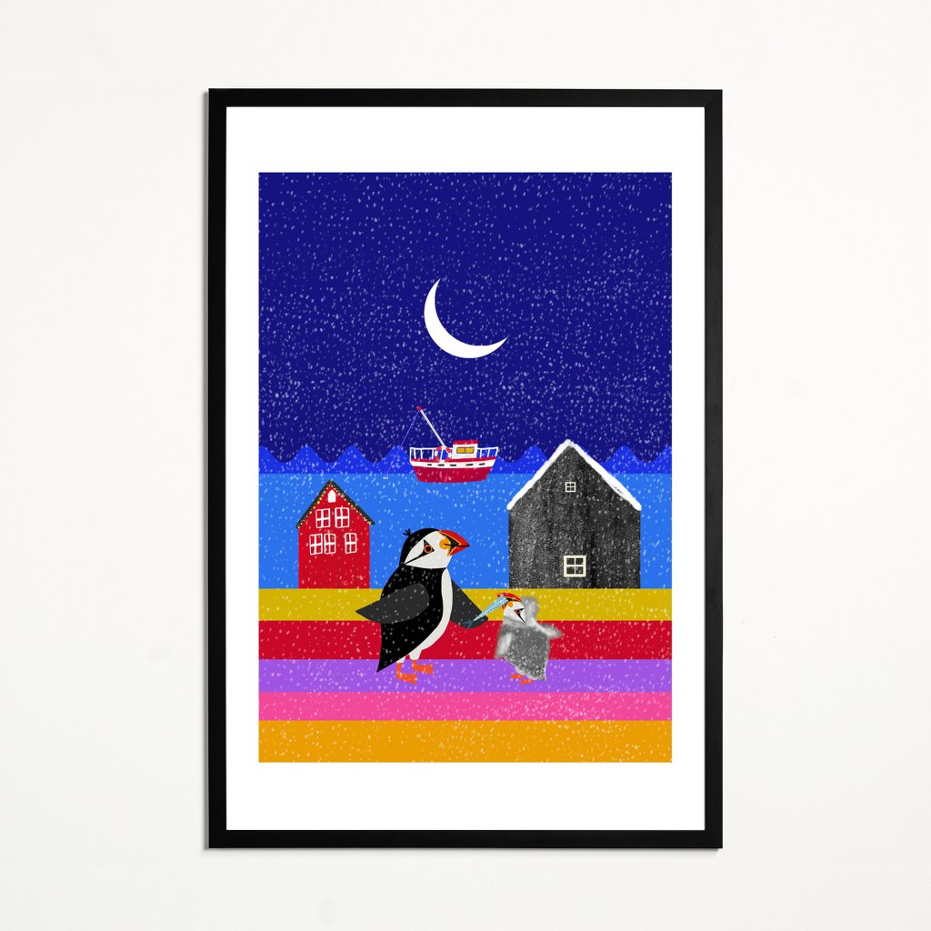 Scéna jako vystřižená ze severské pohádky zobrazuje noční krajinu, kde sytě modré nebe s měsícem kontrastuje s barevnými domky a hravě pruhovaným pobřežím. Ústředním motivem je láskyplné gesto dospělého papuchalka k mláděti, což obrazu dodává milé emoce a pocit rodinné sounáležitosti. Výtvarný styl kombinuje texturu připomínající sníh s jasnými, čistými barvami, díky čemuž působí moderně a zároveň tradičně hřejivě. Pro všechny, kdo chtějí svůj interiér zútulnit kouskem čisté radosti.